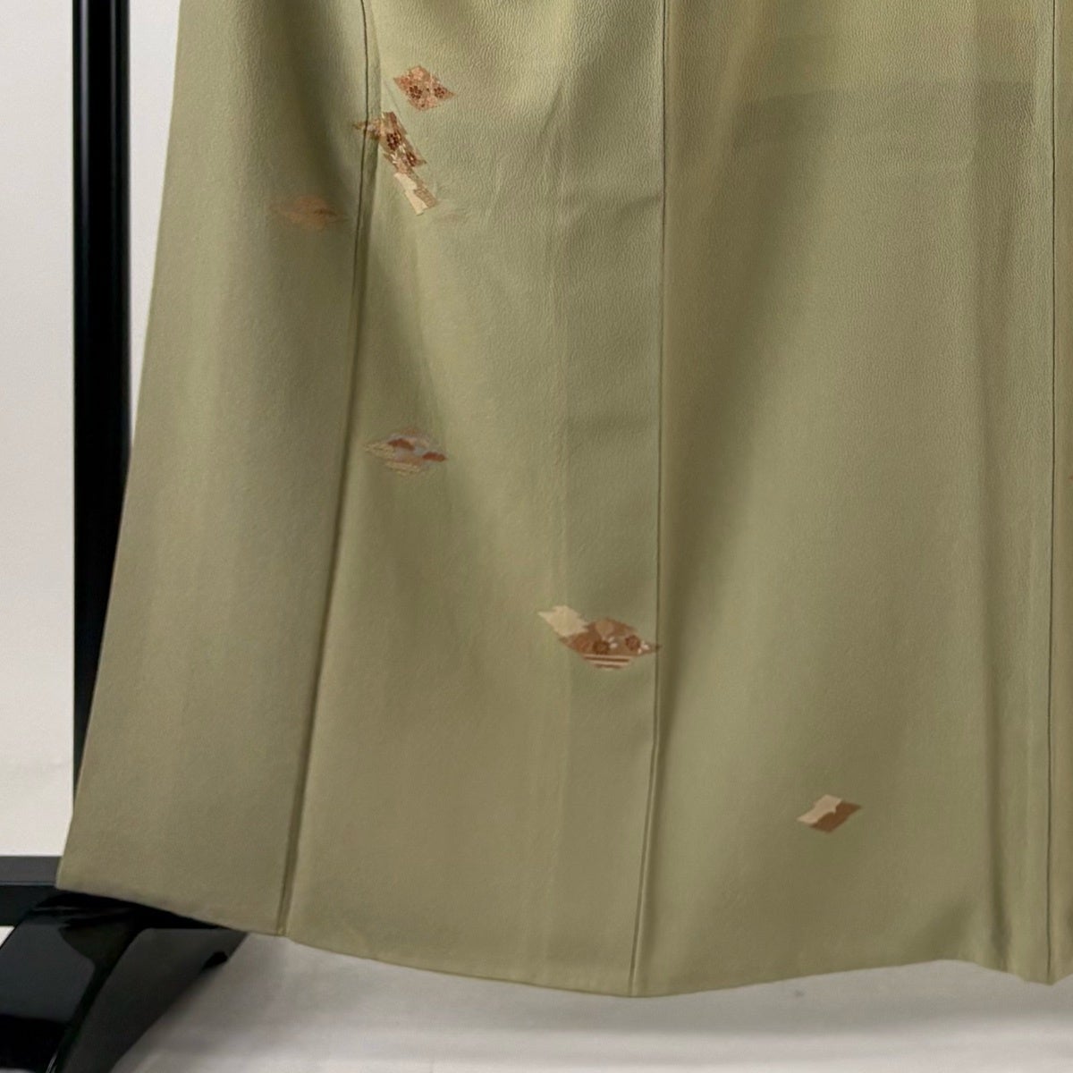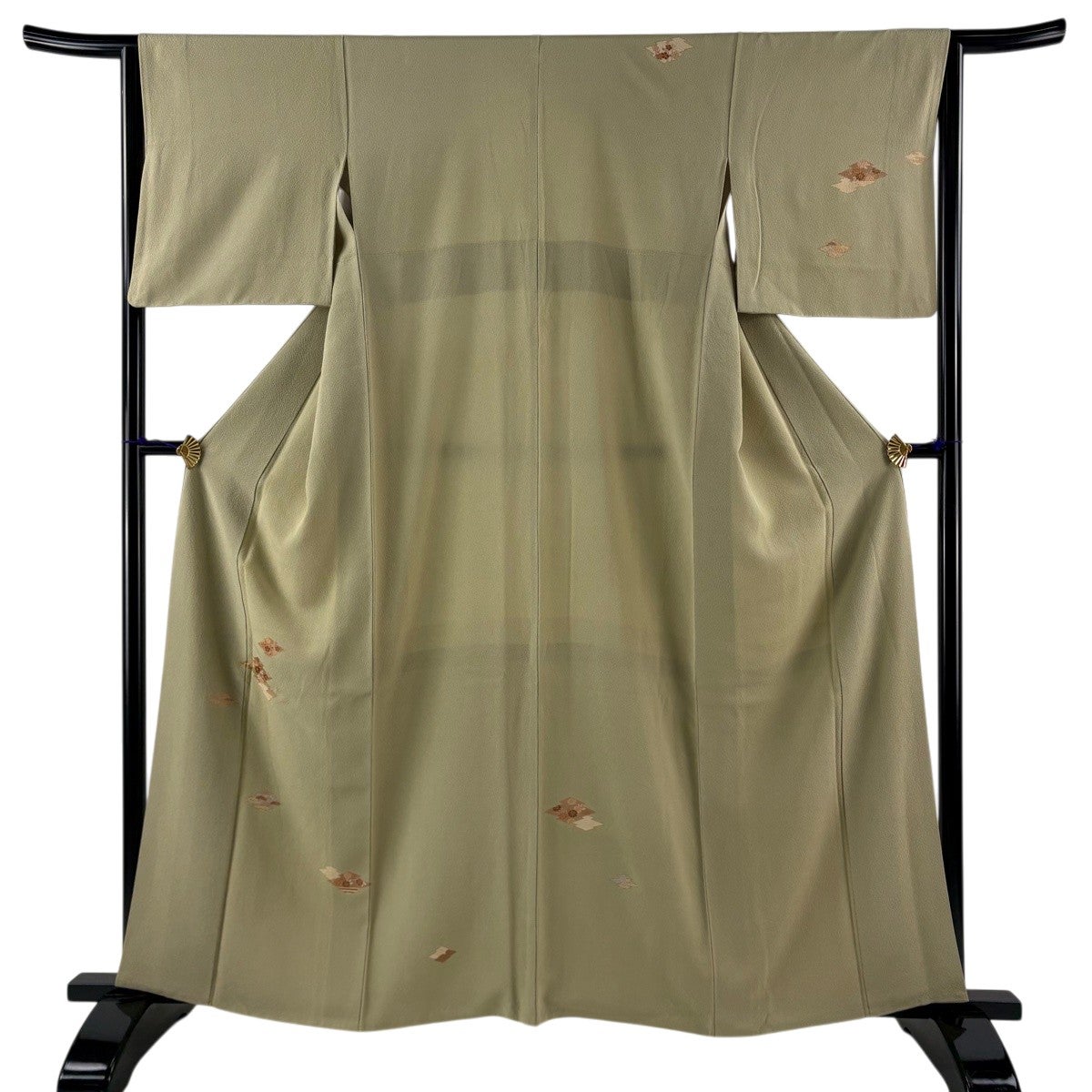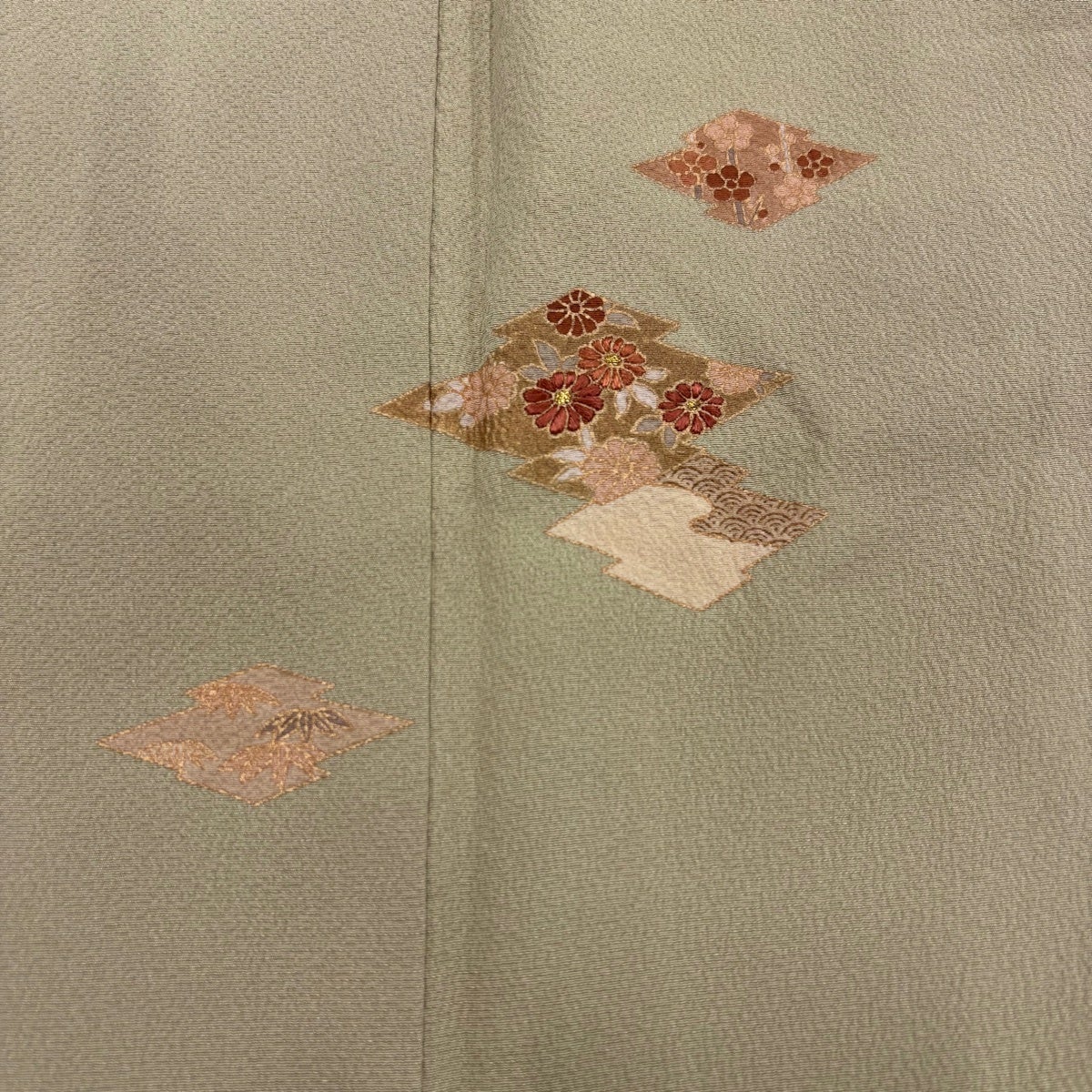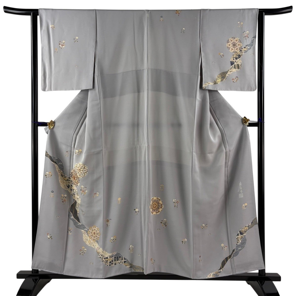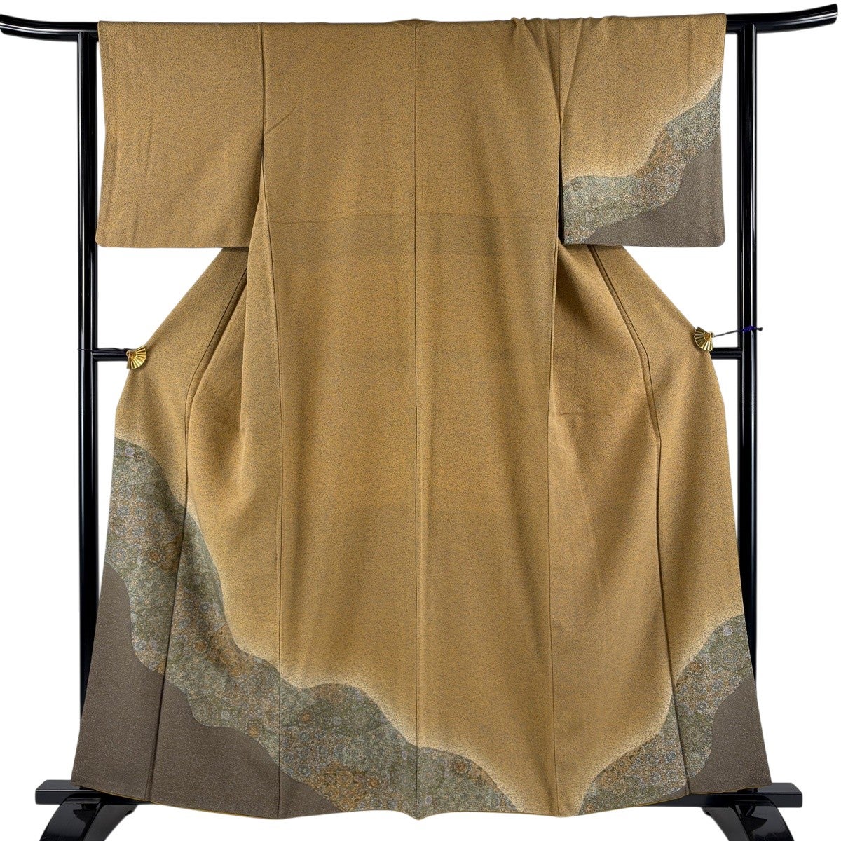 付け下げは訪問着を簡略化した訪問着より格が低くで小紋より格の高いの着物です。 特徴としては仕立て方の違いから訪問着などの一度真っさらな反物を着物の形に仮仕立てした後に柄付けをする絵羽模様とは違い、反物の状態で着用した時に柄付けが全て上を向くように書く事により左右の身頃や肩から袖にかけての模様が繋がっていない事です。 付け下げの歴史は他の着物に比べ浅く、戦時下に華美な訪問着が禁止された事で生まれた着物で、その後訪問着に比べ比較的安価で、それでいて着用シーンも訪問着とほぼ変わらないため大変好評になり、付け下げ訪問着と呼ばれる華やかな柄付けのものも考案された事により普及していきました。