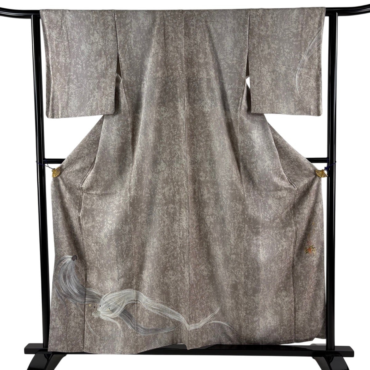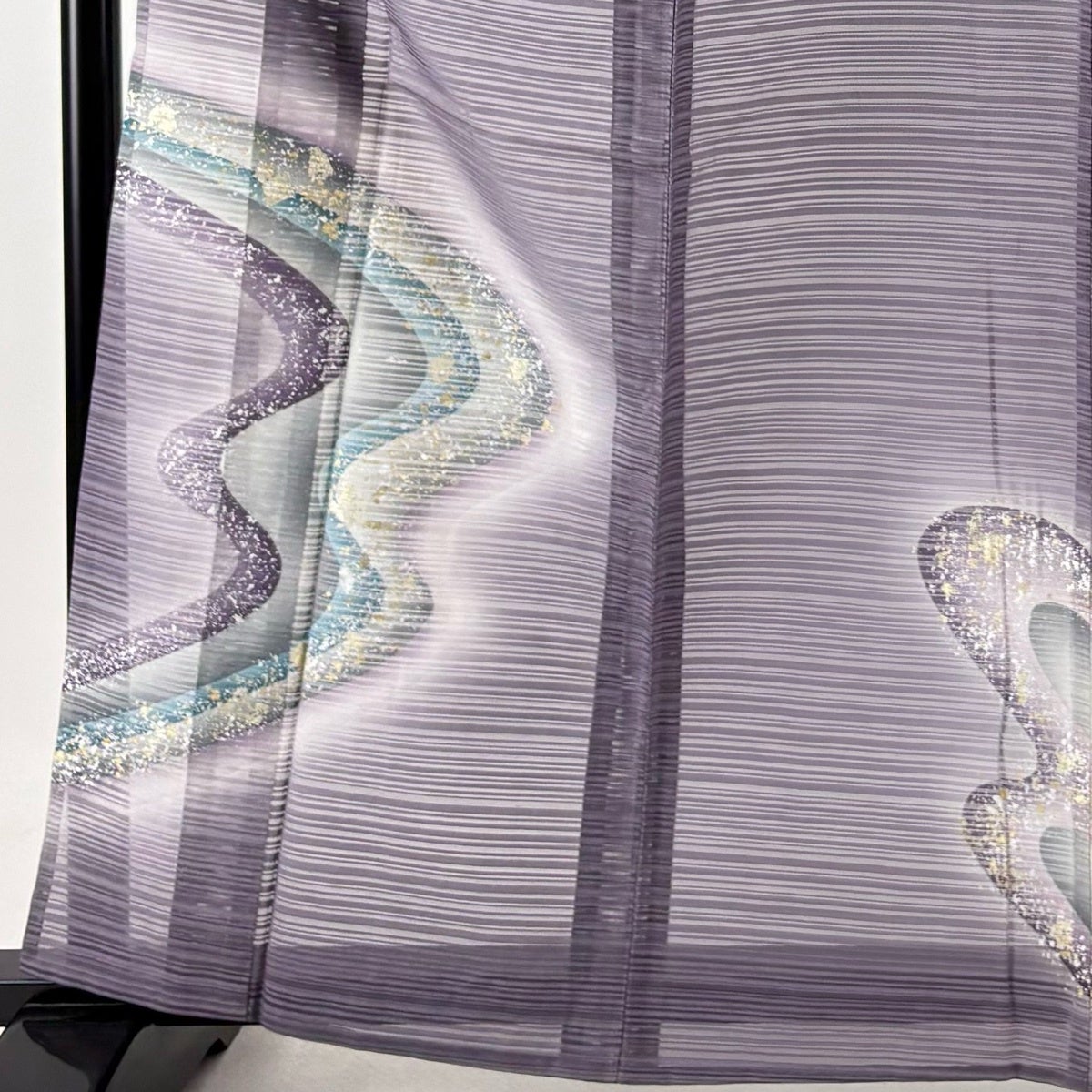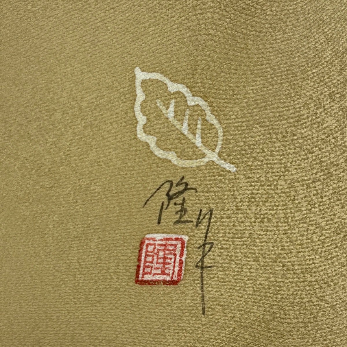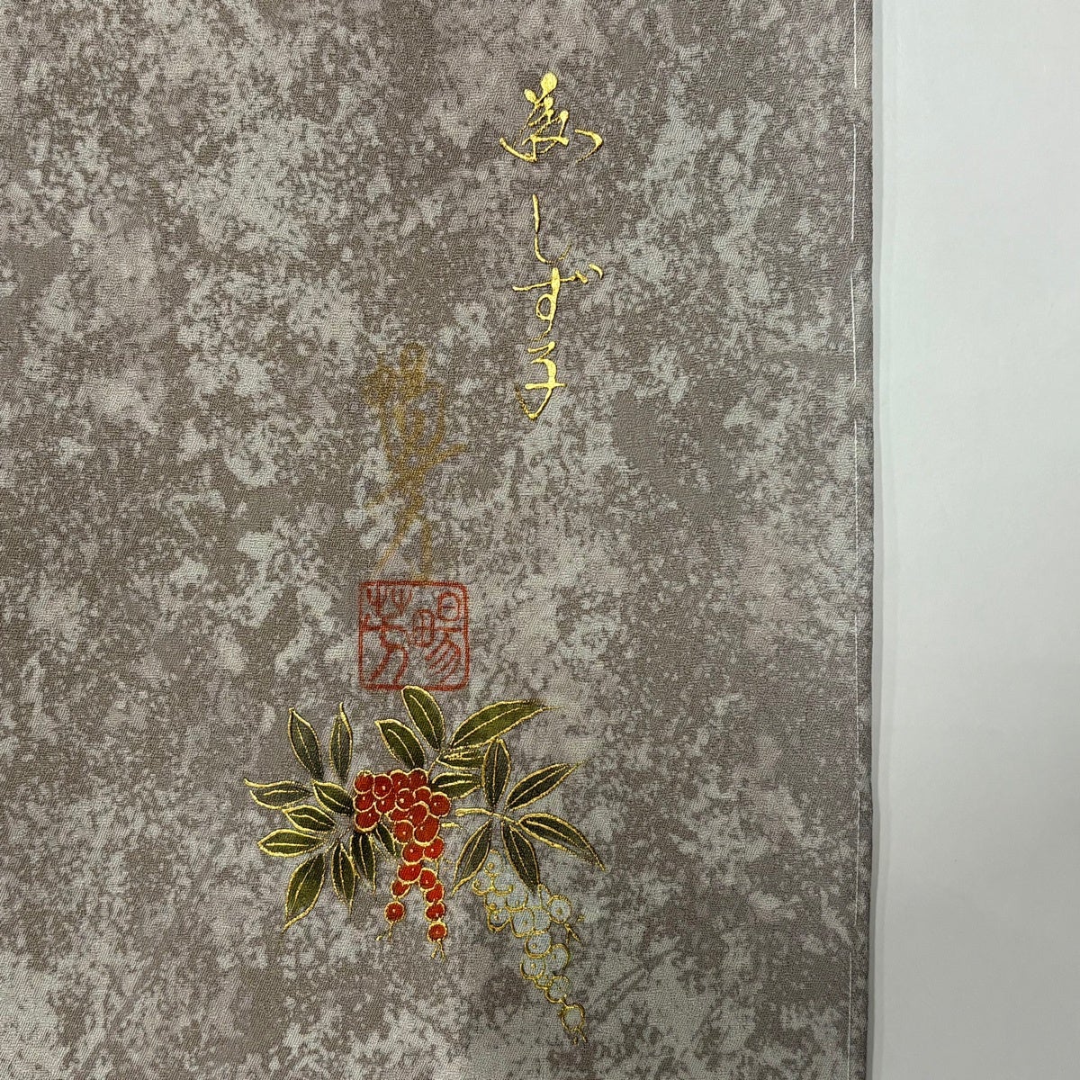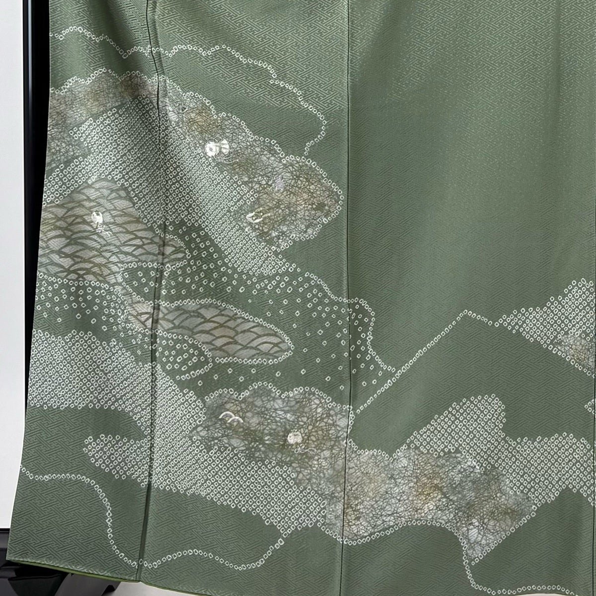 付け下げは訪問着を簡略化した訪問着より格が低くで小紋より格の高いの着物です。 特徴としては仕立て方の違いから訪問着などの一度真っさらな反物を着物の形に仮仕立てした後に柄付けをする絵羽模様とは違い、反物の状態で着用した時に柄付けが全て上を向くように書く事により左右の身頃や肩から袖にかけての模様が繋がっていない事です。 付け下げの歴史は他の着物に比べ浅く、戦時下に華美な訪問着が禁止された事で生まれた着物で、その後訪問着に比べ比較的安価で、それでいて着用シーンも訪問着とほぼ変わらないため大変好評になり、付け下げ訪問着と呼ばれる華やかな柄付けのものも考案された事により普及していきました。