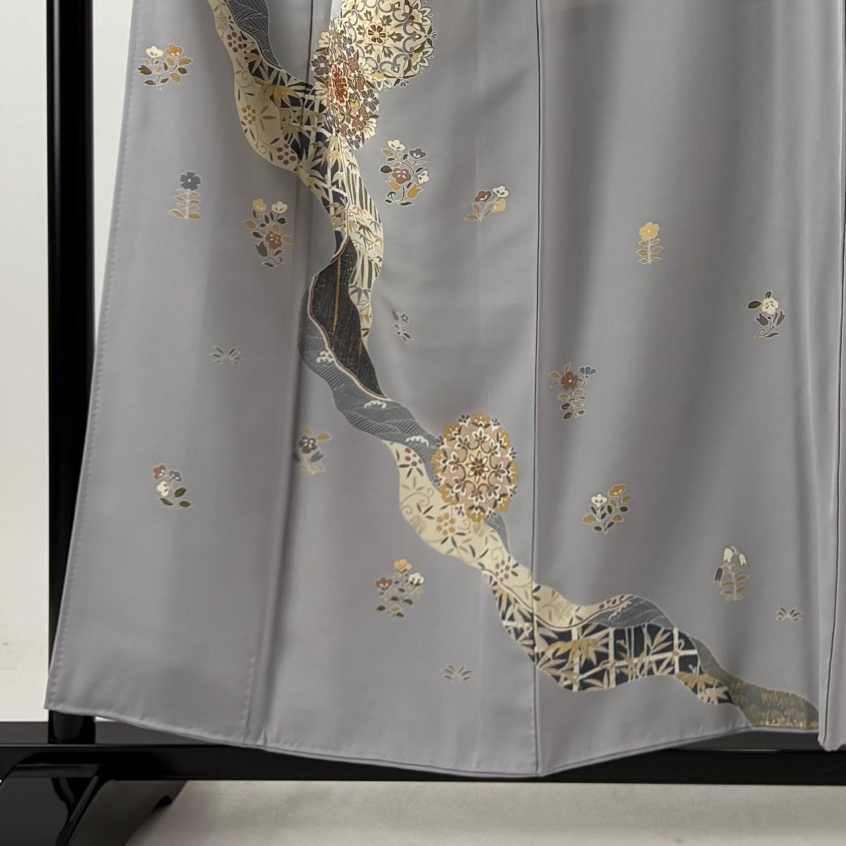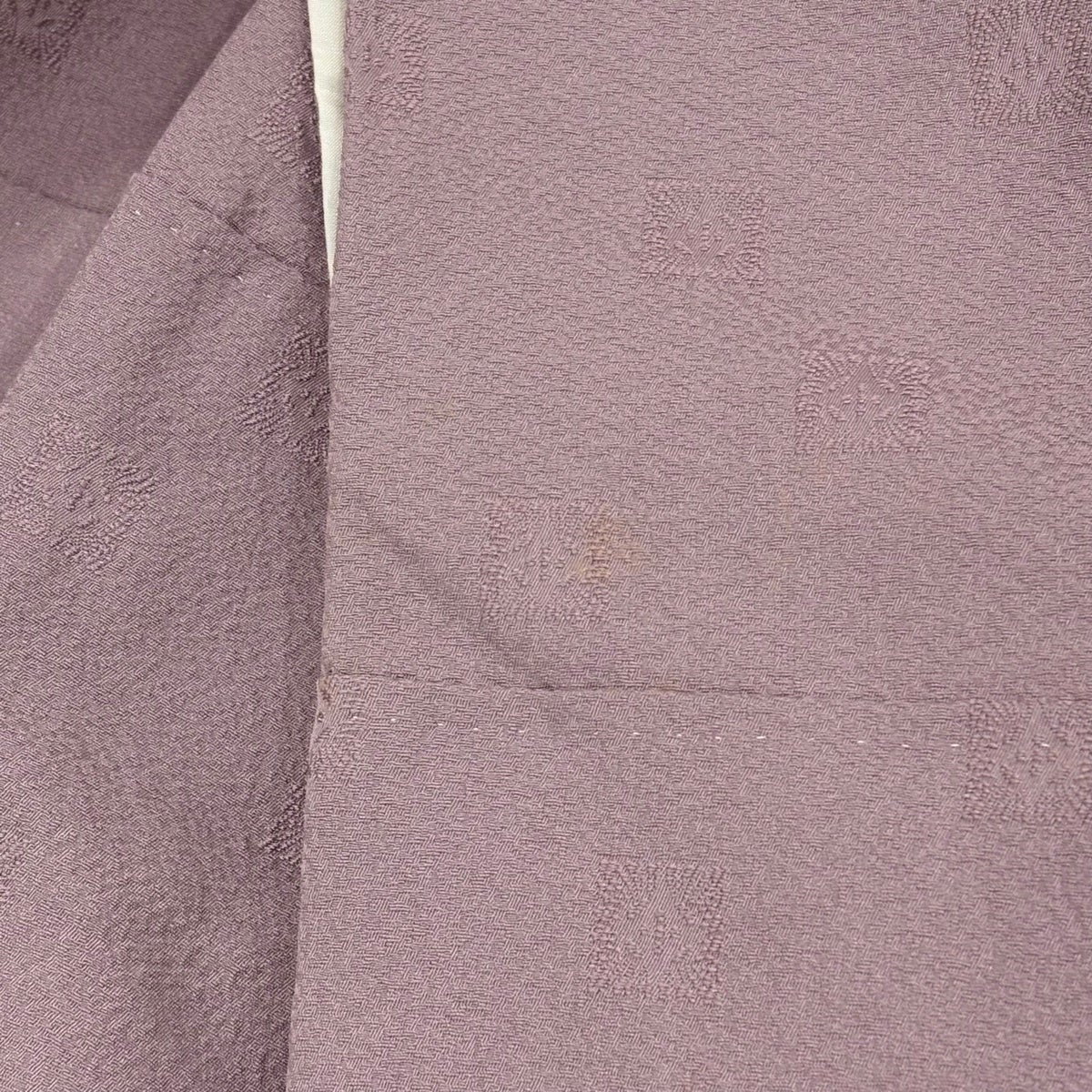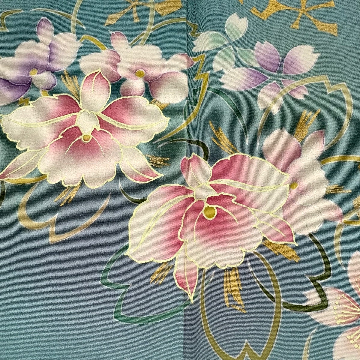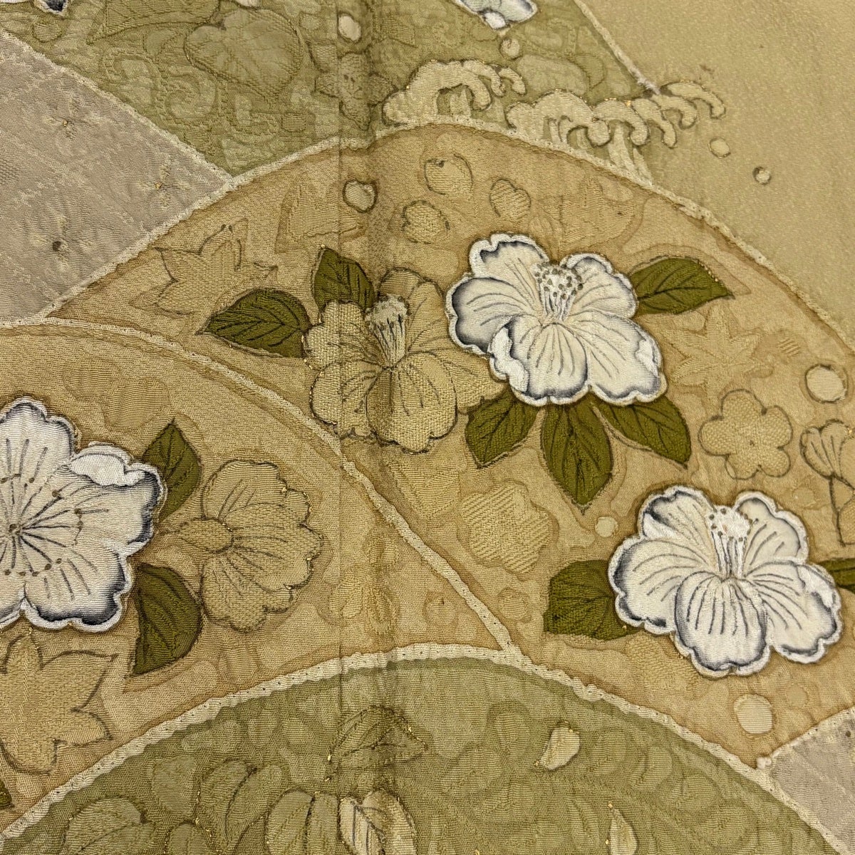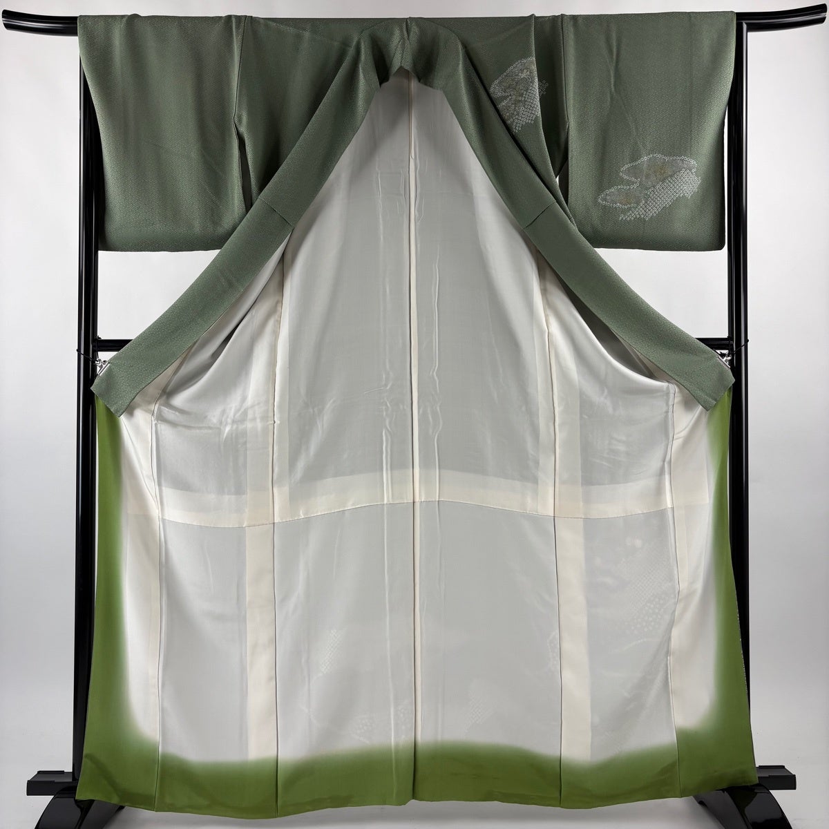 付け下げは訪問着を簡略化した訪問着より格が低くで小紋より格の高いの着物です。 特徴としては仕立て方の違いから訪問着などの一度真っさらな反物を着物の形に仮仕立てした後に柄付けをする絵羽模様とは違い、反物の状態で着用した時に柄付けが全て上を向くように書く事により左右の身頃や肩から袖にかけての模様が繋がっていない事です。 付け下げの歴史は他の着物に比べ浅く、戦時下に華美な訪問着が禁止された事で生まれた着物で、その後訪問着に比べ比較的安価で、それでいて着用シーンも訪問着とほぼ変わらないため大変好評になり、付け下げ訪問着と呼ばれる華やかな柄付けのものも考案された事により普及していきました。