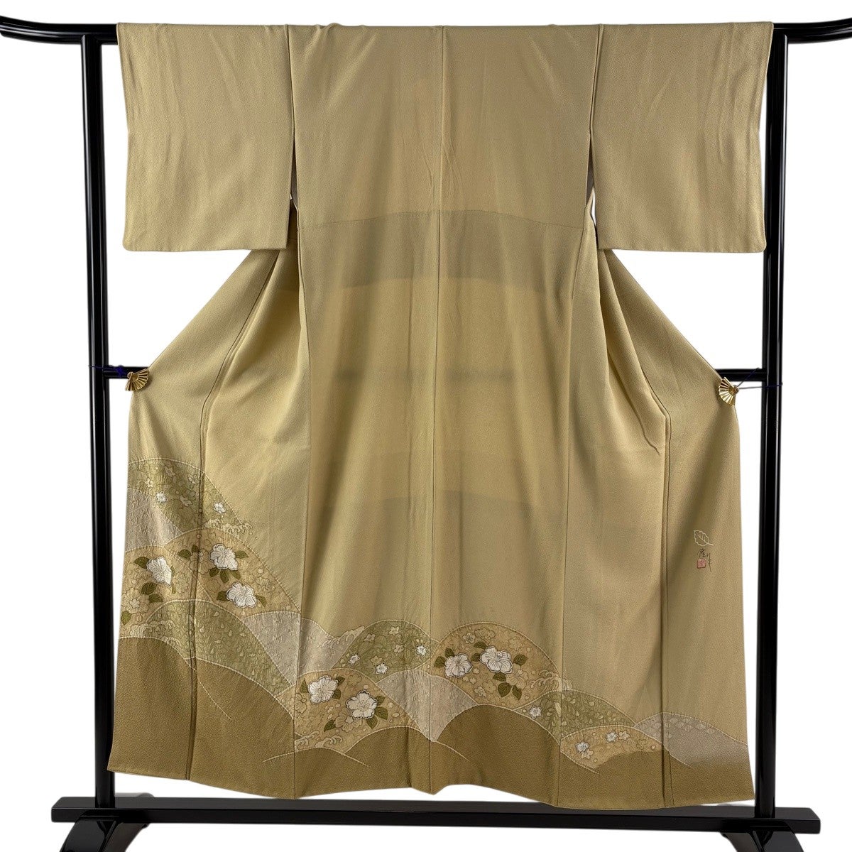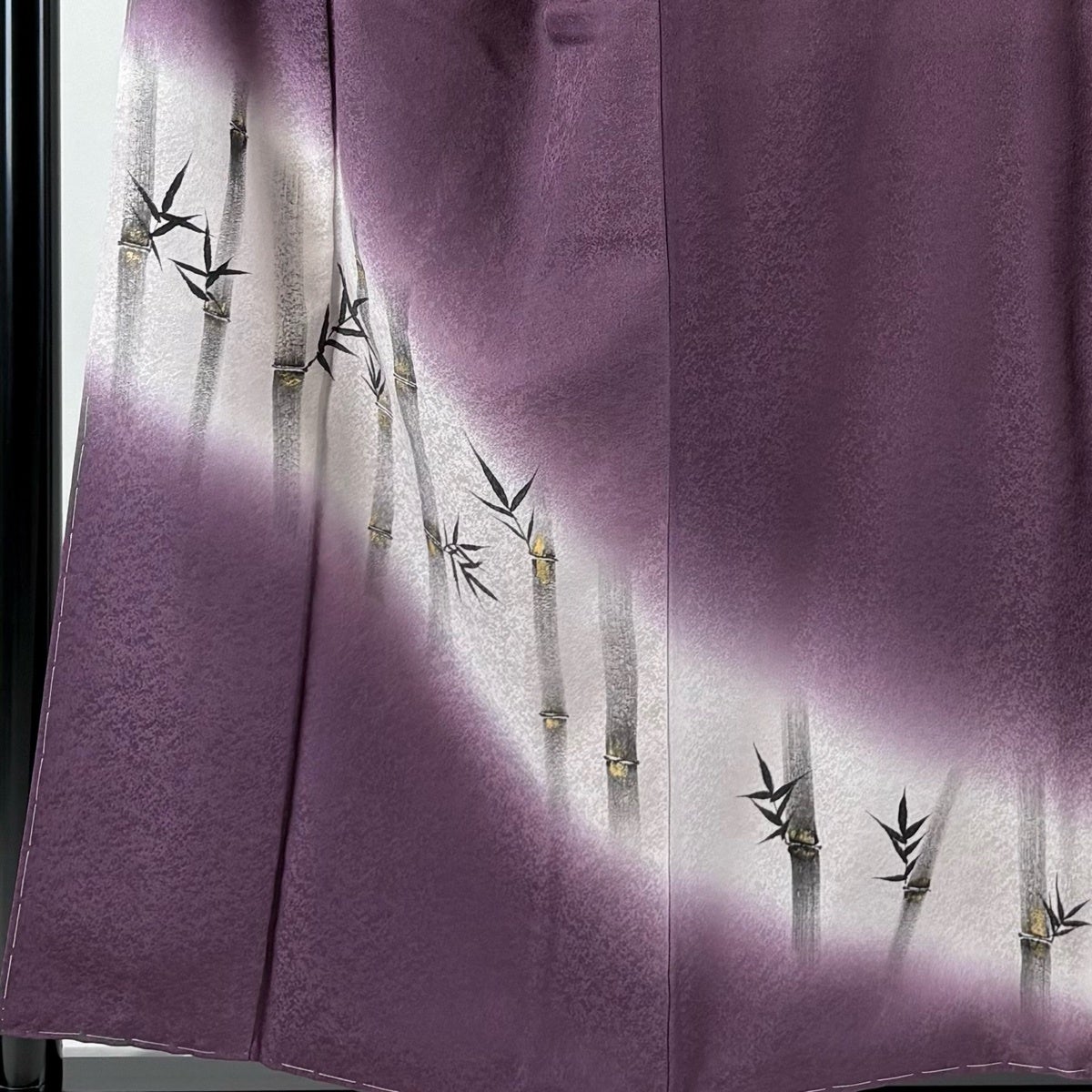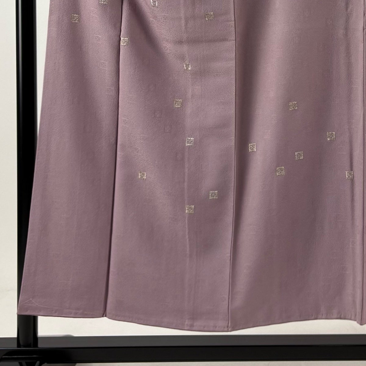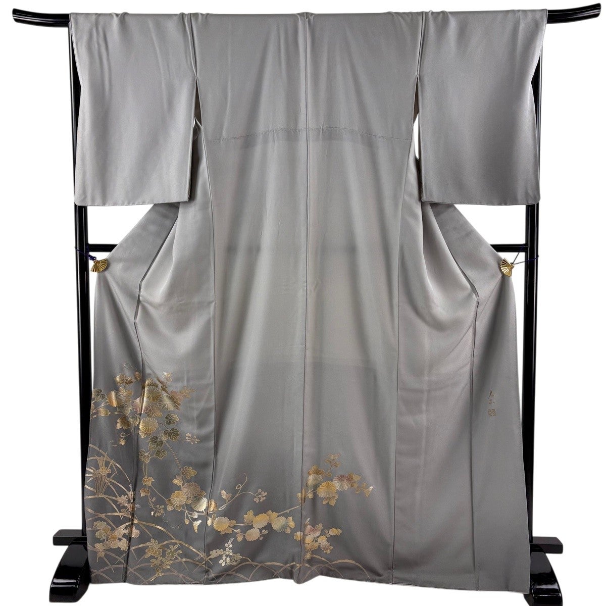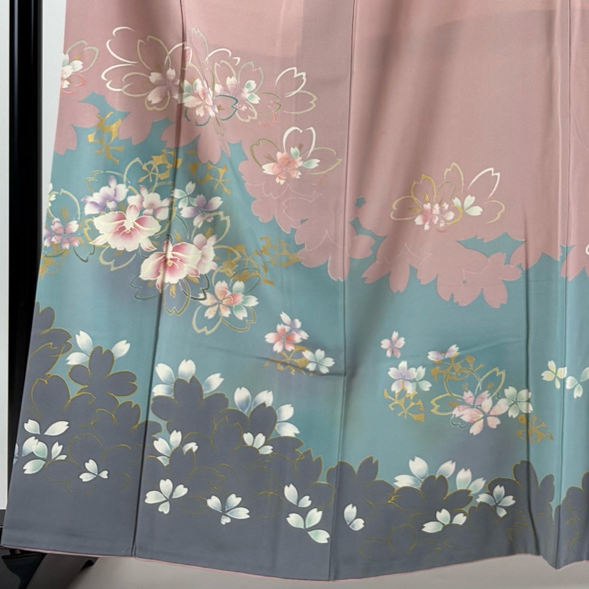 付け下げは訪問着を簡略化した訪問着より格が低くで小紋より格の高いの着物です。 特徴としては仕立て方の違いから訪問着などの一度真っさらな反物を着物の形に仮仕立てした後に柄付けをする絵羽模様とは違い、反物の状態で着用した時に柄付けが全て上を向くように書く事により左右の身頃や肩から袖にかけての模様が繋がっていない事です。 付け下げの歴史は他の着物に比べ浅く、戦時下に華美な訪問着が禁止された事で生まれた着物で、その後訪問着に比べ比較的安価で、それでいて着用シーンも訪問着とほぼ変わらないため大変好評になり、付け下げ訪問着と呼ばれる華やかな柄付けのものも考案された事により普及していきました。
