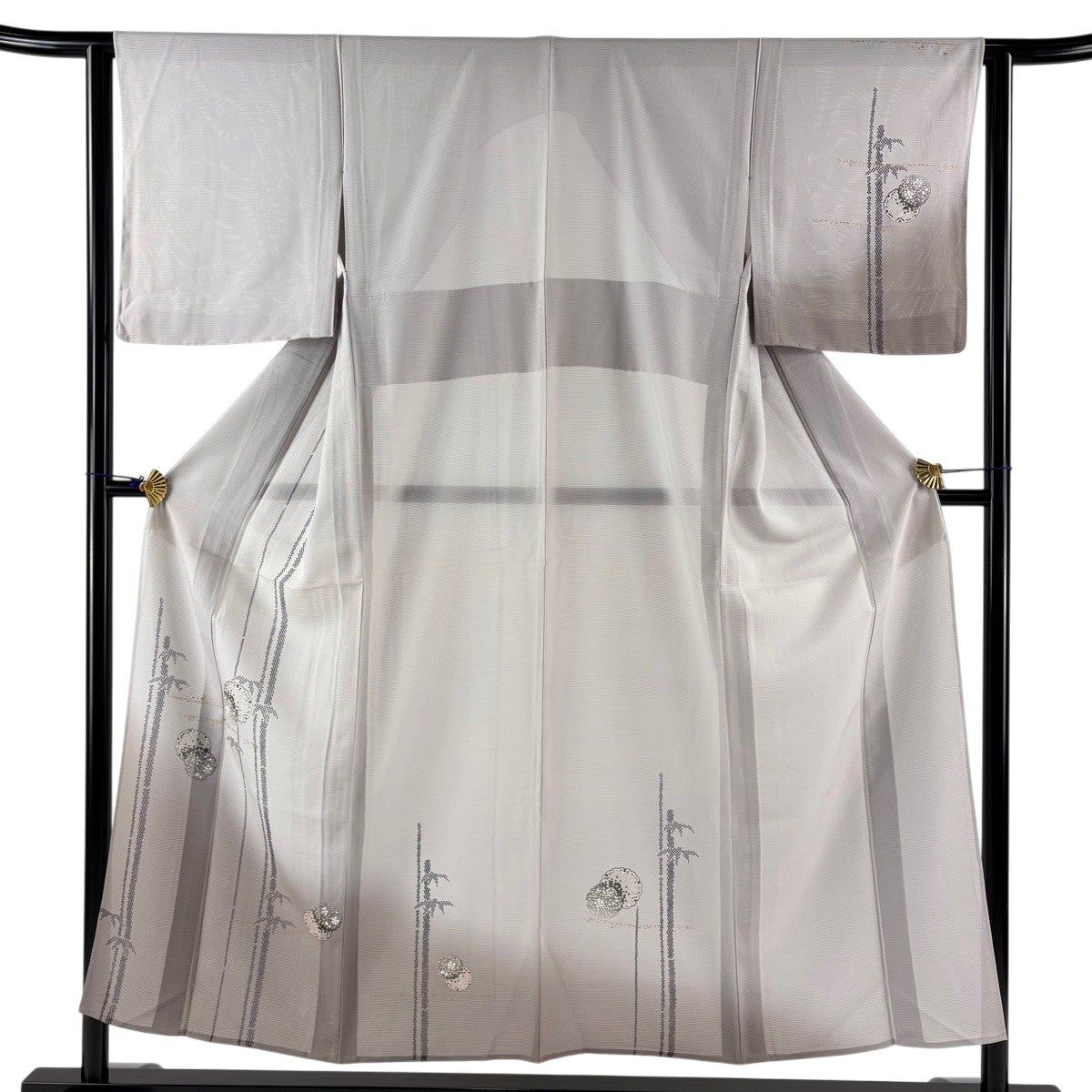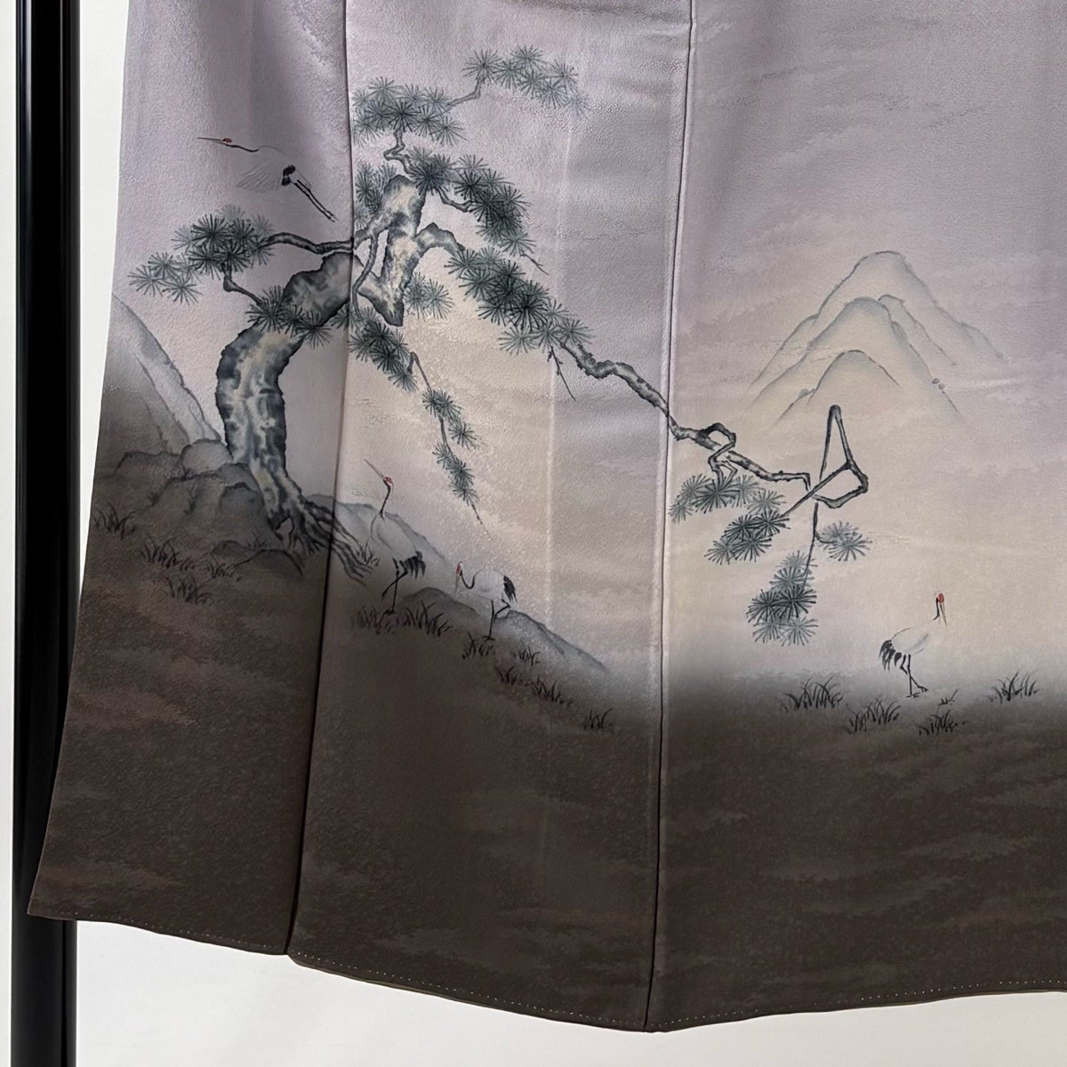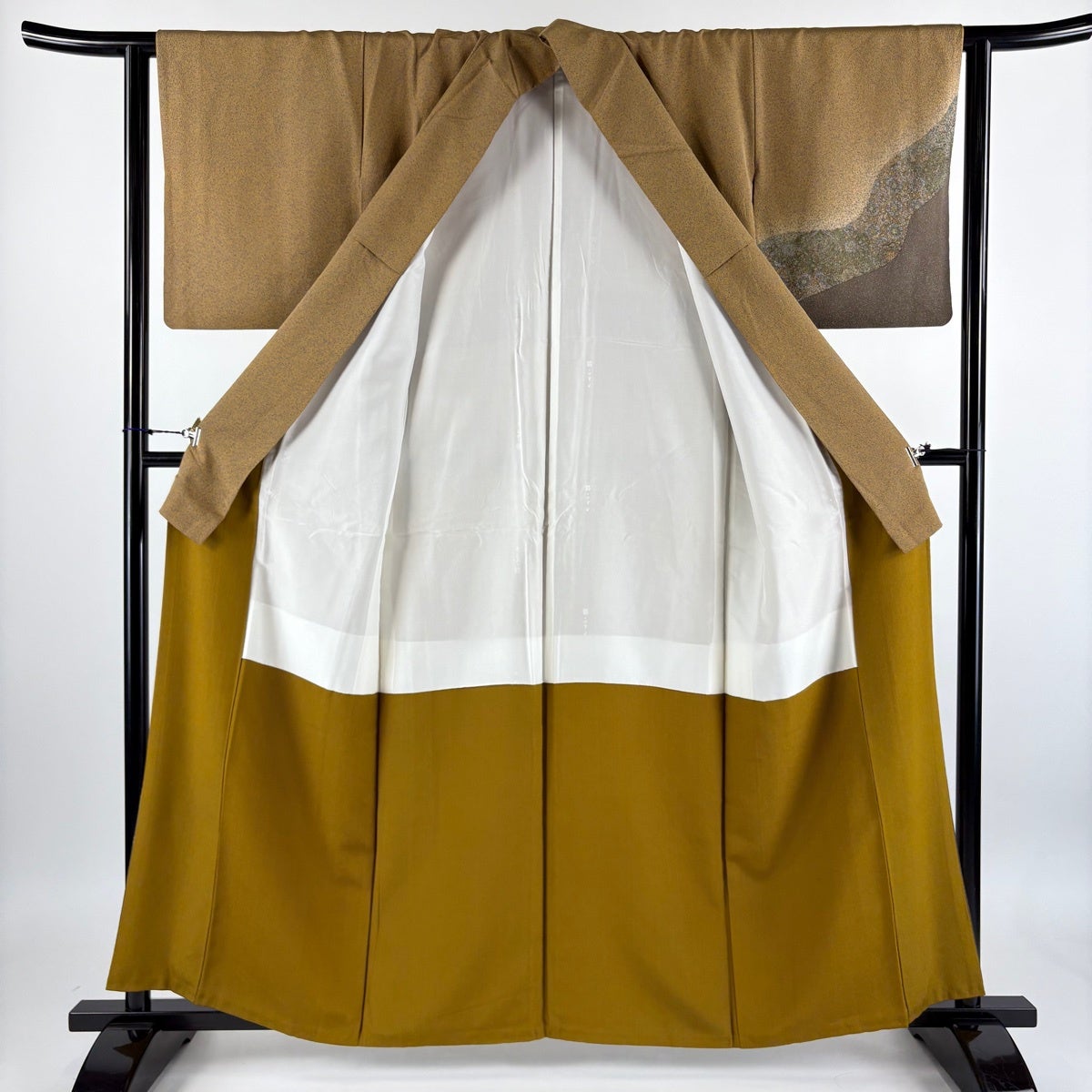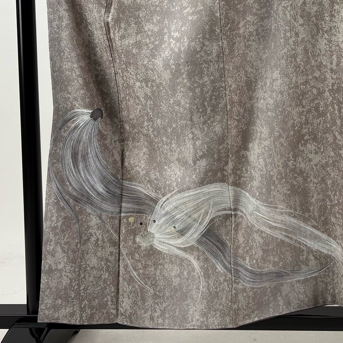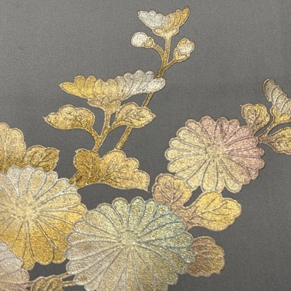 付け下げは訪問着を簡略化した訪問着より格が低くで小紋より格の高いの着物です。 特徴としては仕立て方の違いから訪問着などの一度真っさらな反物を着物の形に仮仕立てした後に柄付けをする絵羽模様とは違い、反物の状態で着用した時に柄付けが全て上を向くように書く事により左右の身頃や肩から袖にかけての模様が繋がっていない事です。 付け下げの歴史は他の着物に比べ浅く、戦時下に華美な訪問着が禁止された事で生まれた着物で、その後訪問着に比べ比較的安価で、それでいて着用シーンも訪問着とほぼ変わらないため大変好評になり、付け下げ訪問着と呼ばれる華やかな柄付けのものも考案された事により普及していきました。