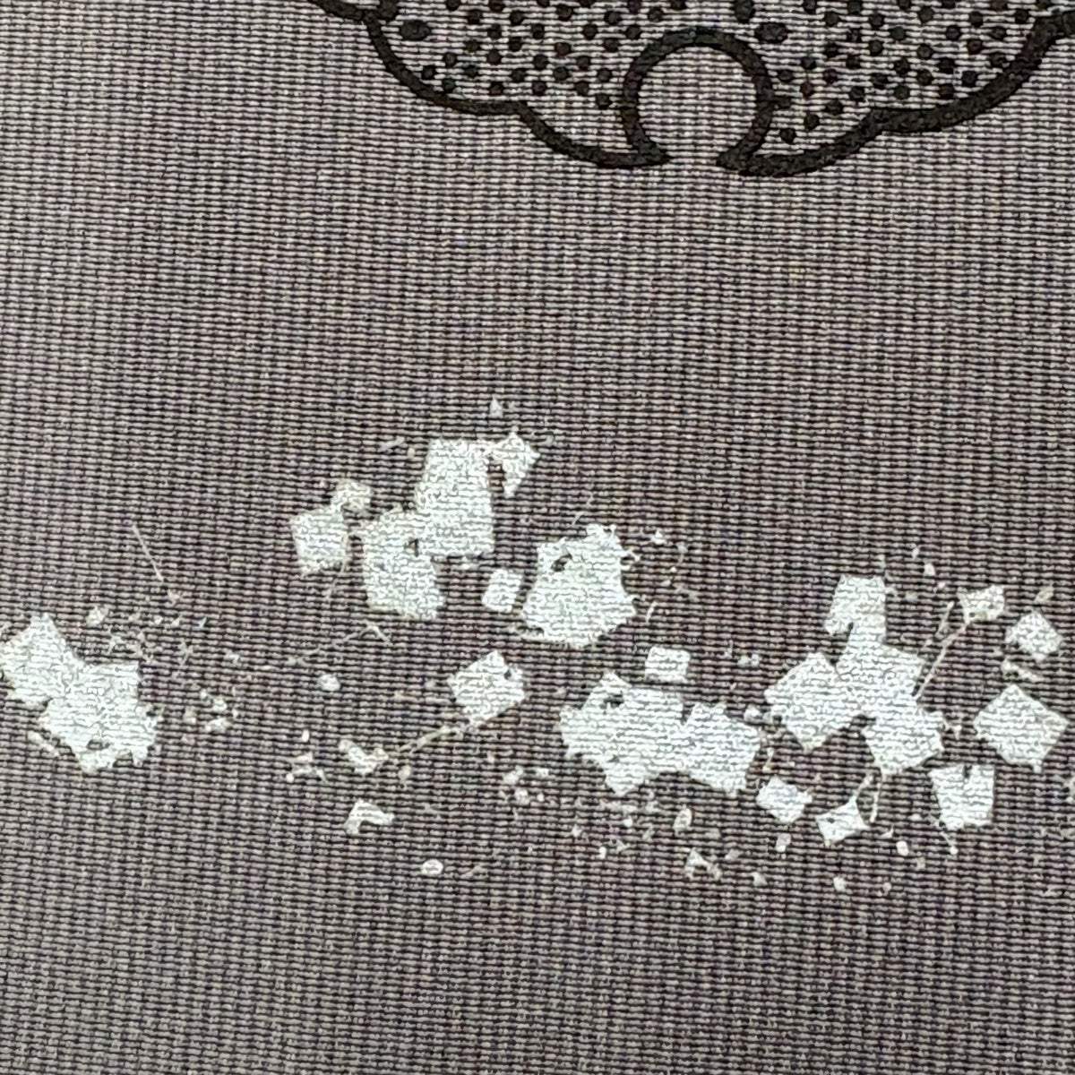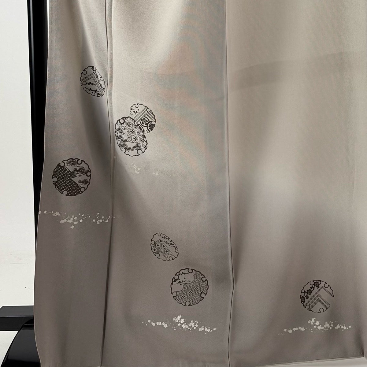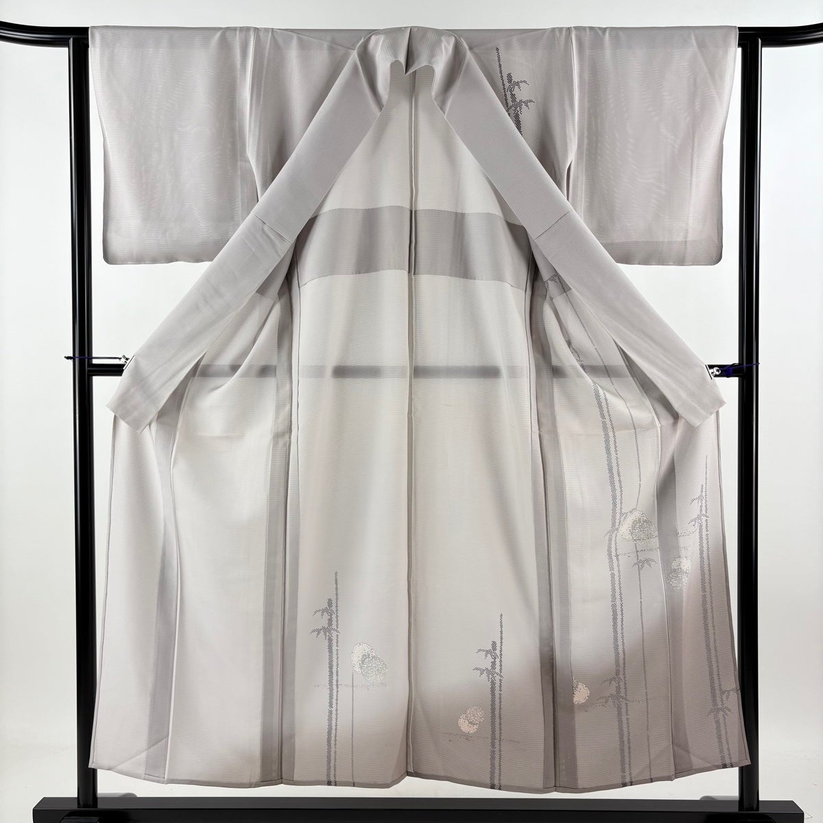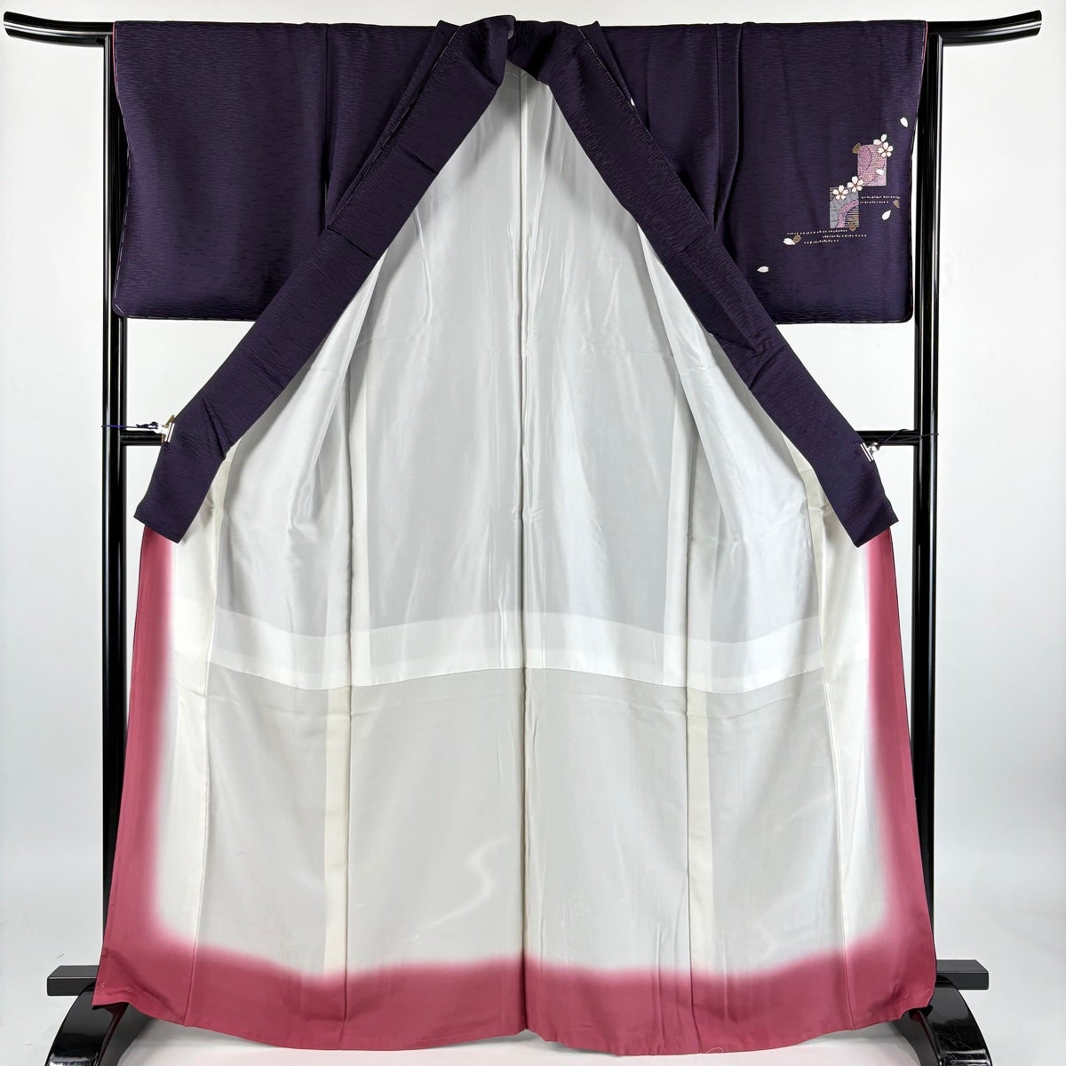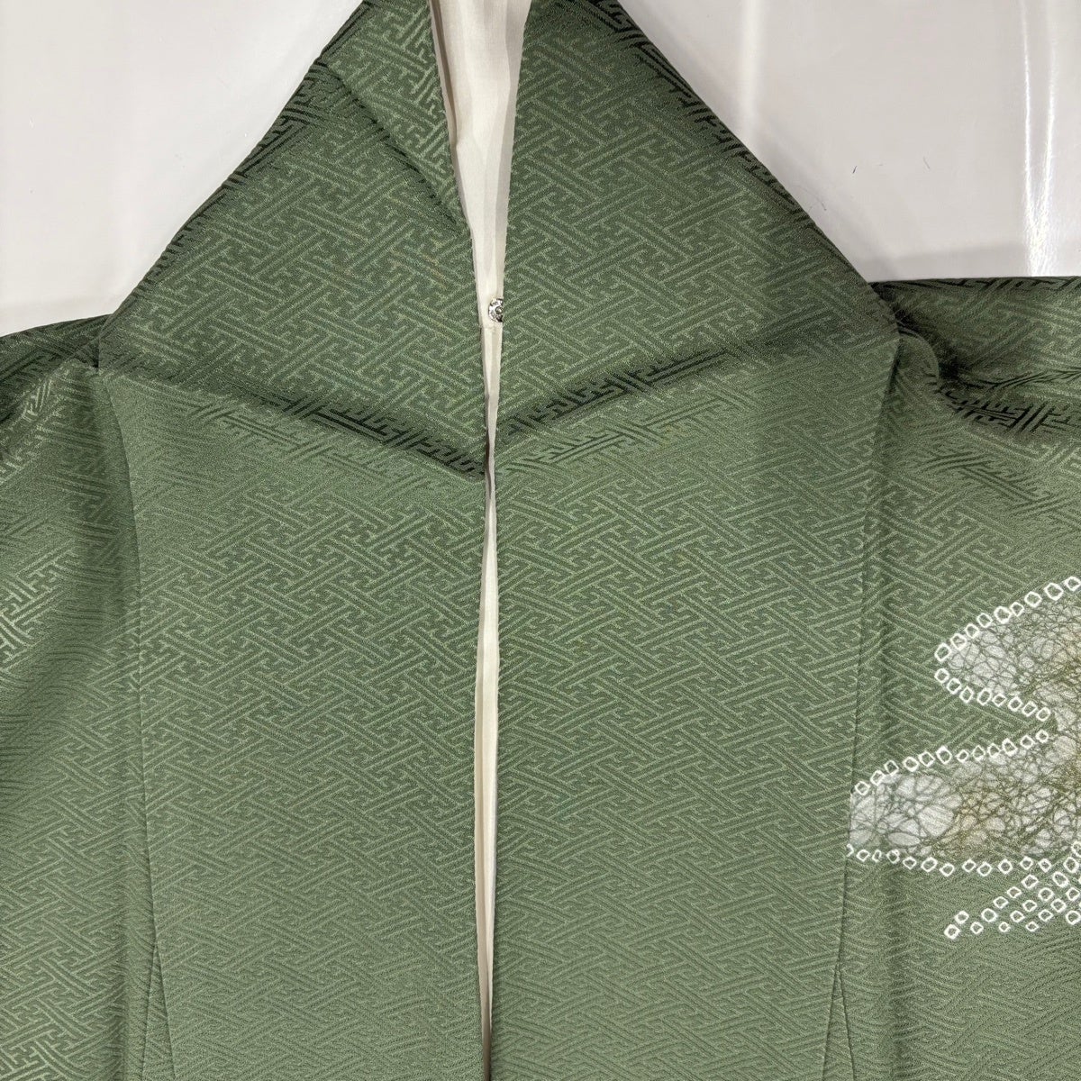付け下げは訪問着を簡略化した訪問着より格が低くで小紋より格の高いの着物です。 特徴としては仕立て方の違いから訪問着などの一度真っさらな反物を着物の形に仮仕立てした後に柄付けをする絵羽模様とは違い、反物の状態で着用した時に柄付けが全て上を向くように書く事により左右の身頃や肩から袖にかけての模様が繋がっていない事です。 付け下げの歴史は他の着物に比べ浅く、戦時下に華美な訪問着が禁止された事で生まれた着物で、その後訪問着に比べ比較的安価で、それでいて着用シーンも訪問着とほぼ変わらないため大変好評になり、付け下げ訪問着と呼ばれる華やかな柄付けのものも考案された事により普及していきました。