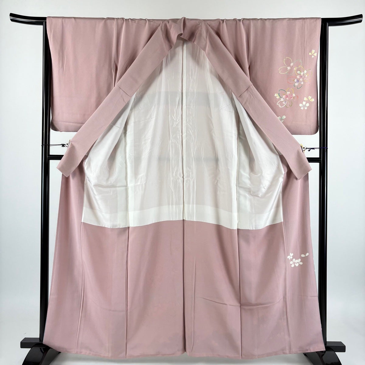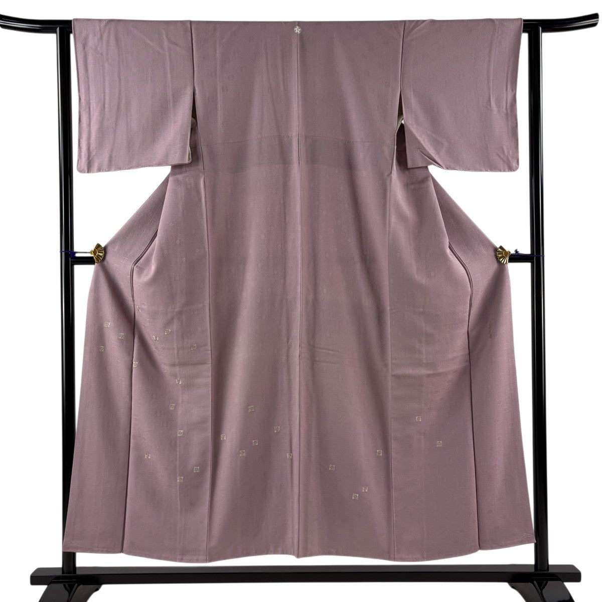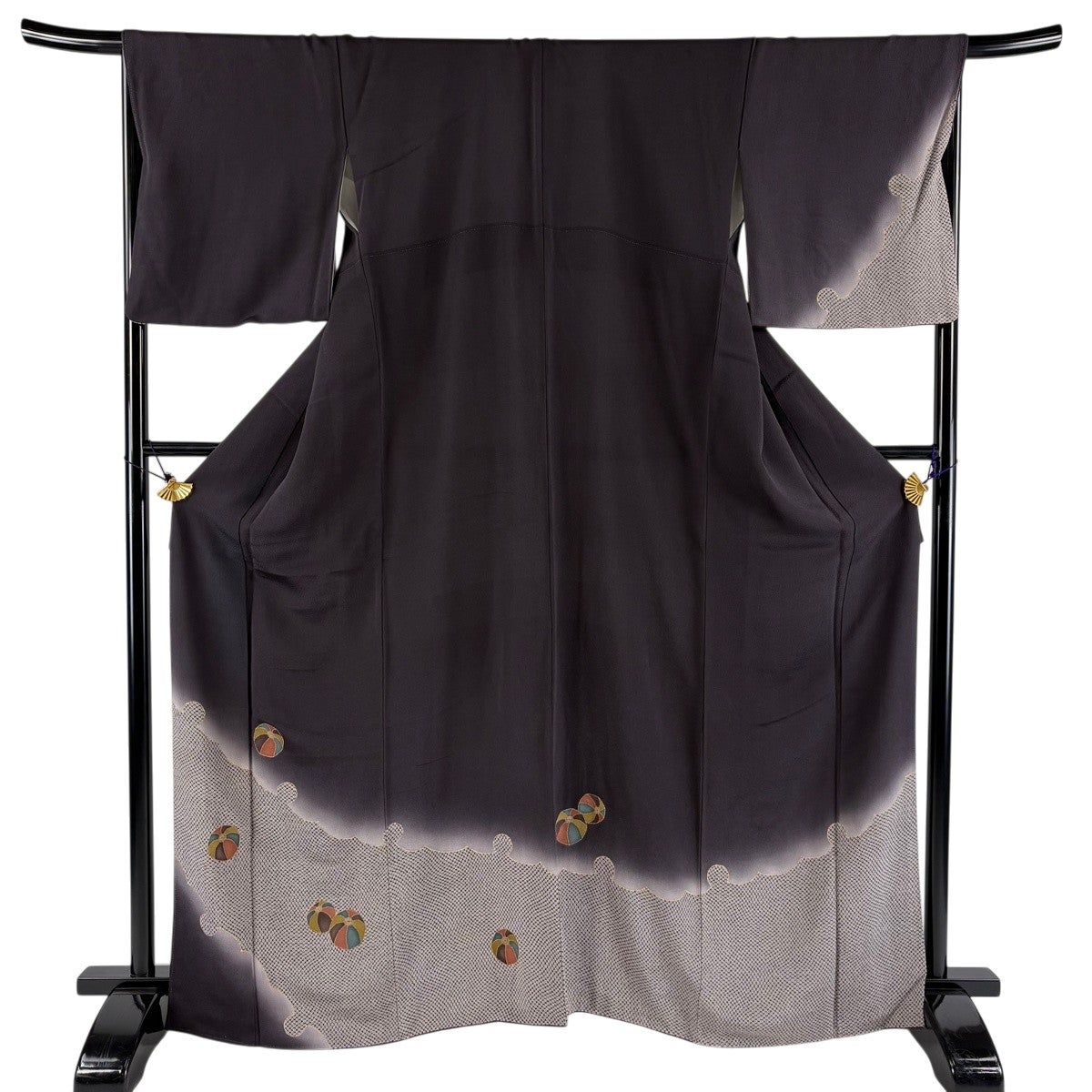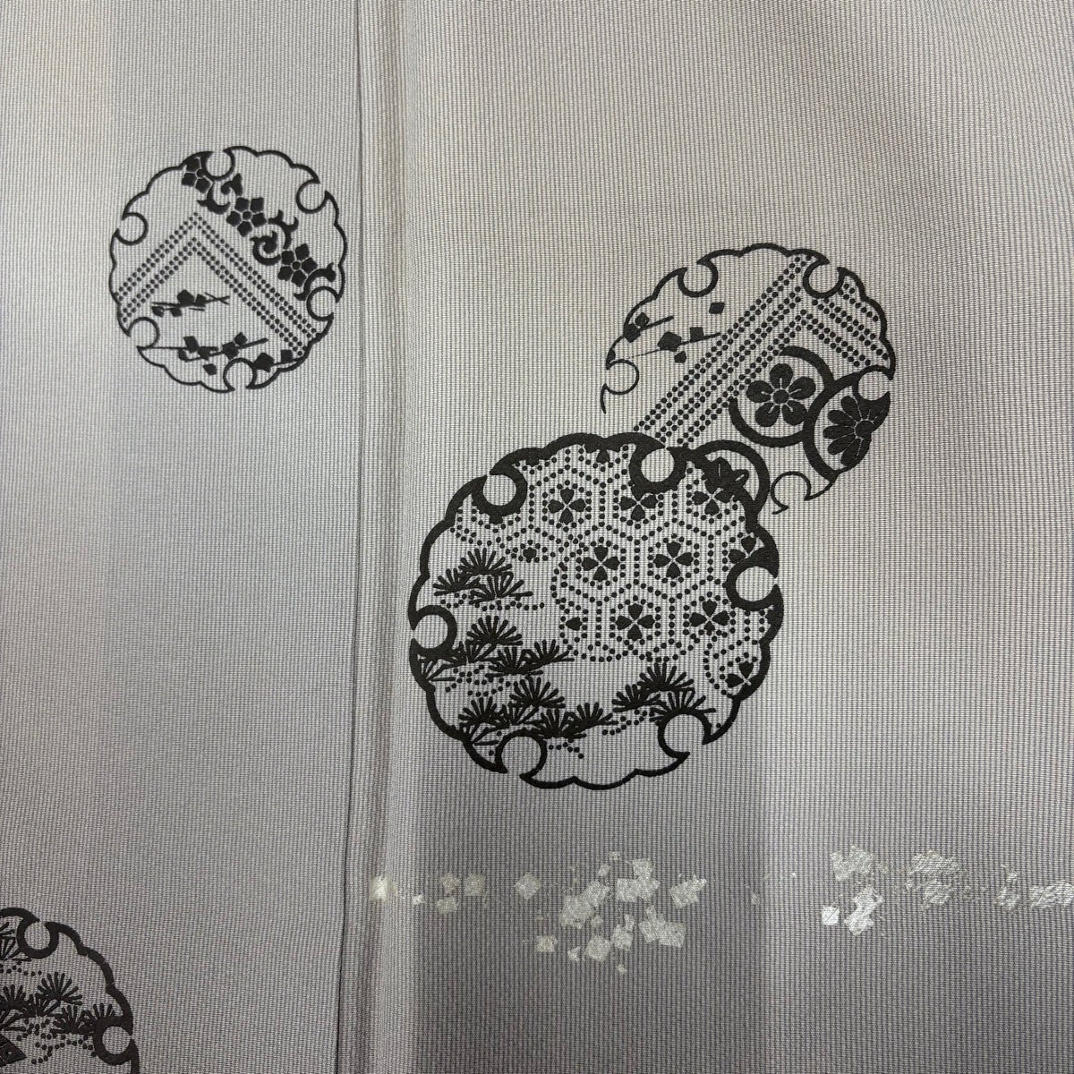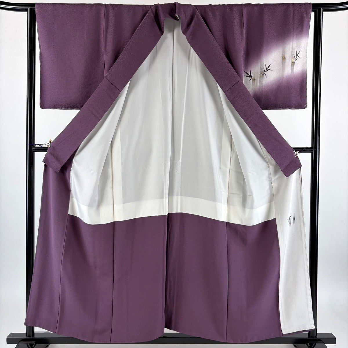 付け下げは訪問着を簡略化した訪問着より格が低くで小紋より格の高いの着物です。 特徴としては仕立て方の違いから訪問着などの一度真っさらな反物を着物の形に仮仕立てした後に柄付けをする絵羽模様とは違い、反物の状態で着用した時に柄付けが全て上を向くように書く事により左右の身頃や肩から袖にかけての模様が繋がっていない事です。 付け下げの歴史は他の着物に比べ浅く、戦時下に華美な訪問着が禁止された事で生まれた着物で、その後訪問着に比べ比較的安価で、それでいて着用シーンも訪問着とほぼ変わらないため大変好評になり、付け下げ訪問着と呼ばれる華やかな柄付けのものも考案された事により普及していきました。