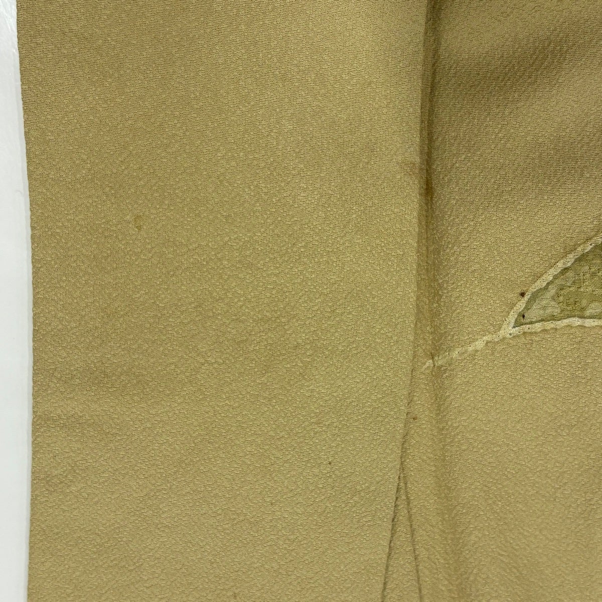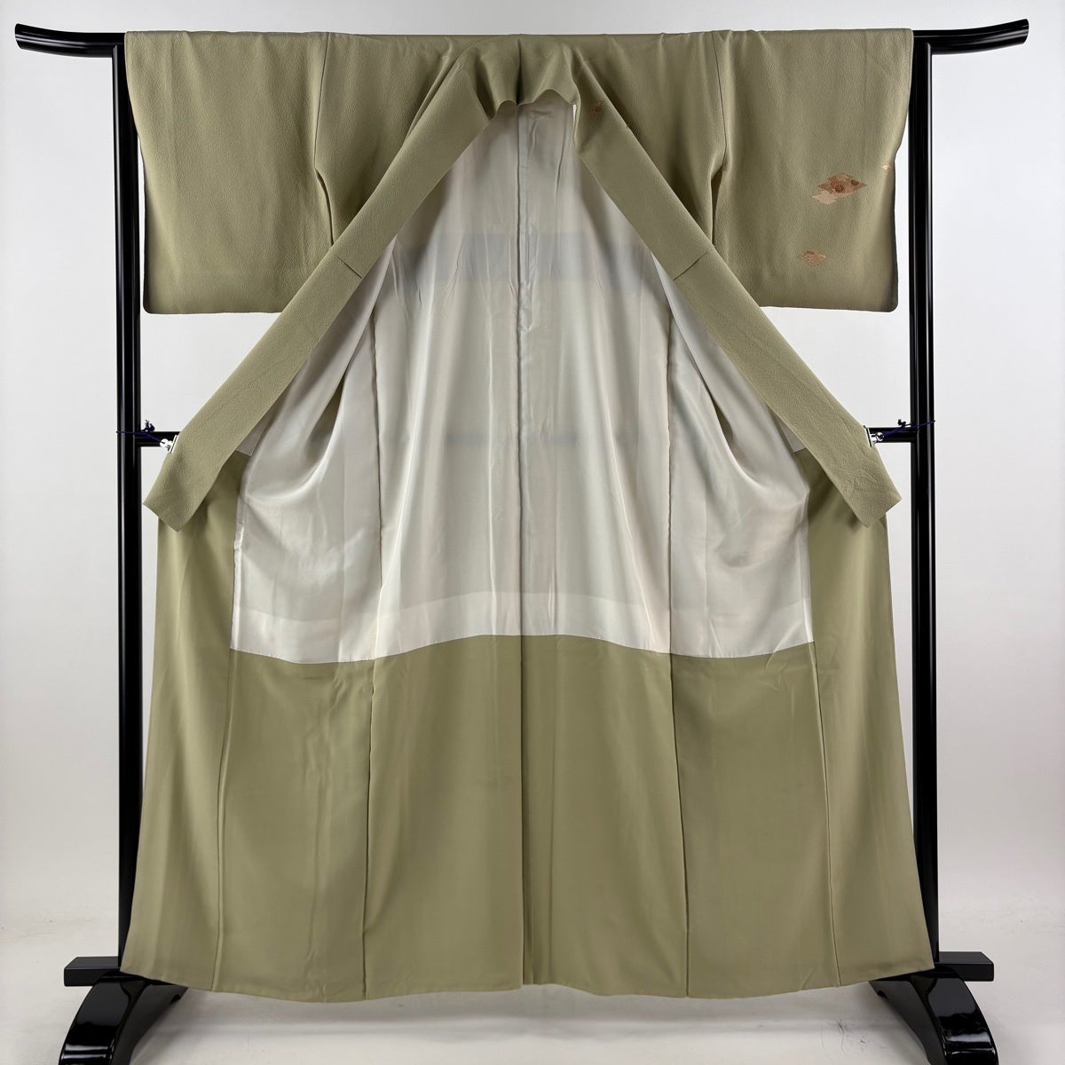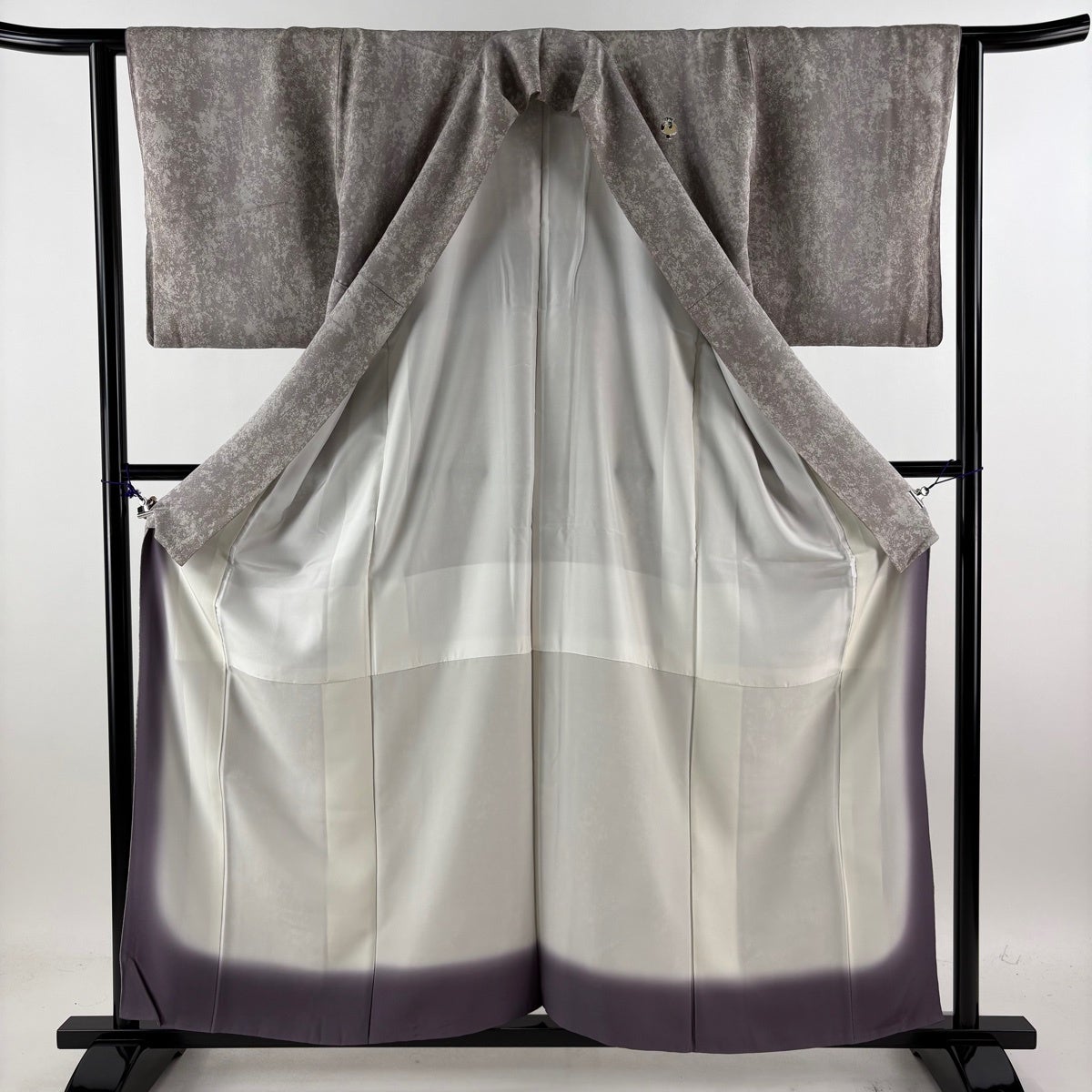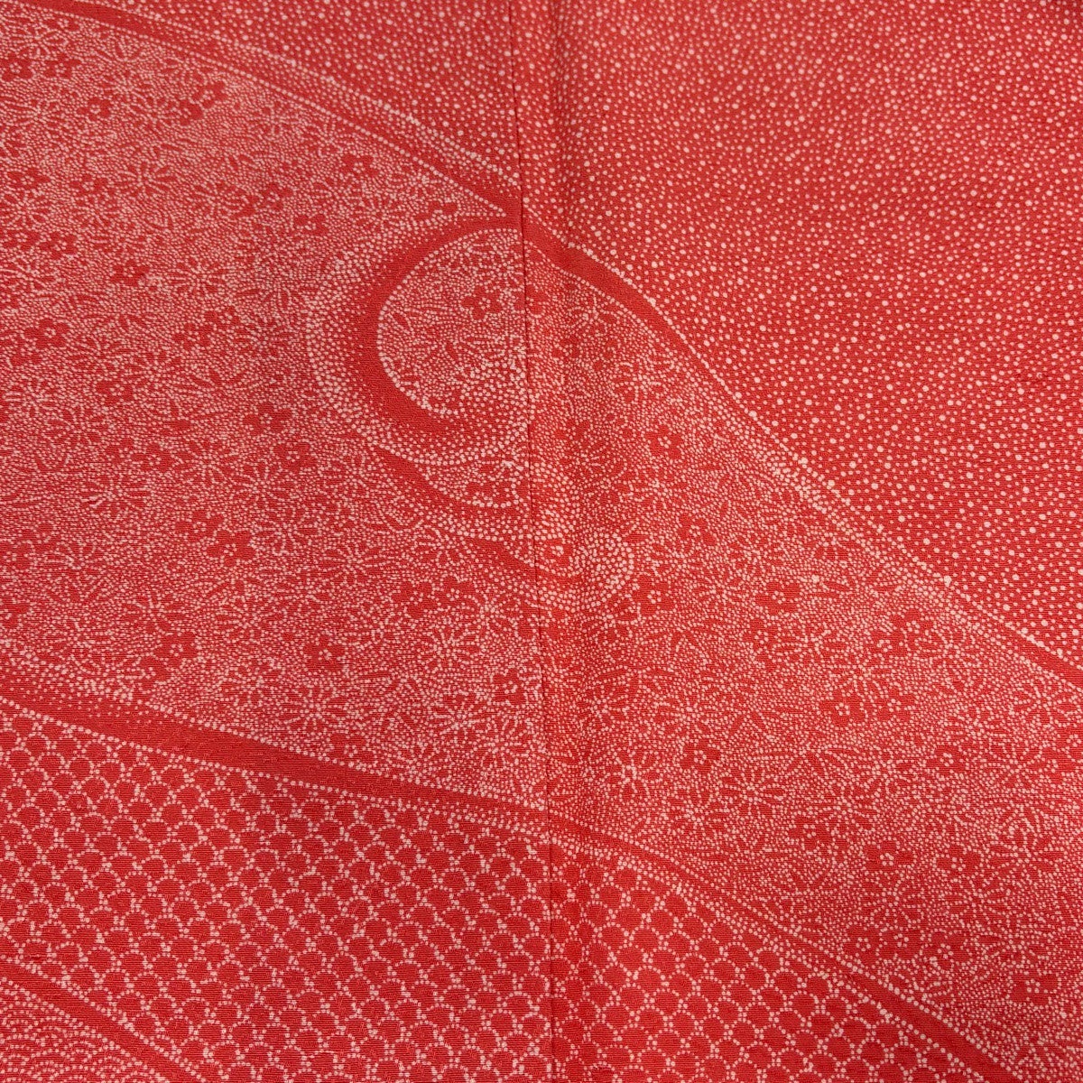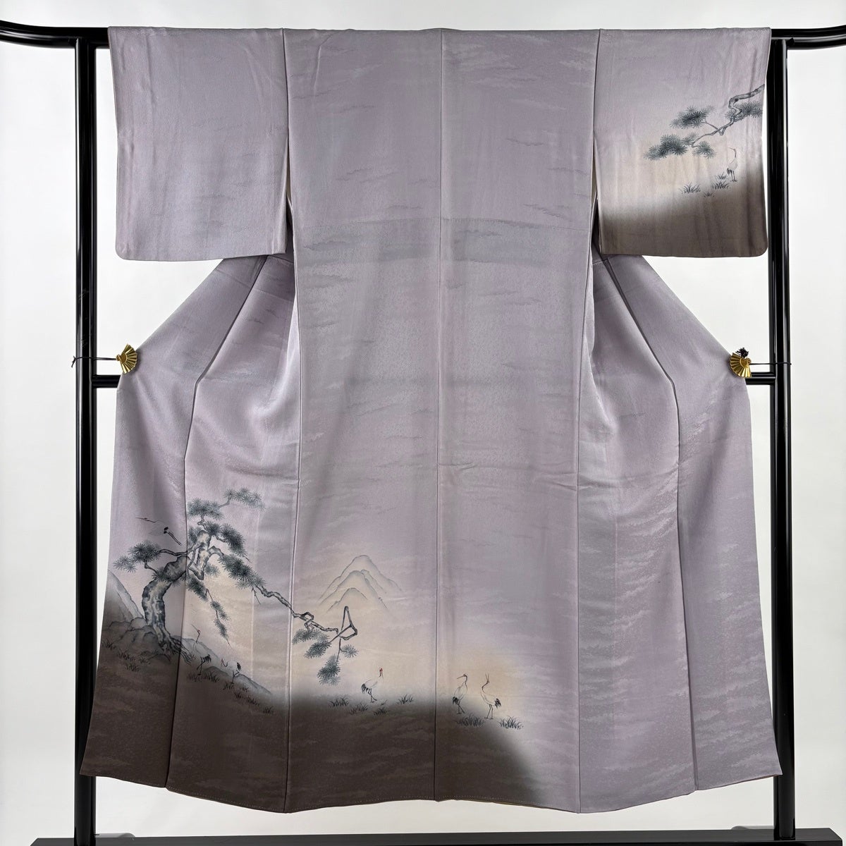 付け下げは訪問着を簡略化した訪問着より格が低くで小紋より格の高いの着物です。 特徴としては仕立て方の違いから訪問着などの一度真っさらな反物を着物の形に仮仕立てした後に柄付けをする絵羽模様とは違い、反物の状態で着用した時に柄付けが全て上を向くように書く事により左右の身頃や肩から袖にかけての模様が繋がっていない事です。 付け下げの歴史は他の着物に比べ浅く、戦時下に華美な訪問着が禁止された事で生まれた着物で、その後訪問着に比べ比較的安価で、それでいて着用シーンも訪問着とほぼ変わらないため大変好評になり、付け下げ訪問着と呼ばれる華やかな柄付けのものも考案された事により普及していきました。