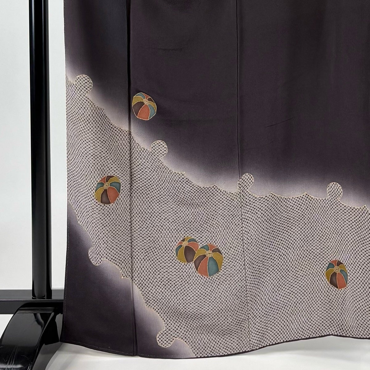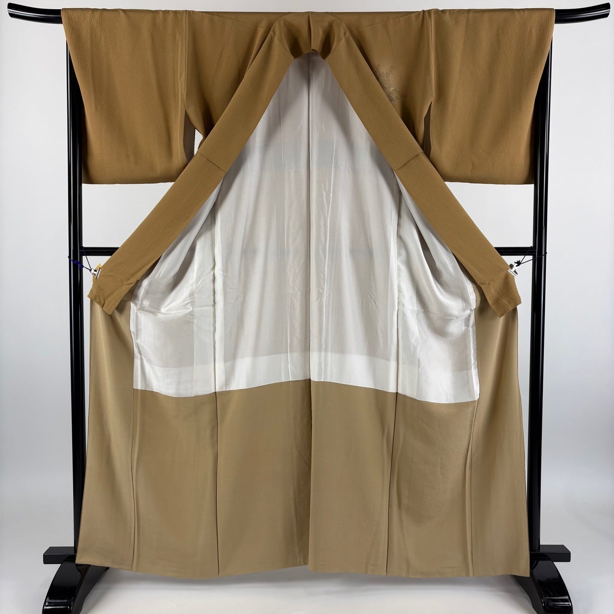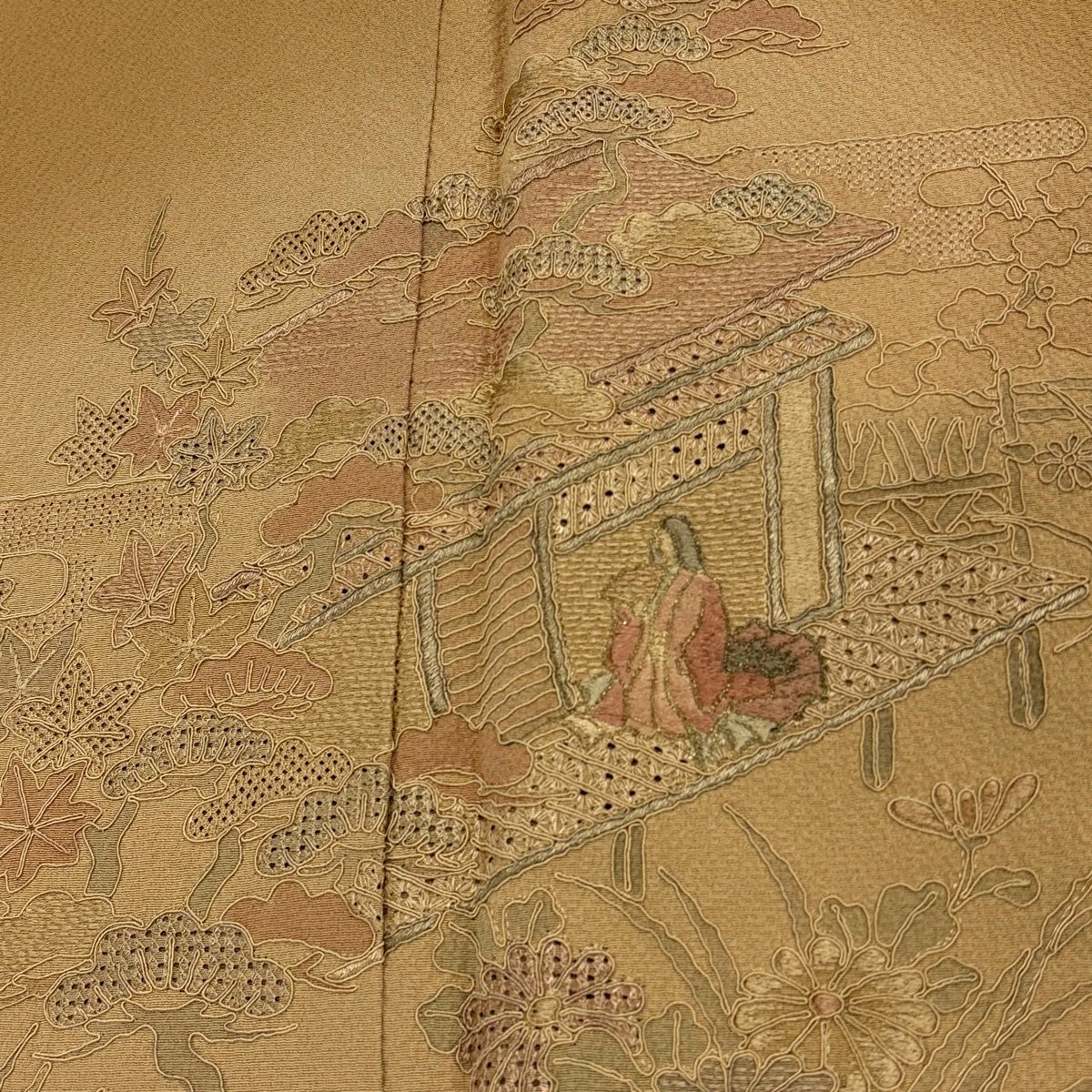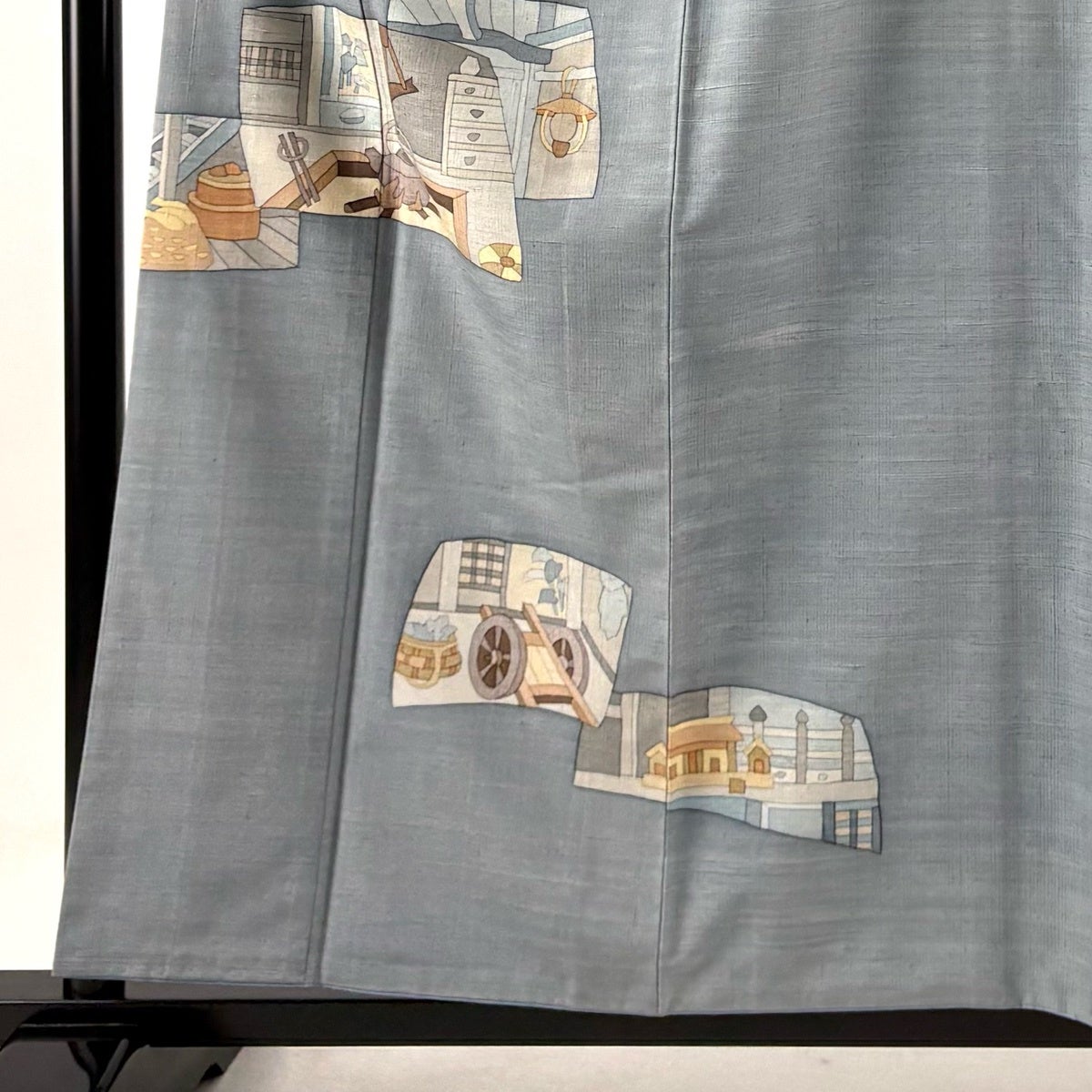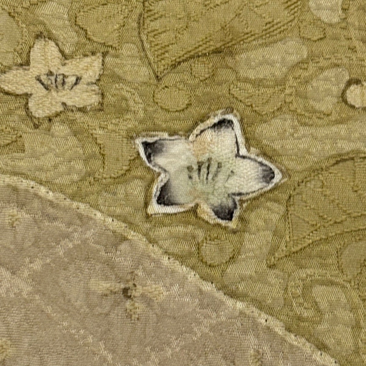 付け下げは訪問着を簡略化した訪問着より格が低くで小紋より格の高いの着物です。 特徴としては仕立て方の違いから訪問着などの一度真っさらな反物を着物の形に仮仕立てした後に柄付けをする絵羽模様とは違い、反物の状態で着用した時に柄付けが全て上を向くように書く事により左右の身頃や肩から袖にかけての模様が繋がっていない事です。 付け下げの歴史は他の着物に比べ浅く、戦時下に華美な訪問着が禁止された事で生まれた着物で、その後訪問着に比べ比較的安価で、それでいて着用シーンも訪問着とほぼ変わらないため大変好評になり、付け下げ訪問着と呼ばれる華やかな柄付けのものも考案された事により普及していきました。