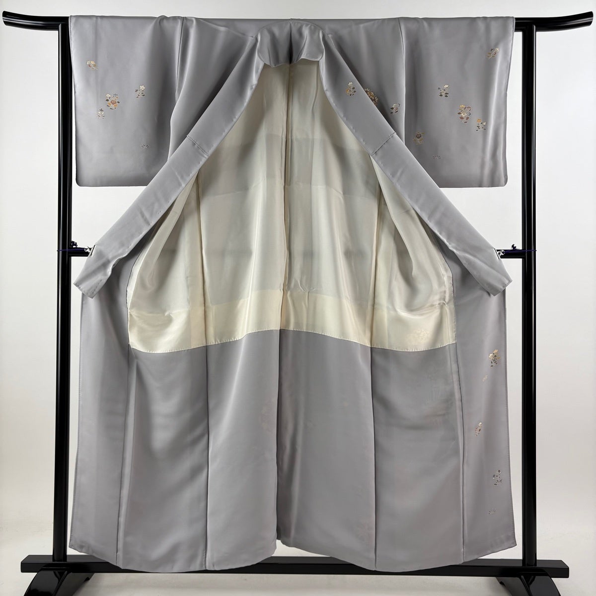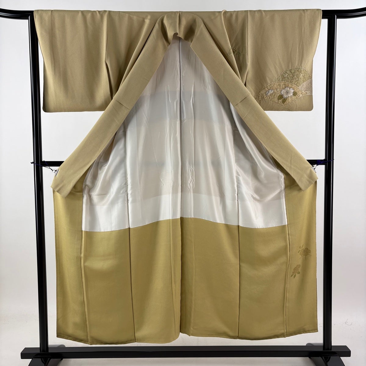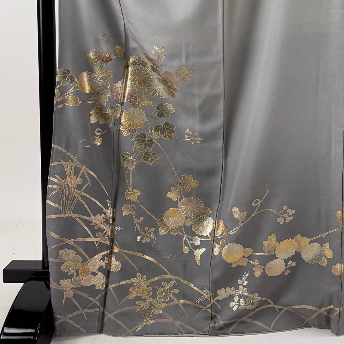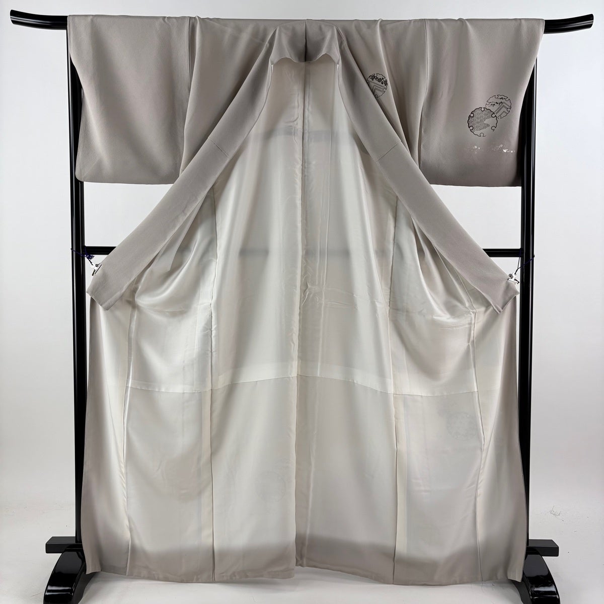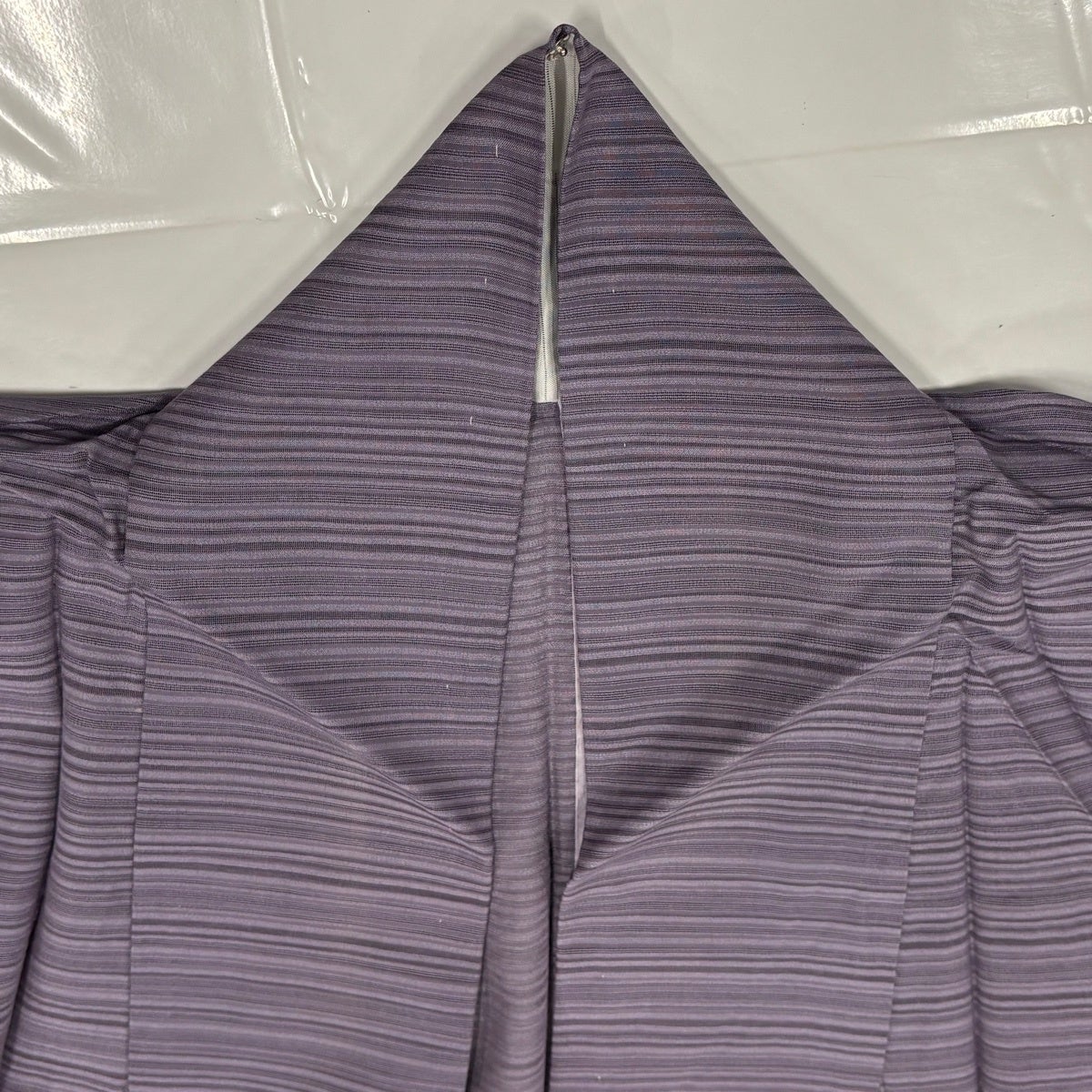 付け下げは訪問着を簡略化した訪問着より格が低くで小紋より格の高いの着物です。 特徴としては仕立て方の違いから訪問着などの一度真っさらな反物を着物の形に仮仕立てした後に柄付けをする絵羽模様とは違い、反物の状態で着用した時に柄付けが全て上を向くように書く事により左右の身頃や肩から袖にかけての模様が繋がっていない事です。 付け下げの歴史は他の着物に比べ浅く、戦時下に華美な訪問着が禁止された事で生まれた着物で、その後訪問着に比べ比較的安価で、それでいて着用シーンも訪問着とほぼ変わらないため大変好評になり、付け下げ訪問着と呼ばれる華やかな柄付けのものも考案された事により普及していきました。