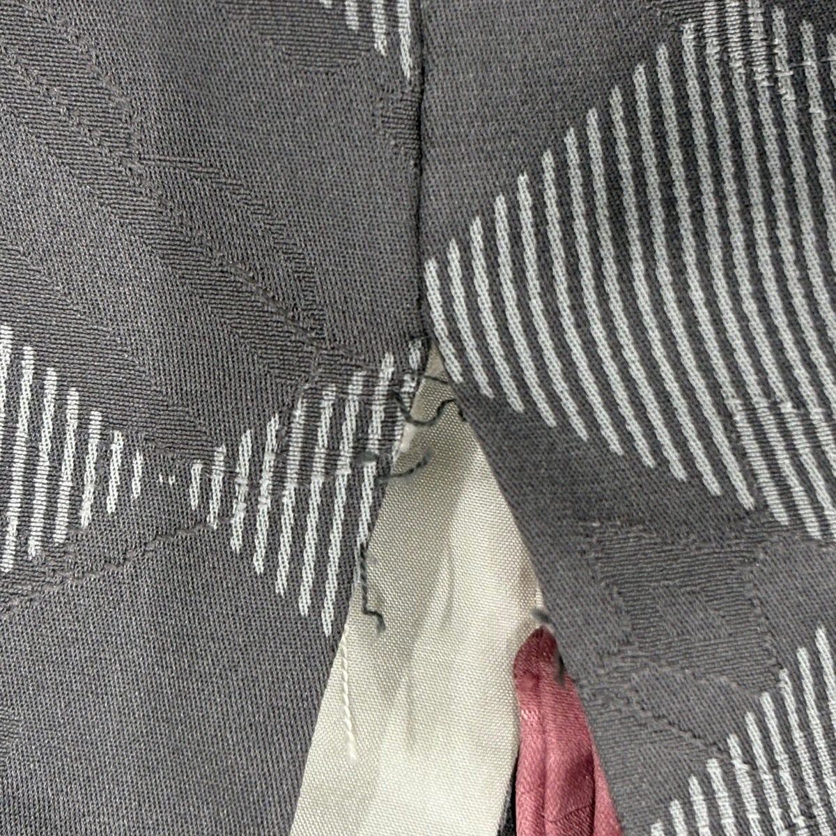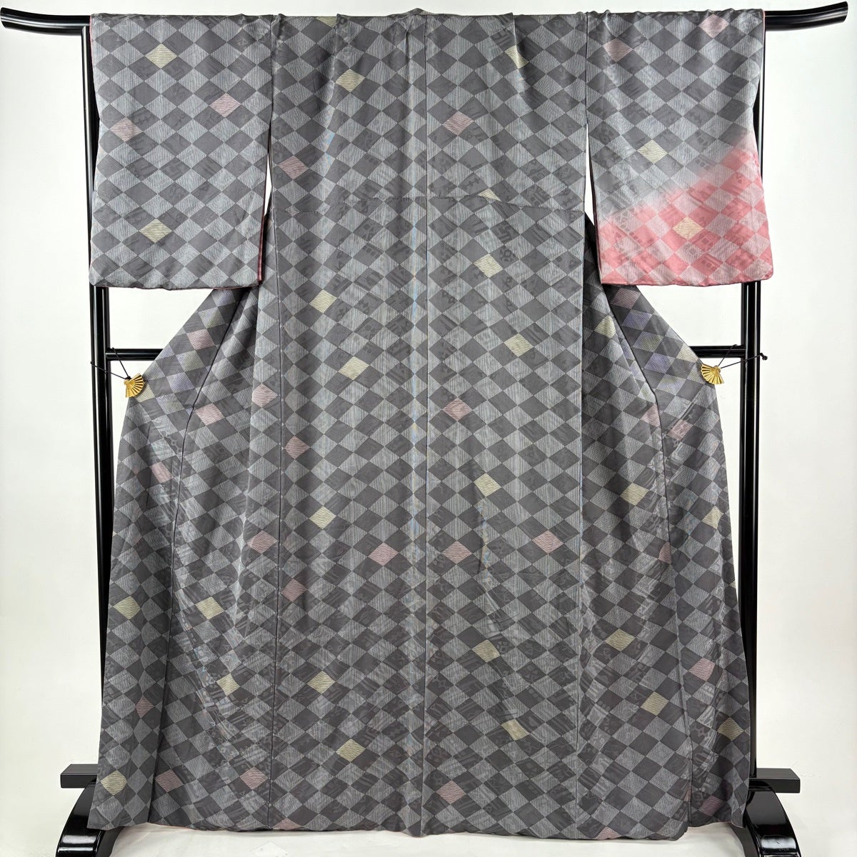 付け下げは訪問着を簡略化した訪問着より格が低くで小紋より格の高いの着物です。 特徴としては仕立て方の違いから訪問着などの一度真っさらな反物を着物の形に仮仕立てした後に柄付けをする絵羽模様とは違い、反物の状態で着用した時に柄付けが全て上を向くように書く事により左右の身頃や肩から袖にかけての模様が繋がっていない事です。 付け下げの歴史は他の着物に比べ浅く、戦時下に華美な訪問着が禁止された事で生まれた着物で、その後訪問着に比べ比較的安価で、それでいて着用シーンも訪問着とほぼ変わらないため大変好評になり、付け下げ訪問着と呼ばれる華やかな柄付けのものも考案された事により普及していきました。