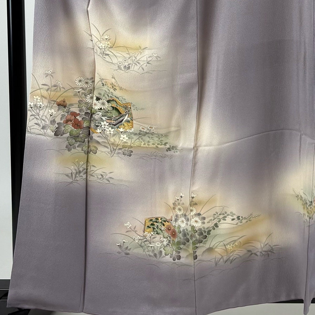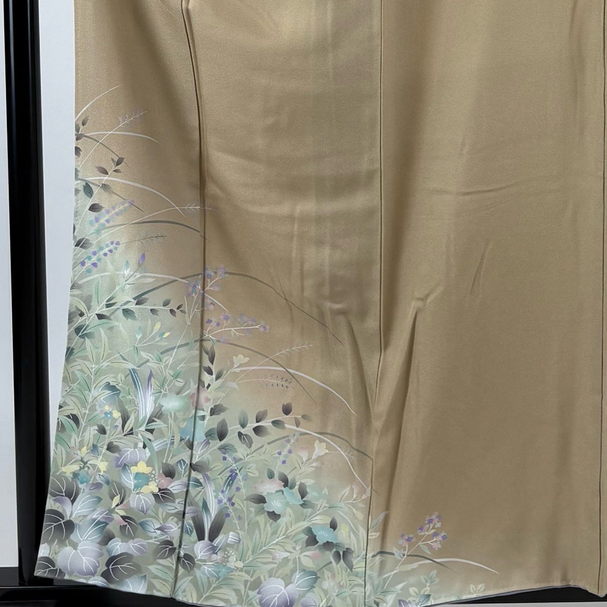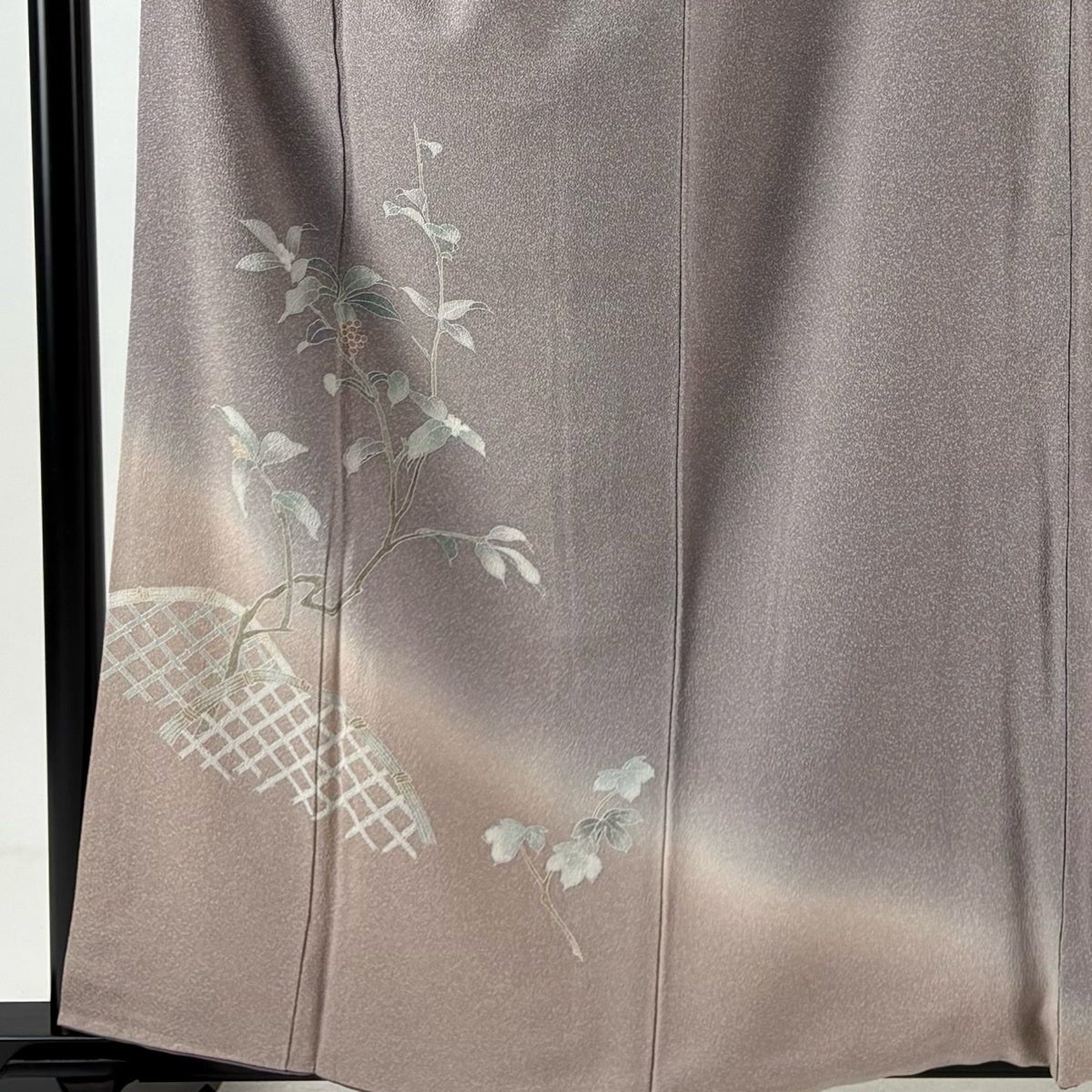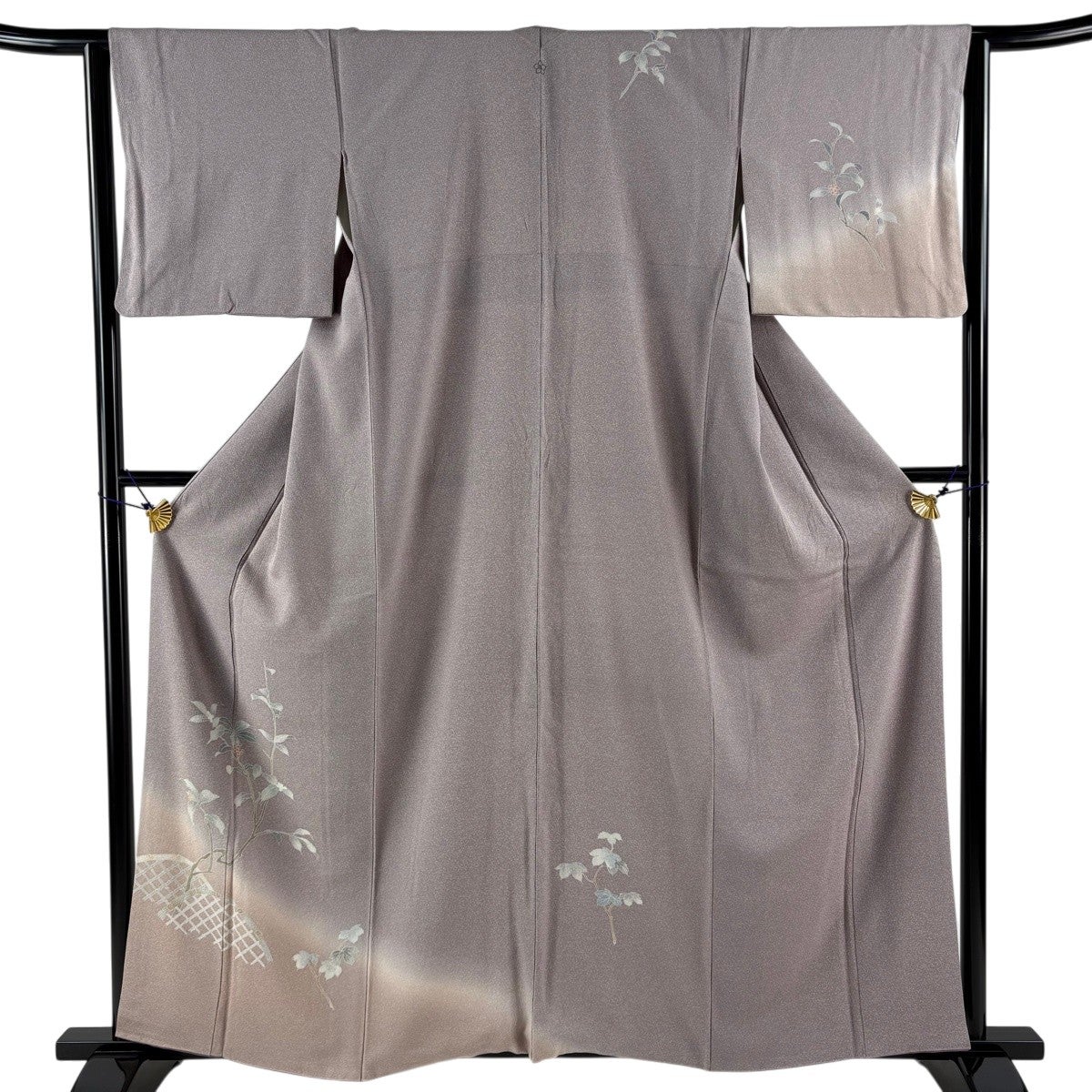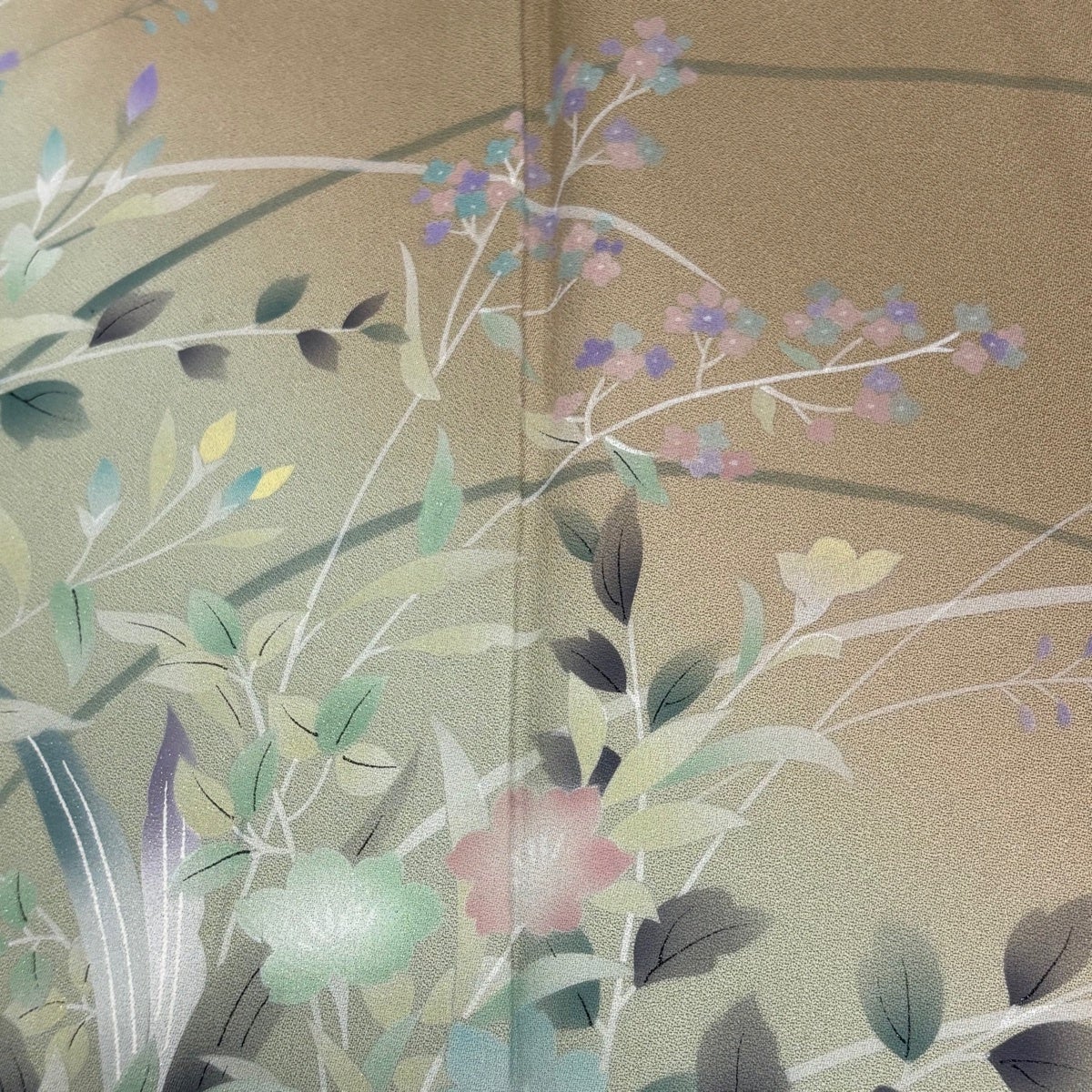 付け下げは訪問着を簡略化した訪問着より格が低くで小紋より格の高いの着物です。 特徴としては仕立て方の違いから訪問着などの一度真っさらな反物を着物の形に仮仕立てした後に柄付けをする絵羽模様とは違い、反物の状態で着用した時に柄付けが全て上を向くように書く事により左右の身頃や肩から袖にかけての模様が繋がっていない事です。 付け下げの歴史は他の着物に比べ浅く、戦時下に華美な訪問着が禁止された事で生まれた着物で、その後訪問着に比べ比較的安価で、それでいて着用シーンも訪問着とほぼ変わらないため大変好評になり、付け下げ訪問着と呼ばれる華やかな柄付けのものも考案された事により普及していきました。