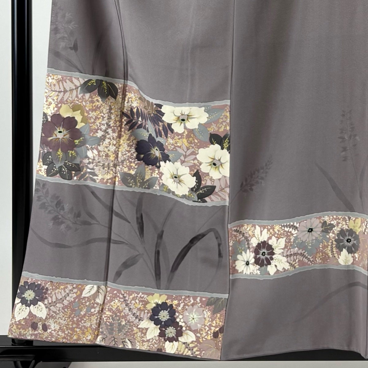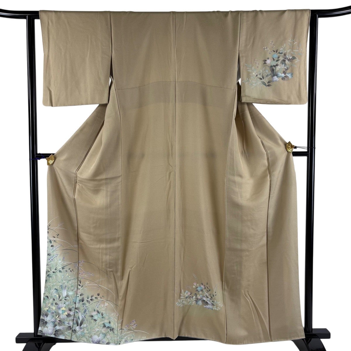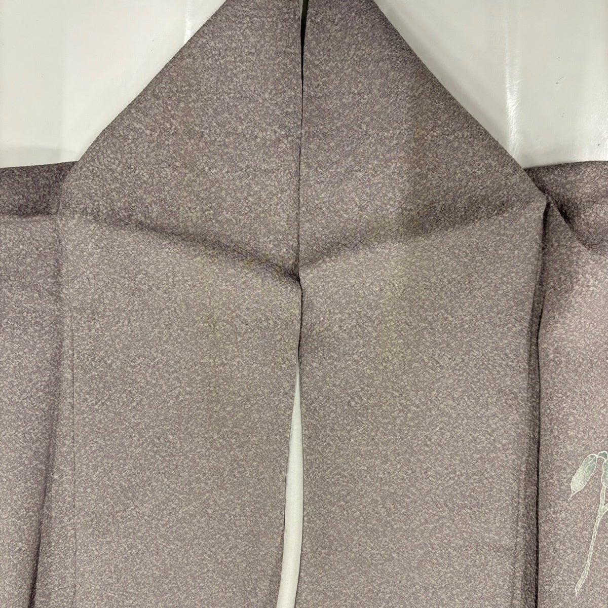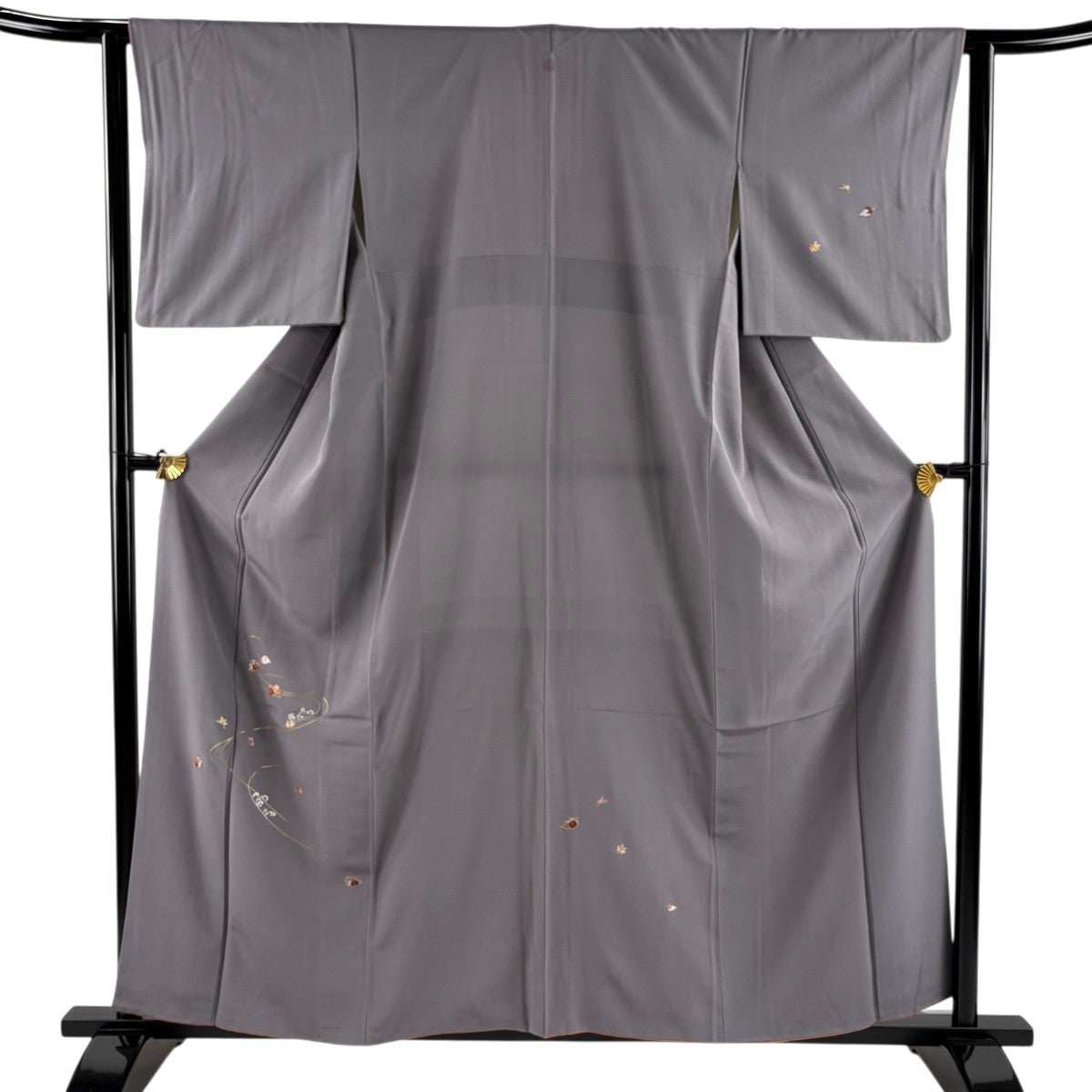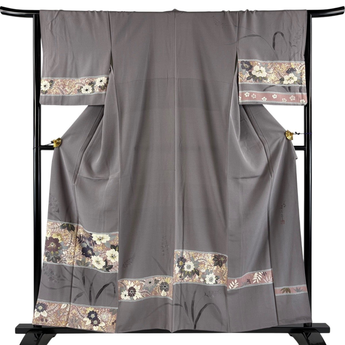 付け下げは訪問着を簡略化した訪問着より格が低くで小紋より格の高いの着物です。 特徴としては仕立て方の違いから訪問着などの一度真っさらな反物を着物の形に仮仕立てした後に柄付けをする絵羽模様とは違い、反物の状態で着用した時に柄付けが全て上を向くように書く事により左右の身頃や肩から袖にかけての模様が繋がっていない事です。 付け下げの歴史は他の着物に比べ浅く、戦時下に華美な訪問着が禁止された事で生まれた着物で、その後訪問着に比べ比較的安価で、それでいて着用シーンも訪問着とほぼ変わらないため大変好評になり、付け下げ訪問着と呼ばれる華やかな柄付けのものも考案された事により普及していきました。