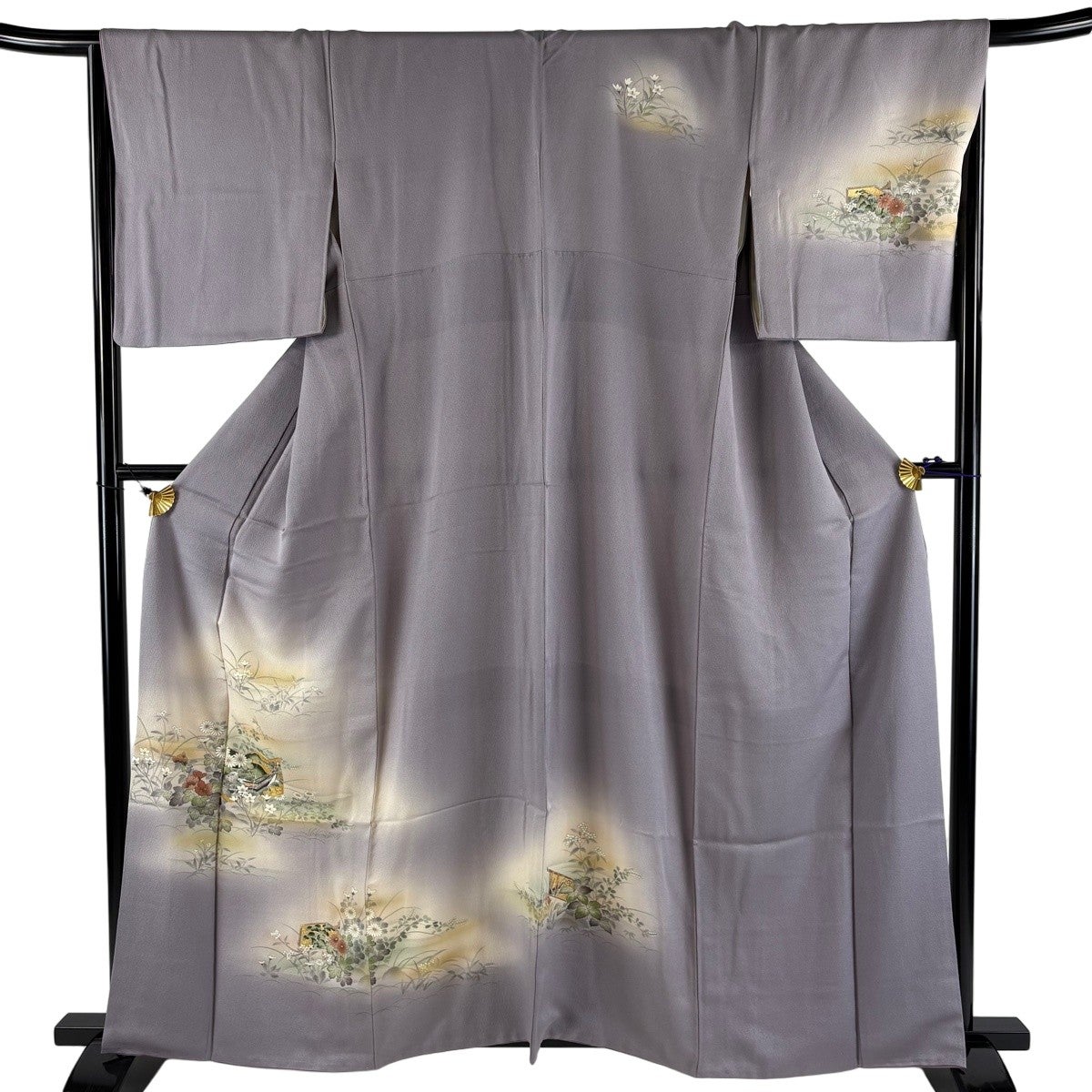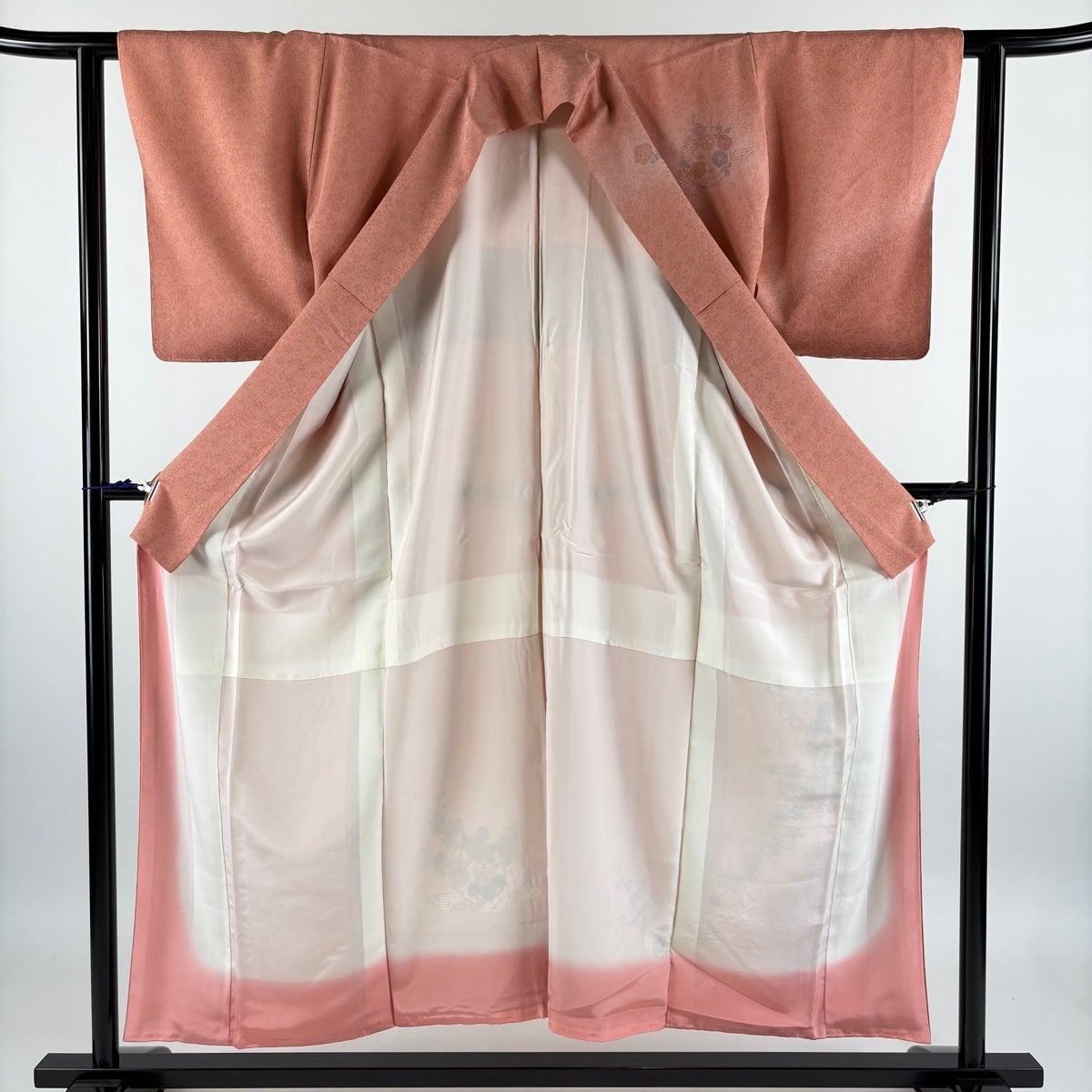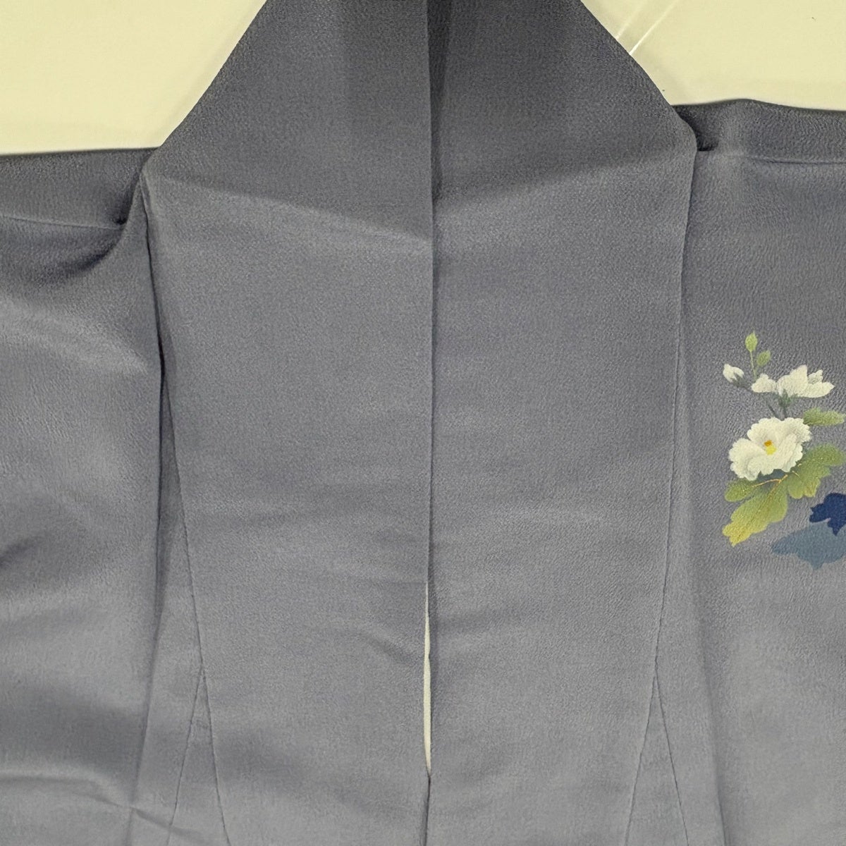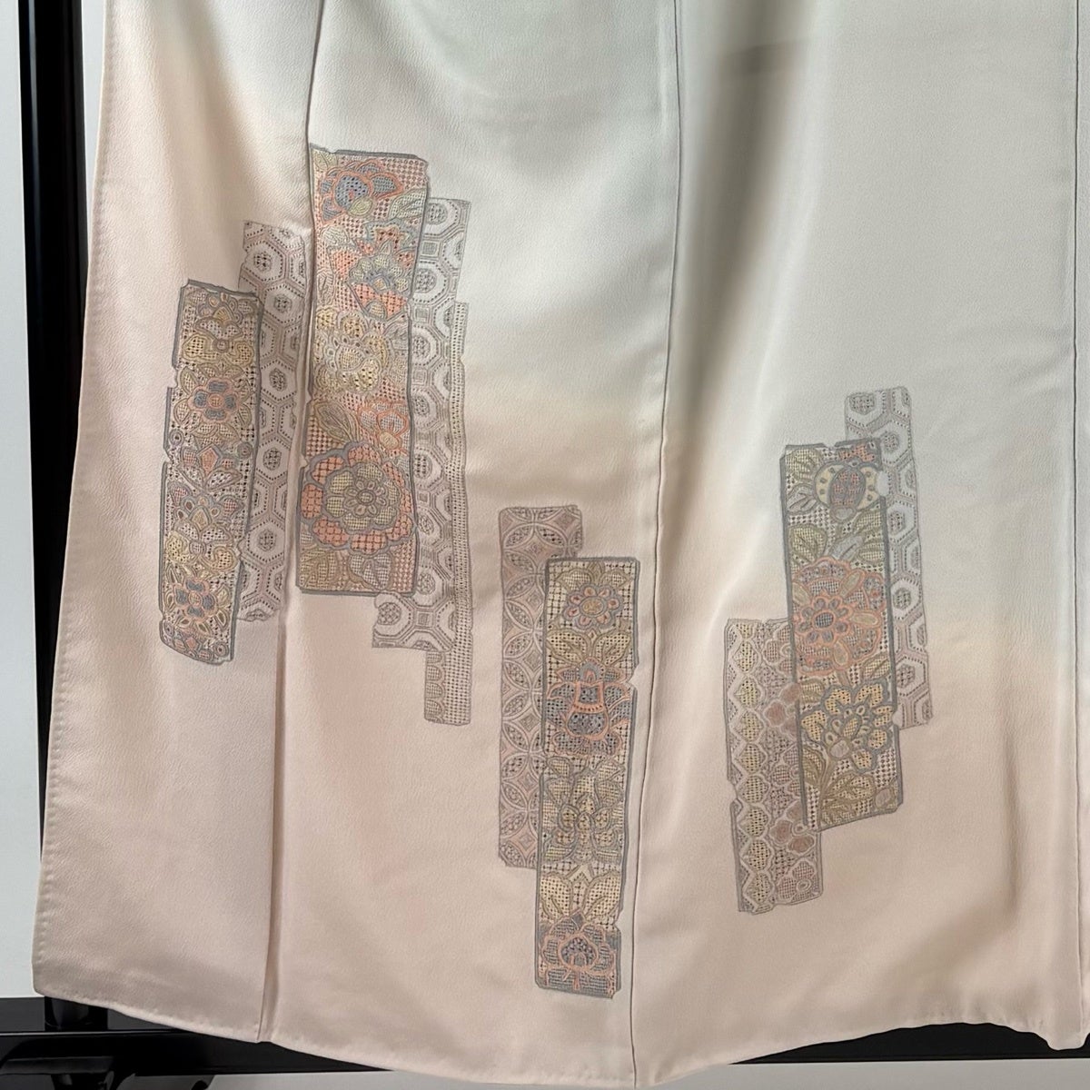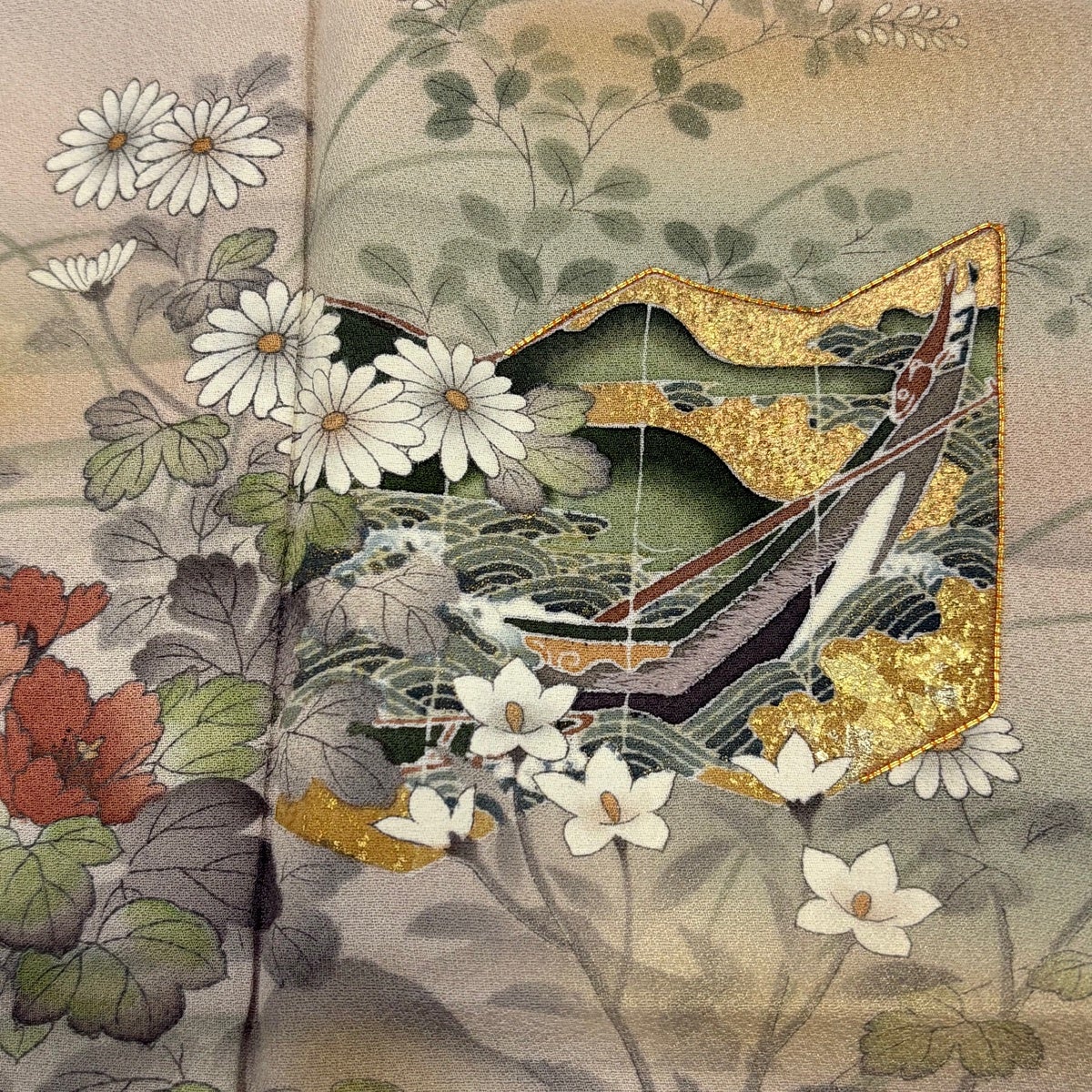 付け下げは訪問着を簡略化した訪問着より格が低くで小紋より格の高いの着物です。 特徴としては仕立て方の違いから訪問着などの一度真っさらな反物を着物の形に仮仕立てした後に柄付けをする絵羽模様とは違い、反物の状態で着用した時に柄付けが全て上を向くように書く事により左右の身頃や肩から袖にかけての模様が繋がっていない事です。 付け下げの歴史は他の着物に比べ浅く、戦時下に華美な訪問着が禁止された事で生まれた着物で、その後訪問着に比べ比較的安価で、それでいて着用シーンも訪問着とほぼ変わらないため大変好評になり、付け下げ訪問着と呼ばれる華やかな柄付けのものも考案された事により普及していきました。