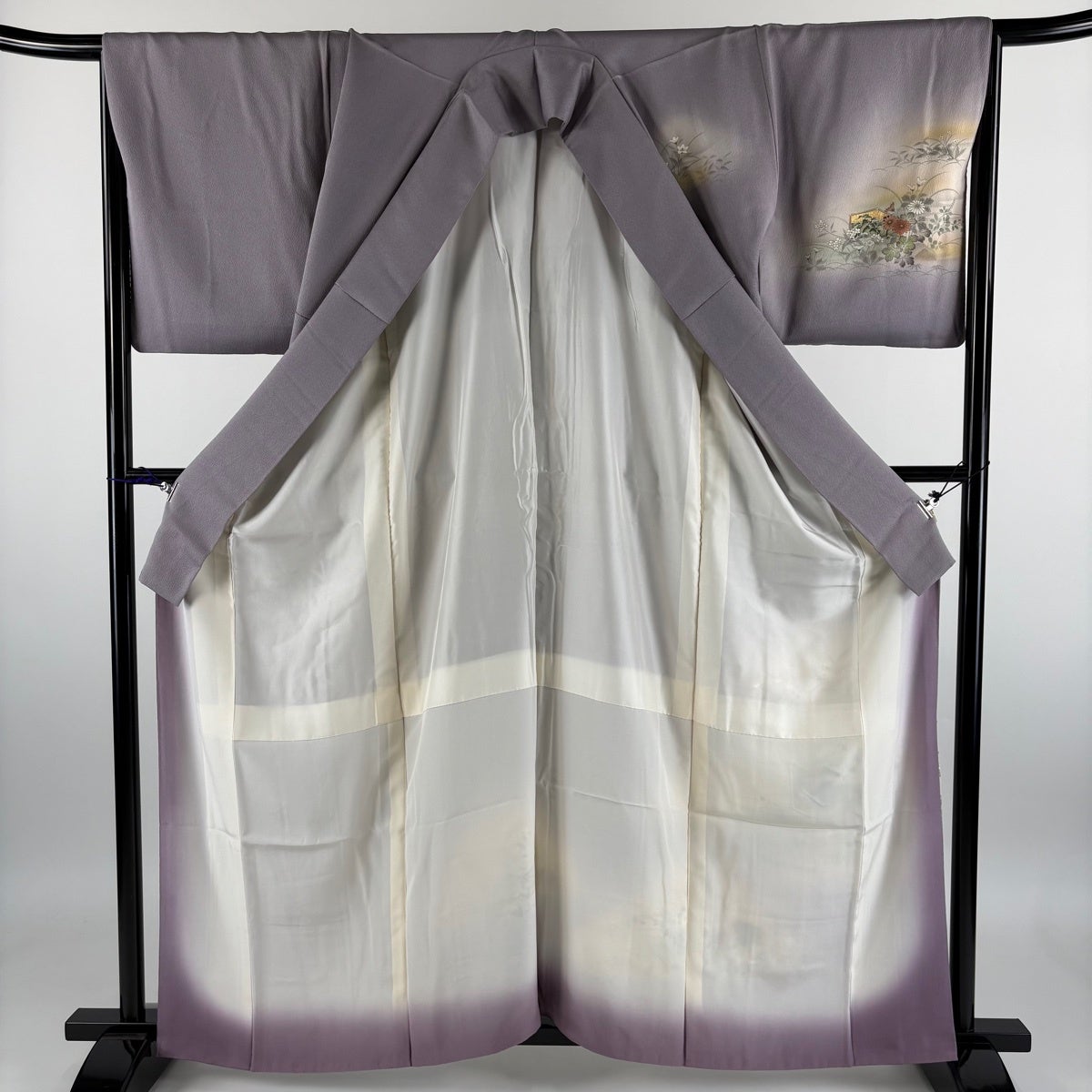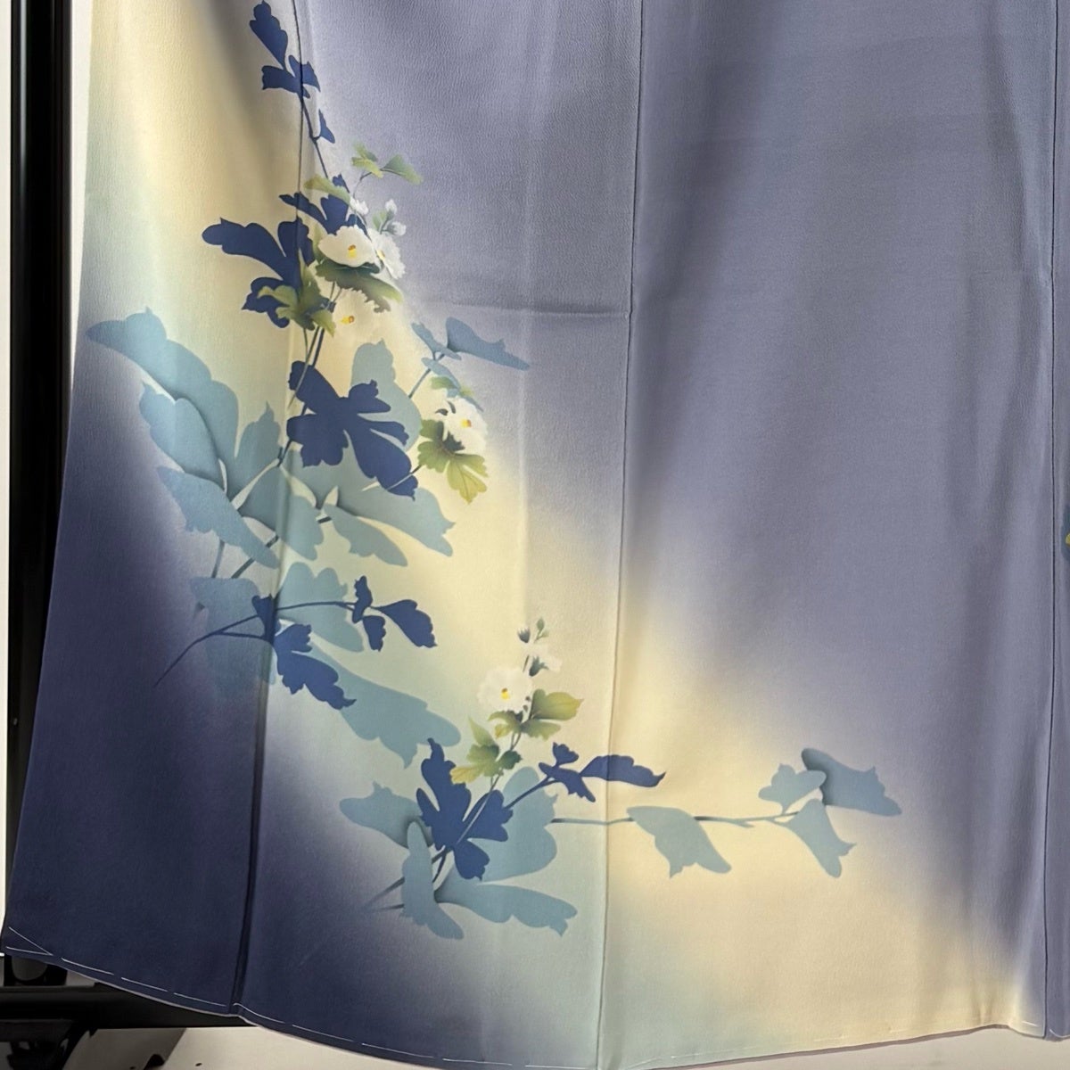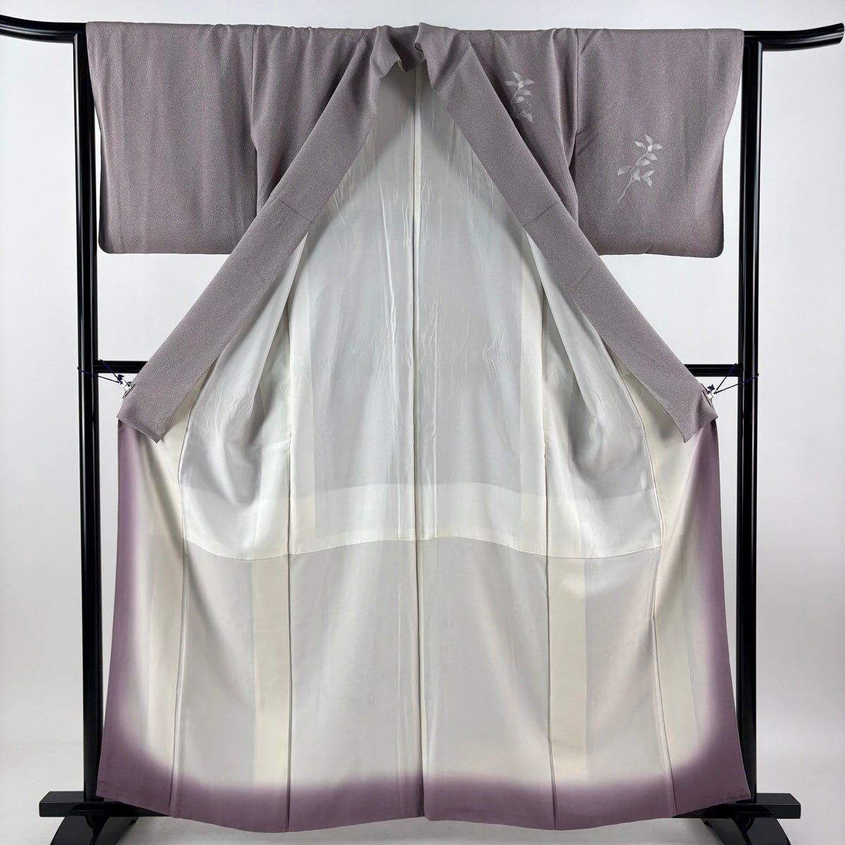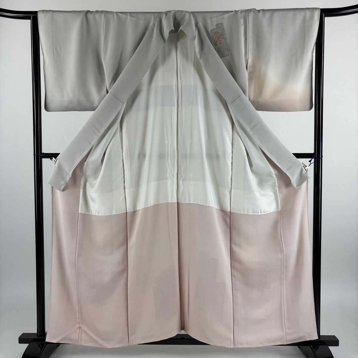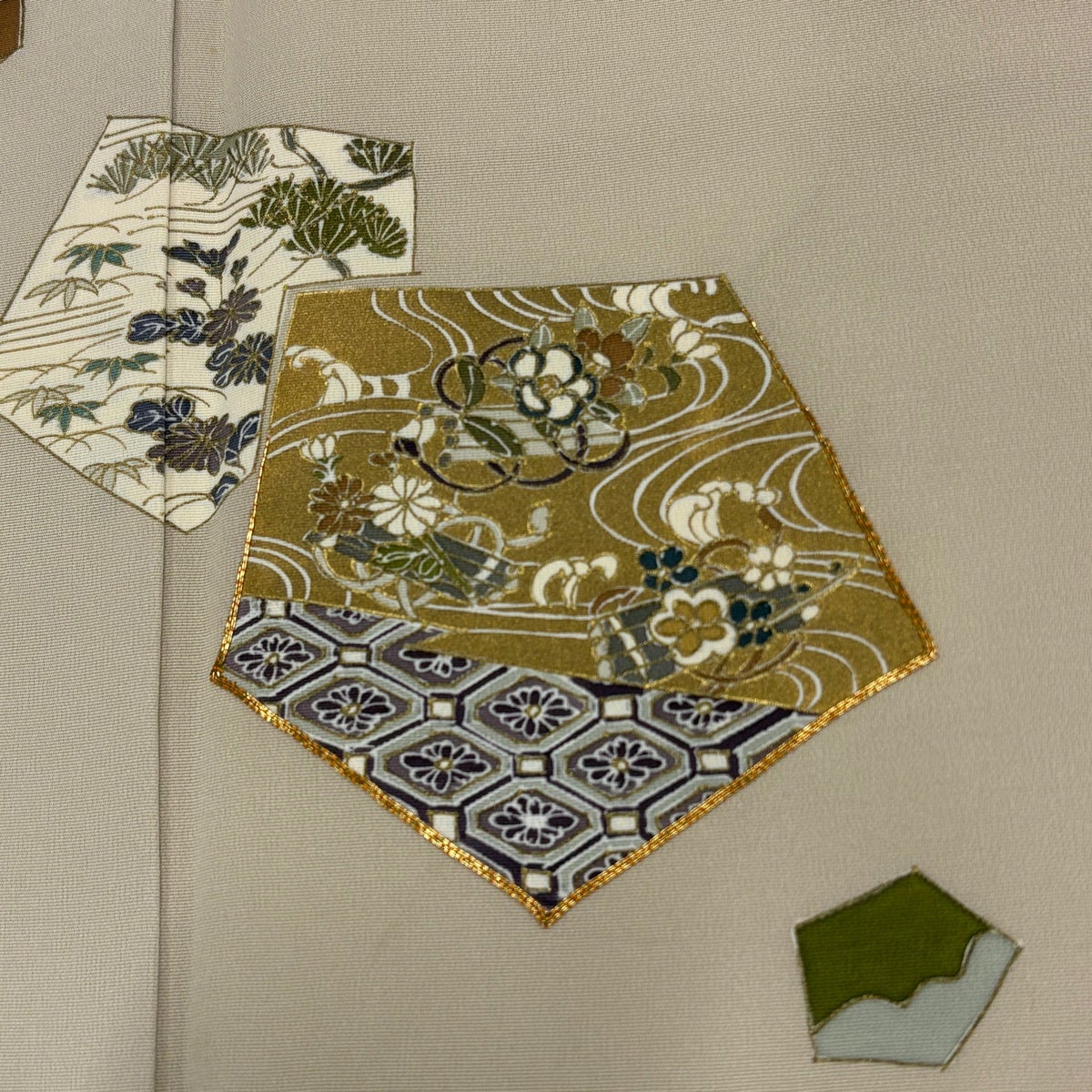 付け下げは訪問着を簡略化した訪問着より格が低くで小紋より格の高いの着物です。 特徴としては仕立て方の違いから訪問着などの一度真っさらな反物を着物の形に仮仕立てした後に柄付けをする絵羽模様とは違い、反物の状態で着用した時に柄付けが全て上を向くように書く事により左右の身頃や肩から袖にかけての模様が繋がっていない事です。 付け下げの歴史は他の着物に比べ浅く、戦時下に華美な訪問着が禁止された事で生まれた着物で、その後訪問着に比べ比較的安価で、それでいて着用シーンも訪問着とほぼ変わらないため大変好評になり、付け下げ訪問着と呼ばれる華やかな柄付けのものも考案された事により普及していきました。