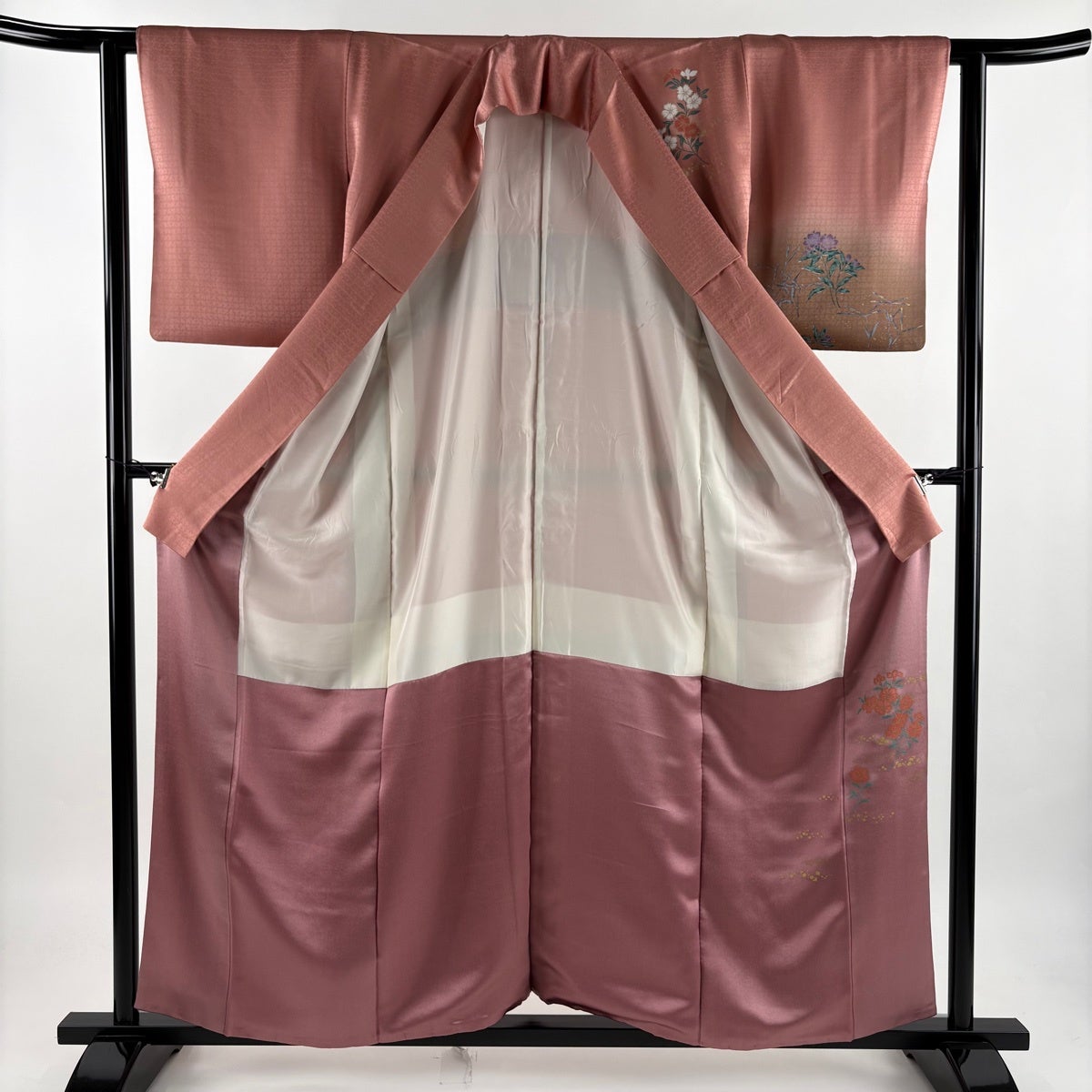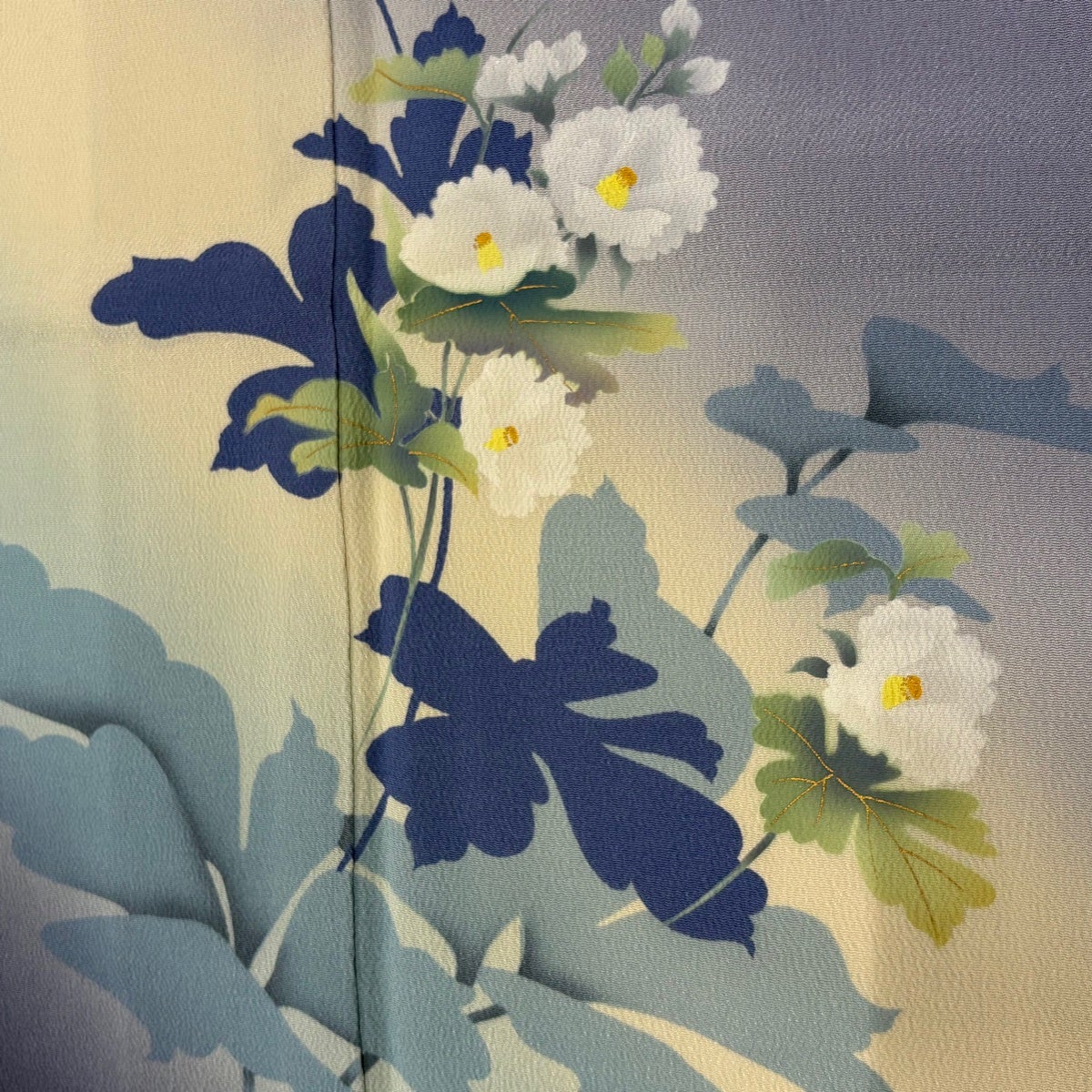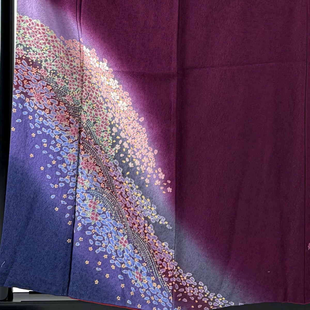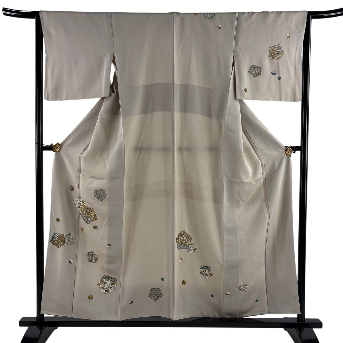 付け下げは訪問着を簡略化した訪問着より格が低くで小紋より格の高いの着物です。 特徴としては仕立て方の違いから訪問着などの一度真っさらな反物を着物の形に仮仕立てした後に柄付けをする絵羽模様とは違い、反物の状態で着用した時に柄付けが全て上を向くように書く事により左右の身頃や肩から袖にかけての模様が繋がっていない事です。 付け下げの歴史は他の着物に比べ浅く、戦時下に華美な訪問着が禁止された事で生まれた着物で、その後訪問着に比べ比較的安価で、それでいて着用シーンも訪問着とほぼ変わらないため大変好評になり、付け下げ訪問着と呼ばれる華やかな柄付けのものも考案された事により普及していきました。