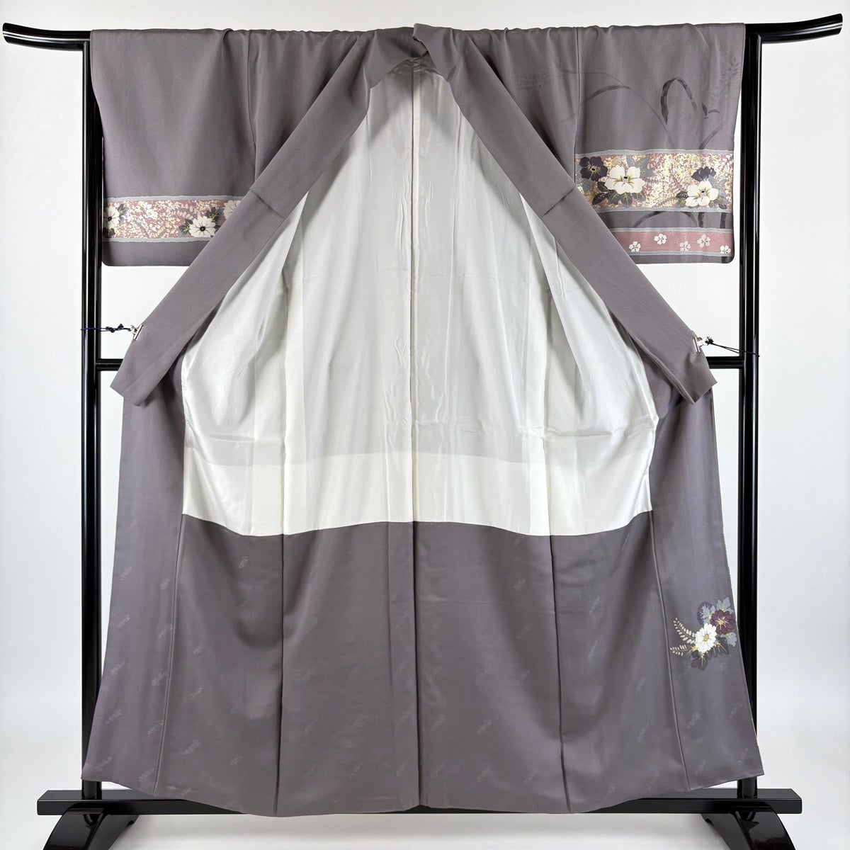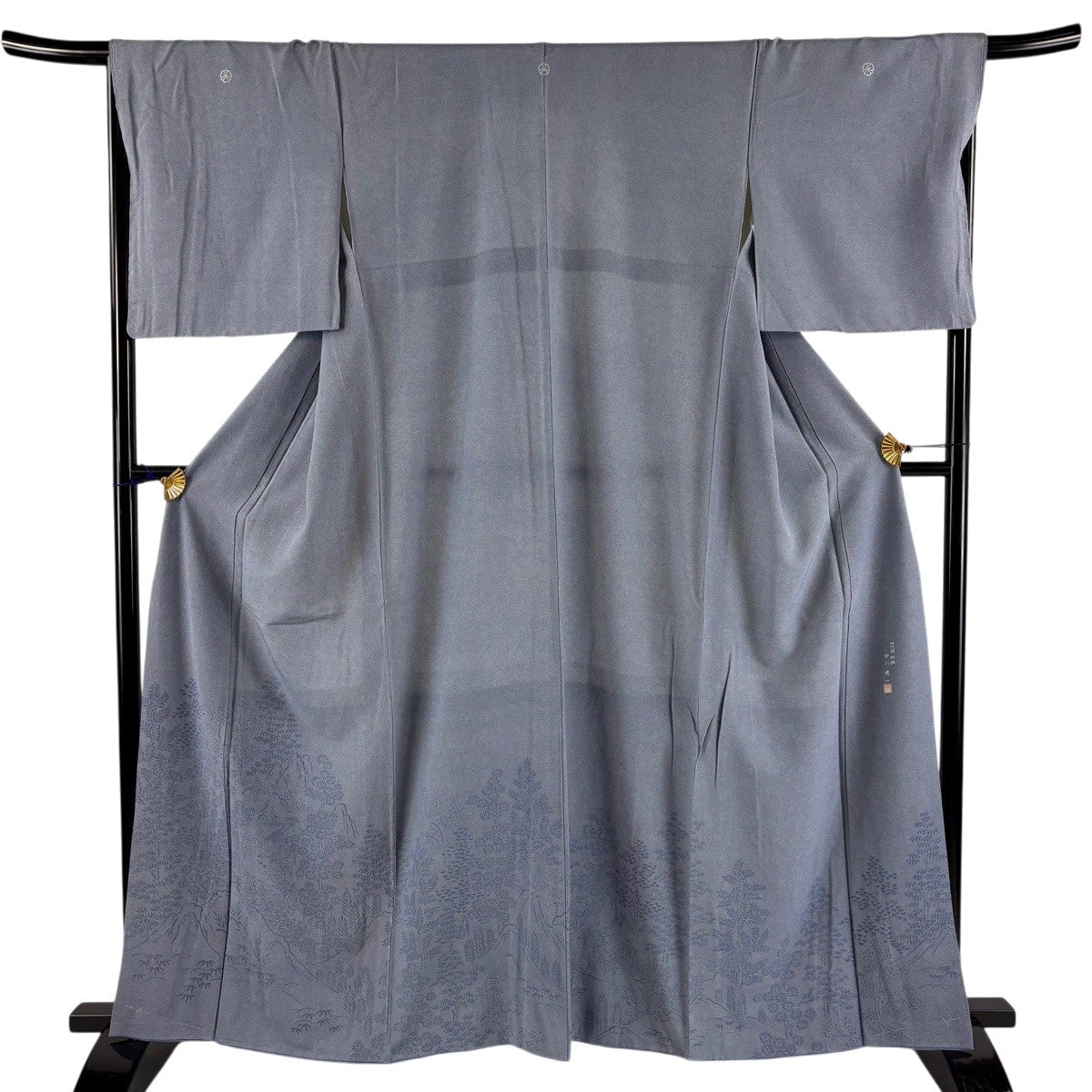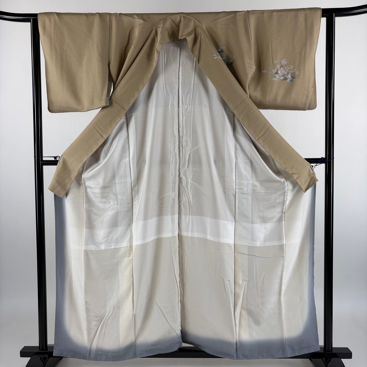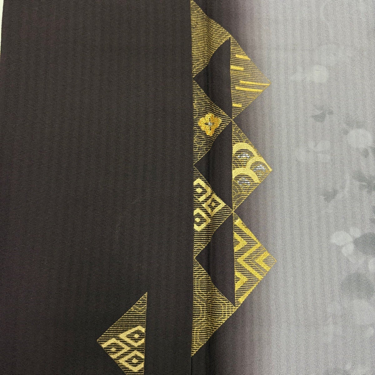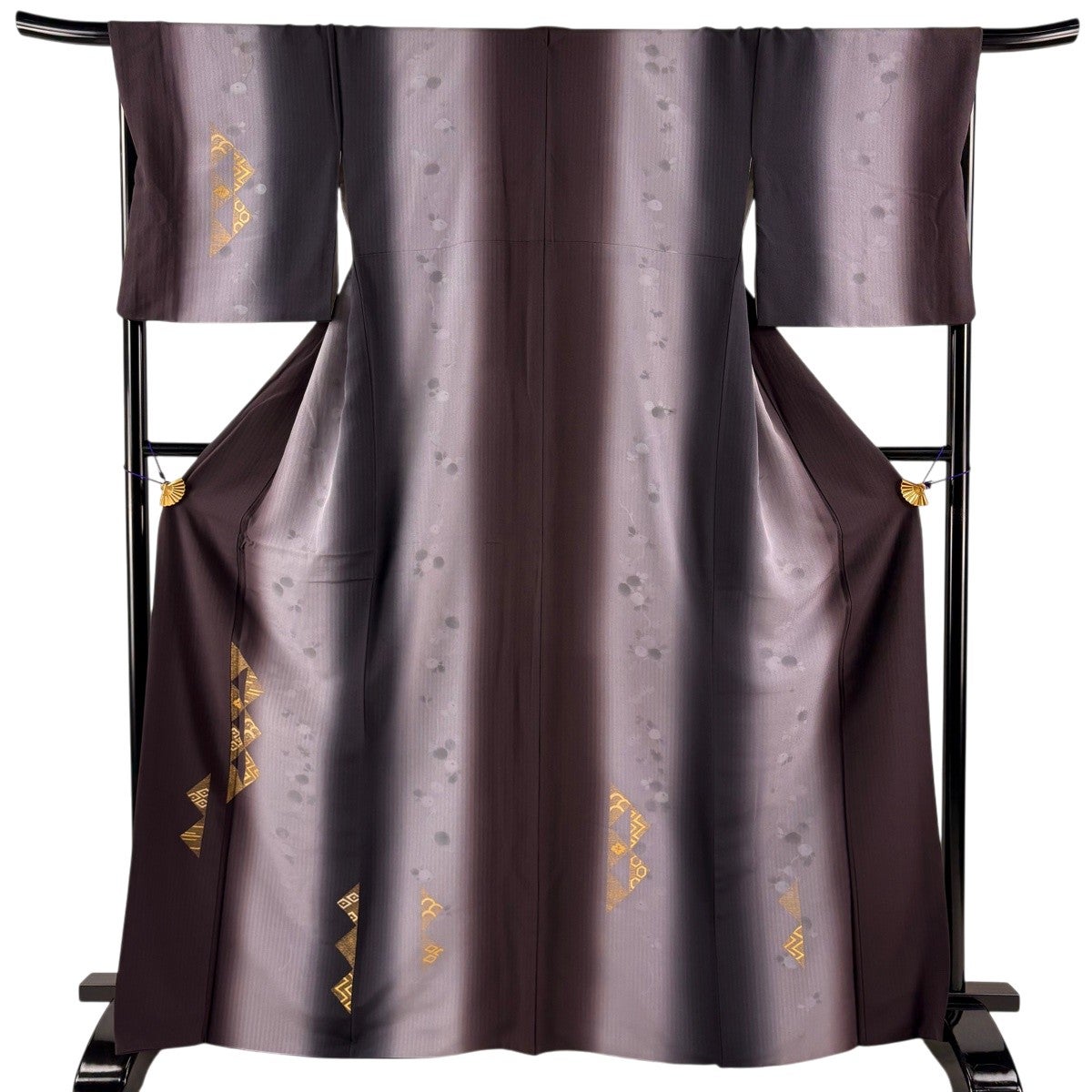 付け下げは訪問着を簡略化した訪問着より格が低くで小紋より格の高いの着物です。 特徴としては仕立て方の違いから訪問着などの一度真っさらな反物を着物の形に仮仕立てした後に柄付けをする絵羽模様とは違い、反物の状態で着用した時に柄付けが全て上を向くように書く事により左右の身頃や肩から袖にかけての模様が繋がっていない事です。 付け下げの歴史は他の着物に比べ浅く、戦時下に華美な訪問着が禁止された事で生まれた着物で、その後訪問着に比べ比較的安価で、それでいて着用シーンも訪問着とほぼ変わらないため大変好評になり、付け下げ訪問着と呼ばれる華やかな柄付けのものも考案された事により普及していきました。