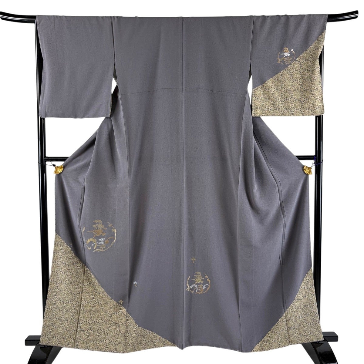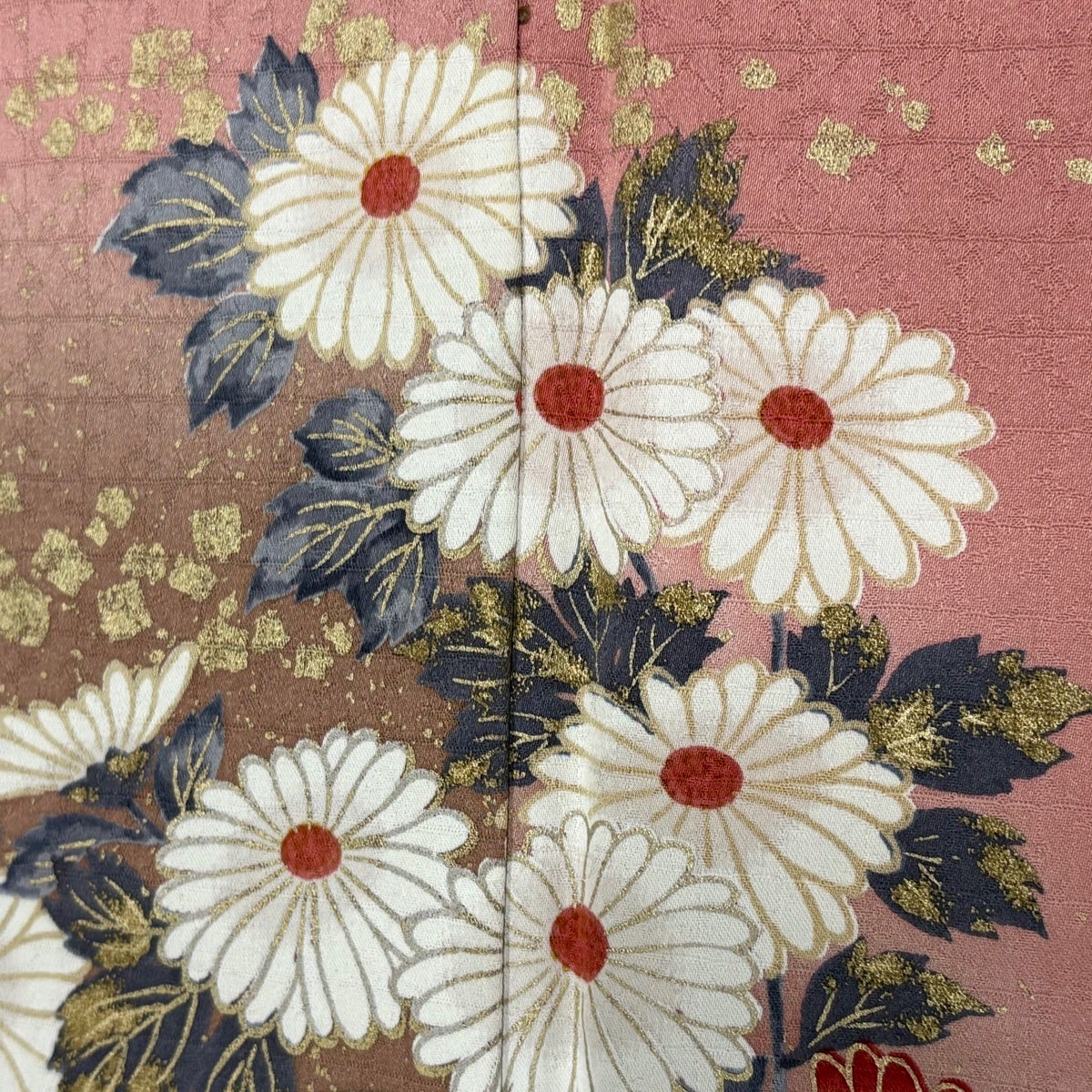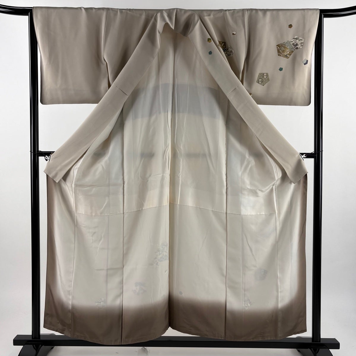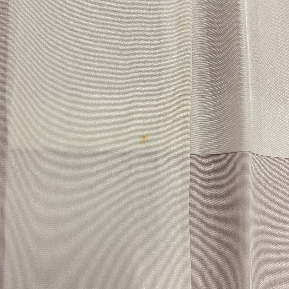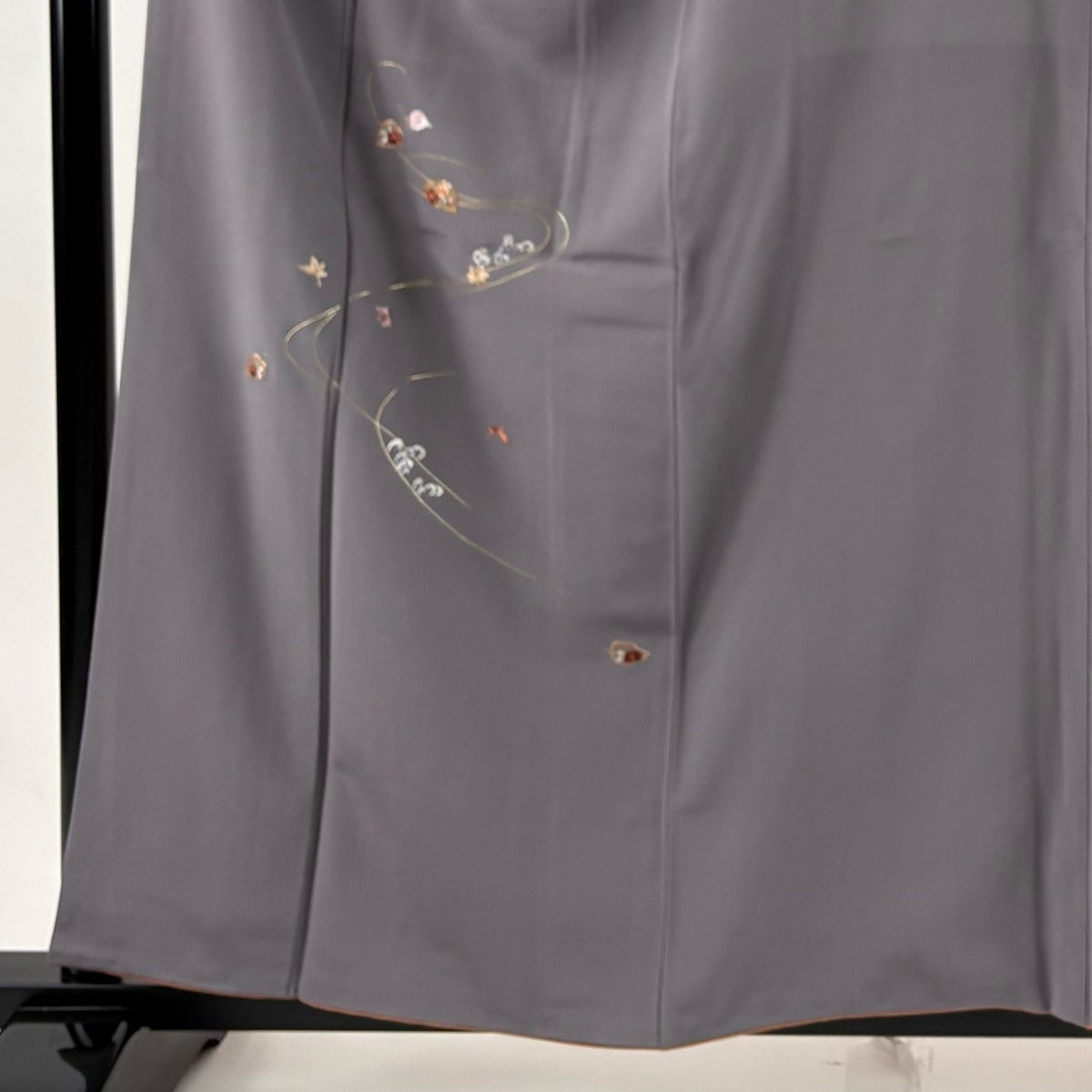 付け下げは訪問着を簡略化した訪問着より格が低くで小紋より格の高いの着物です。 特徴としては仕立て方の違いから訪問着などの一度真っさらな反物を着物の形に仮仕立てした後に柄付けをする絵羽模様とは違い、反物の状態で着用した時に柄付けが全て上を向くように書く事により左右の身頃や肩から袖にかけての模様が繋がっていない事です。 付け下げの歴史は他の着物に比べ浅く、戦時下に華美な訪問着が禁止された事で生まれた着物で、その後訪問着に比べ比較的安価で、それでいて着用シーンも訪問着とほぼ変わらないため大変好評になり、付け下げ訪問着と呼ばれる華やかな柄付けのものも考案された事により普及していきました。