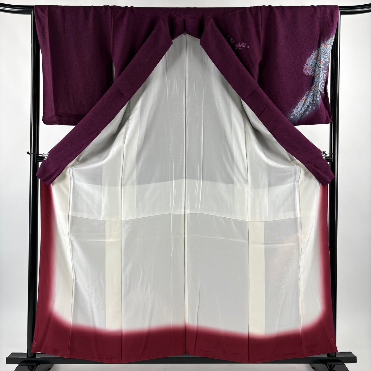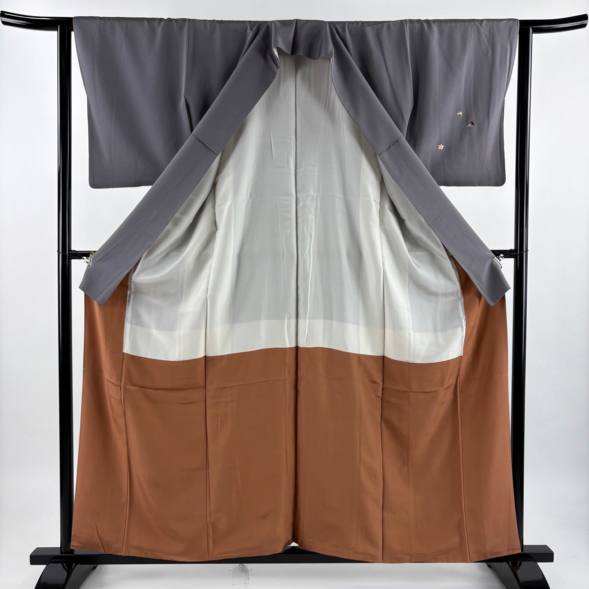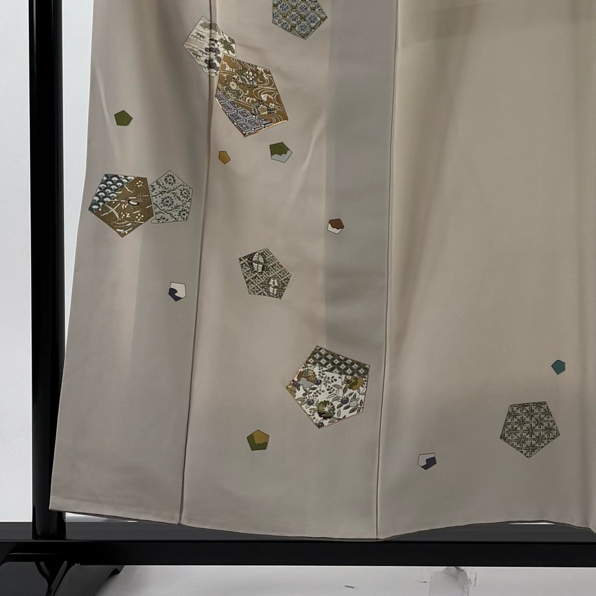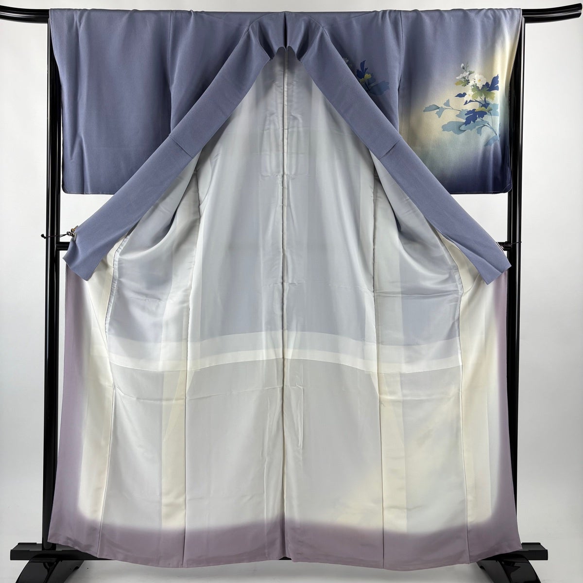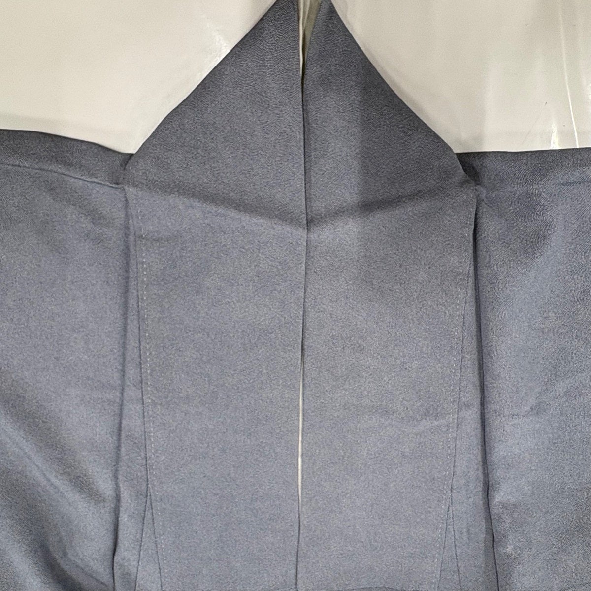 付け下げは訪問着を簡略化した訪問着より格が低くで小紋より格の高いの着物です。 特徴としては仕立て方の違いから訪問着などの一度真っさらな反物を着物の形に仮仕立てした後に柄付けをする絵羽模様とは違い、反物の状態で着用した時に柄付けが全て上を向くように書く事により左右の身頃や肩から袖にかけての模様が繋がっていない事です。 付け下げの歴史は他の着物に比べ浅く、戦時下に華美な訪問着が禁止された事で生まれた着物で、その後訪問着に比べ比較的安価で、それでいて着用シーンも訪問着とほぼ変わらないため大変好評になり、付け下げ訪問着と呼ばれる華やかな柄付けのものも考案された事により普及していきました。