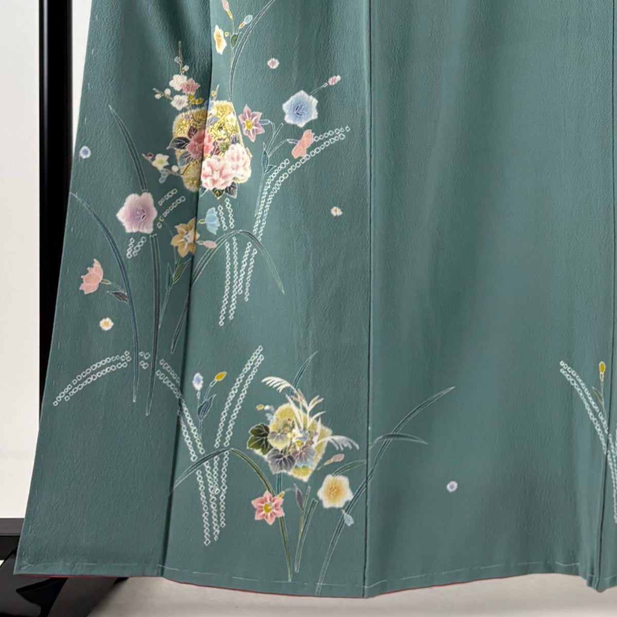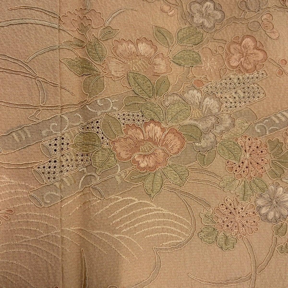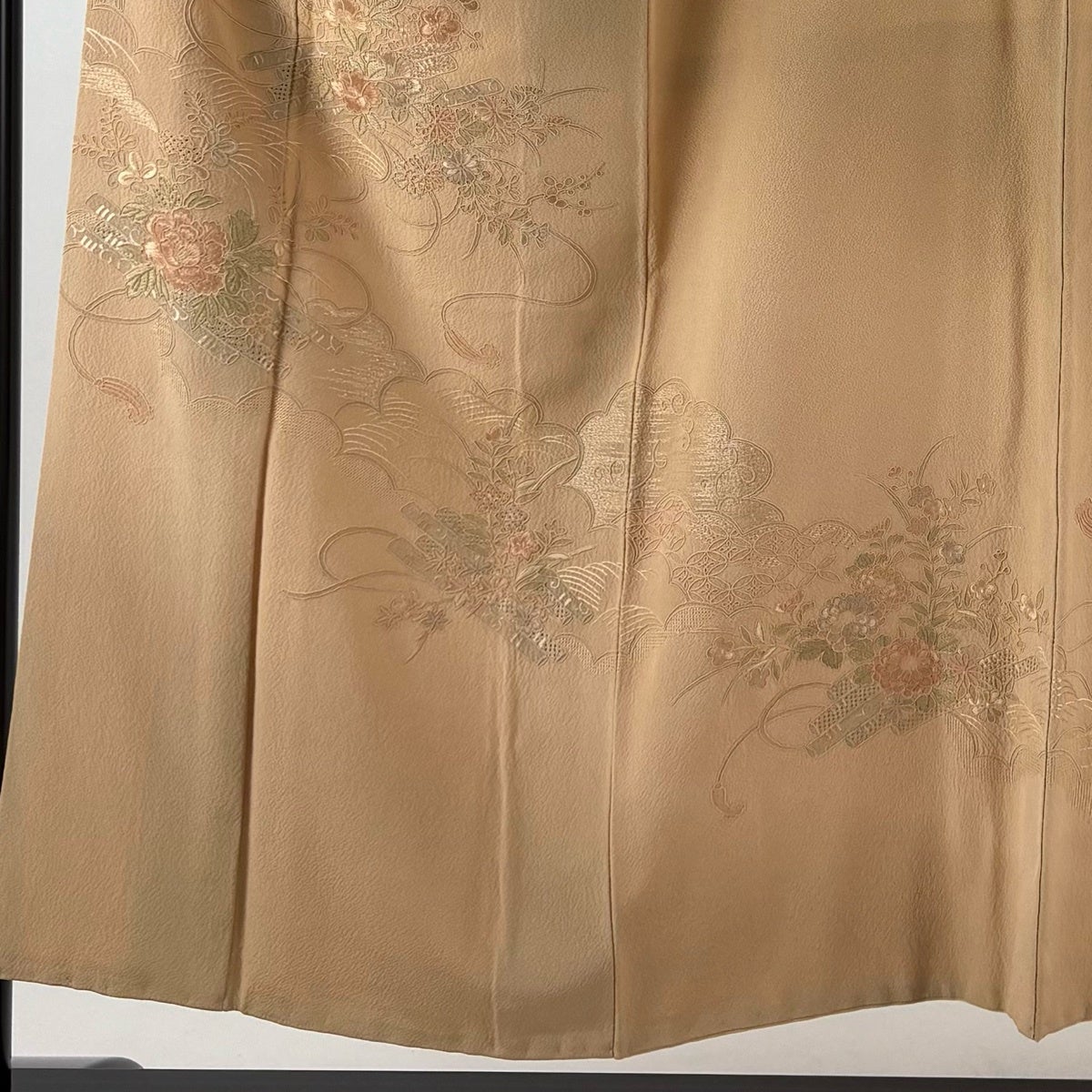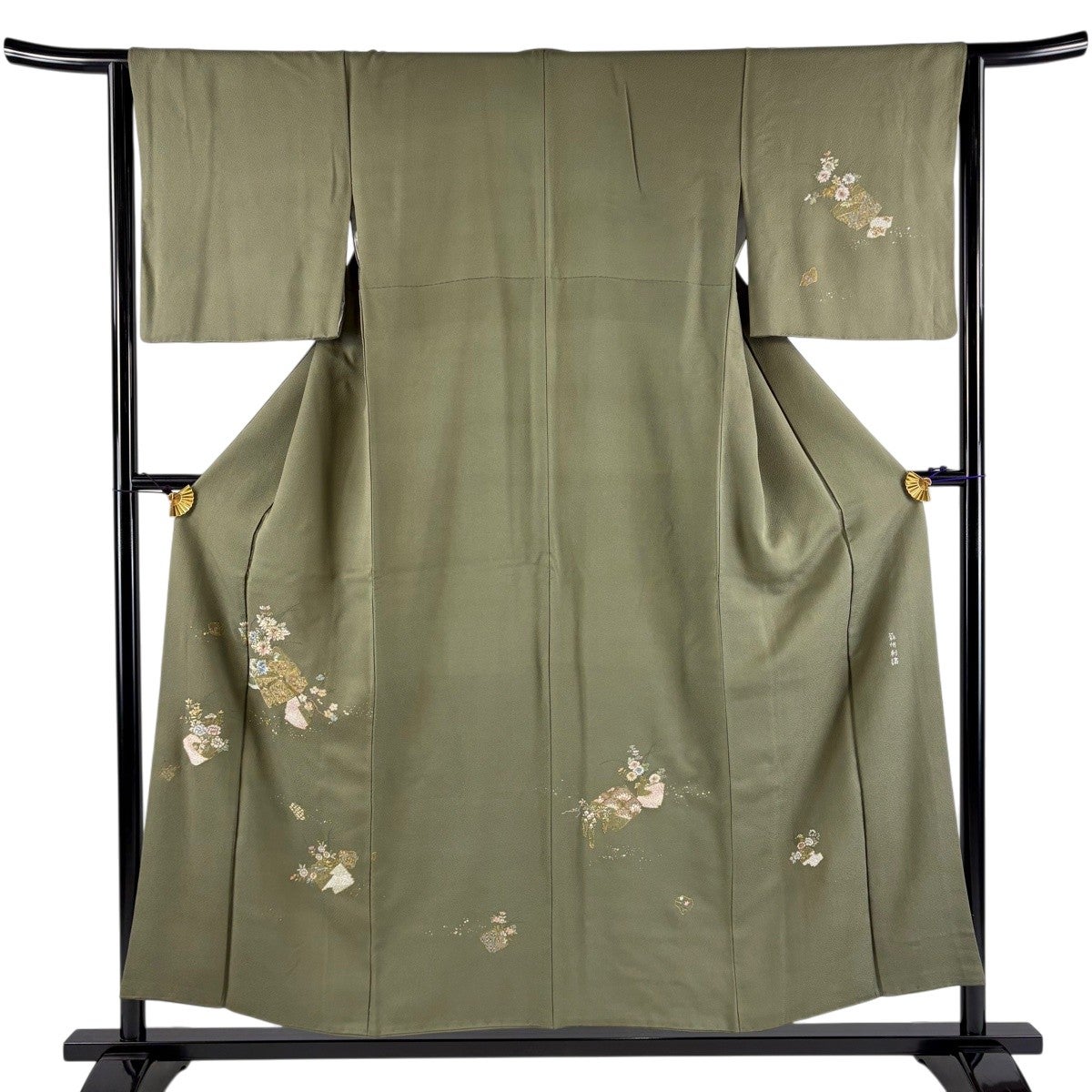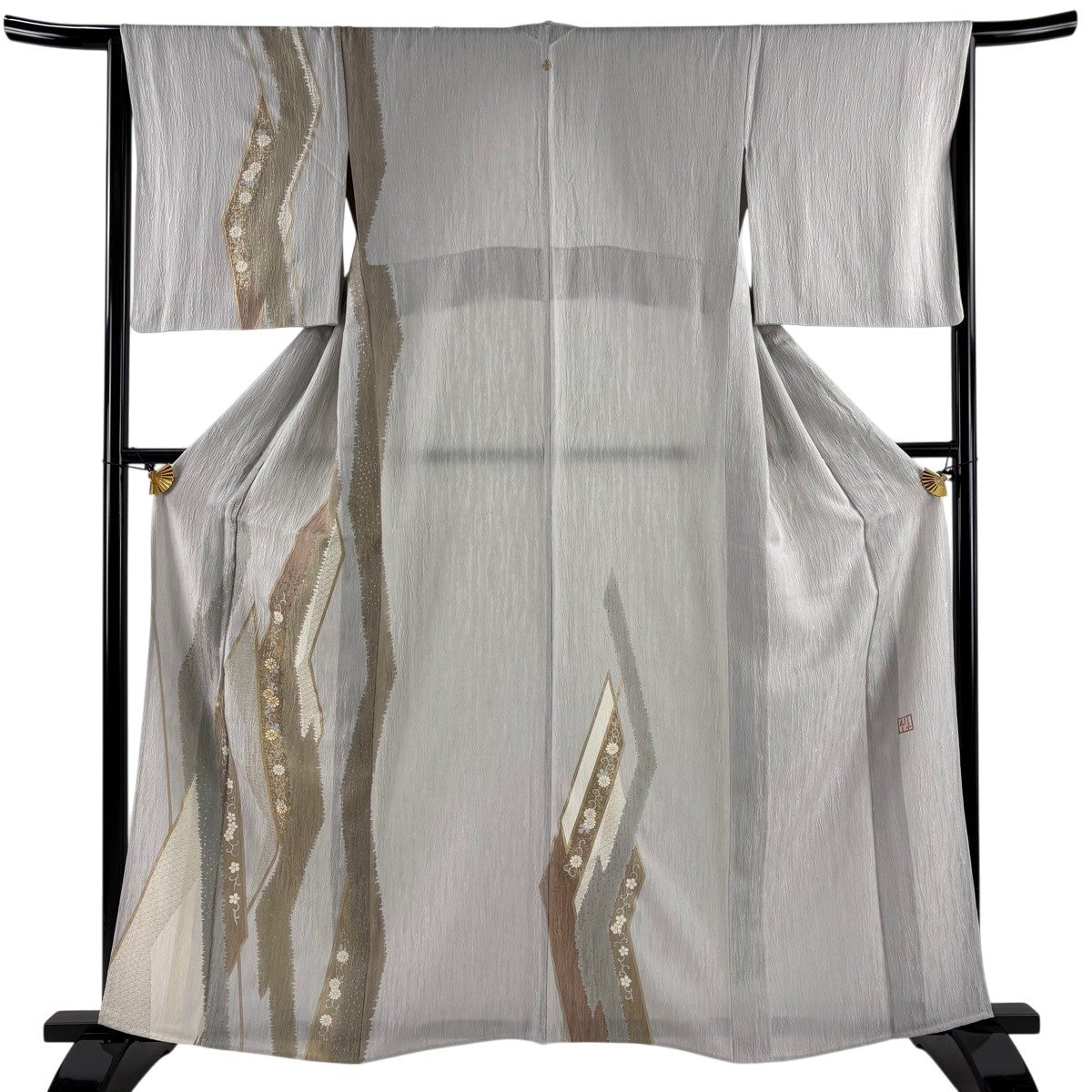 付け下げは訪問着を簡略化した訪問着より格が低くで小紋より格の高いの着物です。 特徴としては仕立て方の違いから訪問着などの一度真っさらな反物を着物の形に仮仕立てした後に柄付けをする絵羽模様とは違い、反物の状態で着用した時に柄付けが全て上を向くように書く事により左右の身頃や肩から袖にかけての模様が繋がっていない事です。 付け下げの歴史は他の着物に比べ浅く、戦時下に華美な訪問着が禁止された事で生まれた着物で、その後訪問着に比べ比較的安価で、それでいて着用シーンも訪問着とほぼ変わらないため大変好評になり、付け下げ訪問着と呼ばれる華やかな柄付けのものも考案された事により普及していきました。