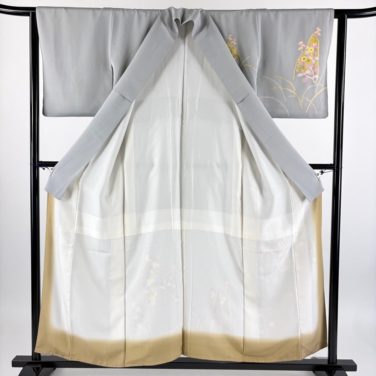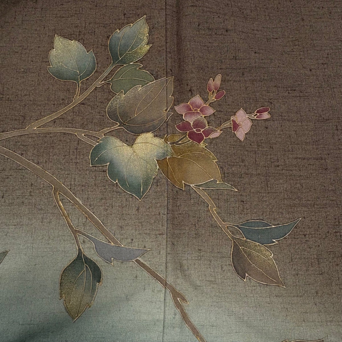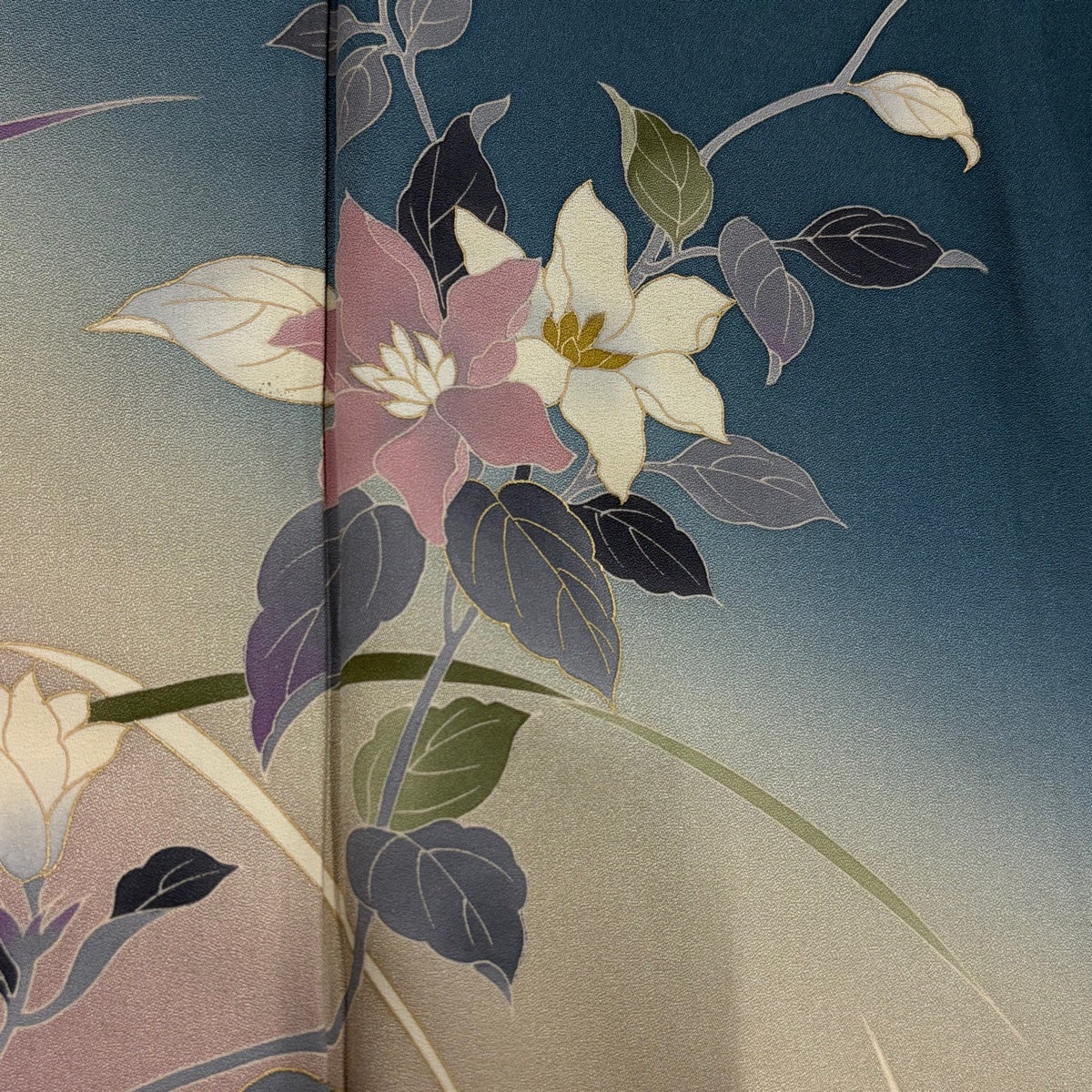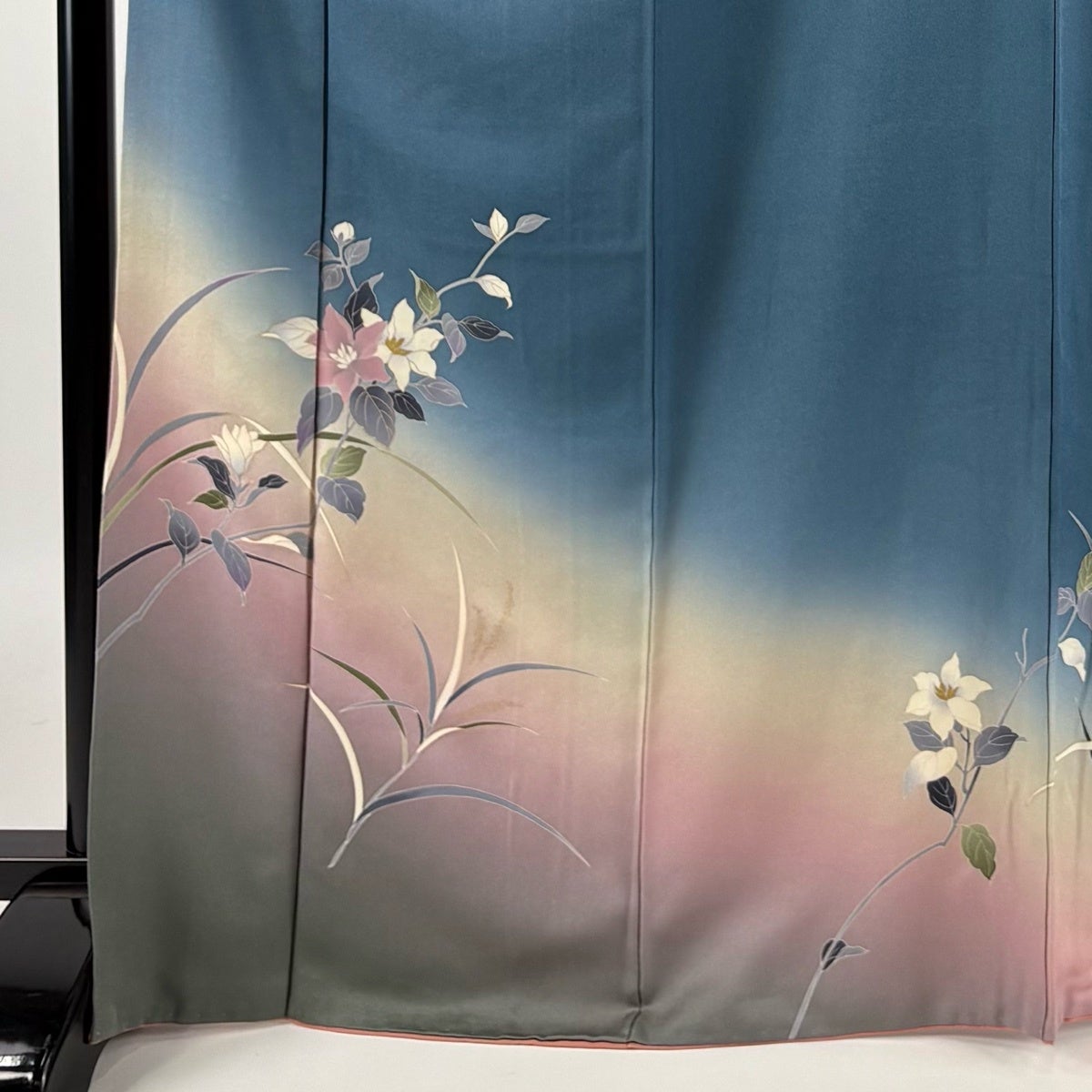 付け下げは訪問着を簡略化した訪問着より格が低くで小紋より格の高いの着物です。 特徴としては仕立て方の違いから訪問着などの一度真っさらな反物を着物の形に仮仕立てした後に柄付けをする絵羽模様とは違い、反物の状態で着用した時に柄付けが全て上を向くように書く事により左右の身頃や肩から袖にかけての模様が繋がっていない事です。 付け下げの歴史は他の着物に比べ浅く、戦時下に華美な訪問着が禁止された事で生まれた着物で、その後訪問着に比べ比較的安価で、それでいて着用シーンも訪問着とほぼ変わらないため大変好評になり、付け下げ訪問着と呼ばれる華やかな柄付けのものも考案された事により普及していきました。