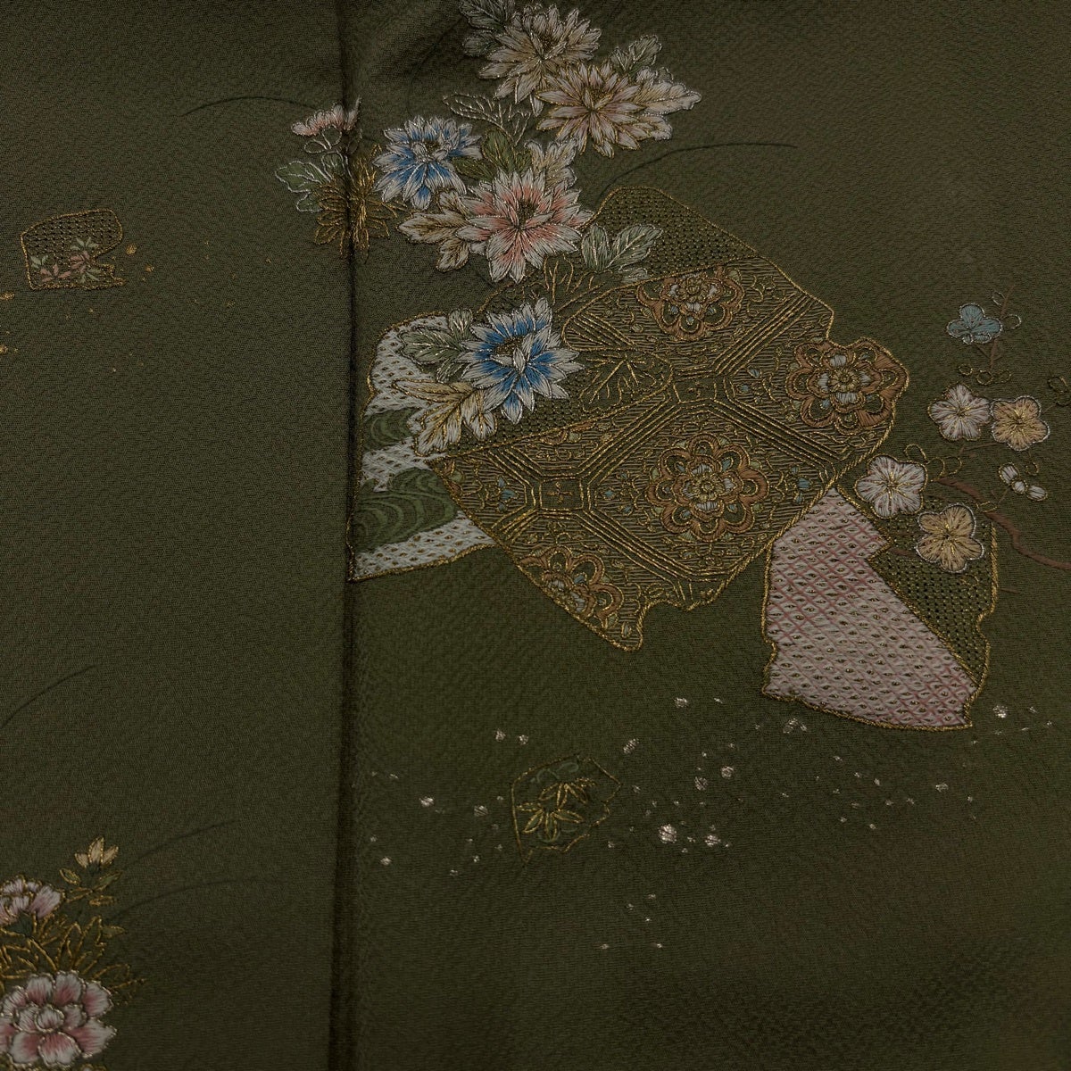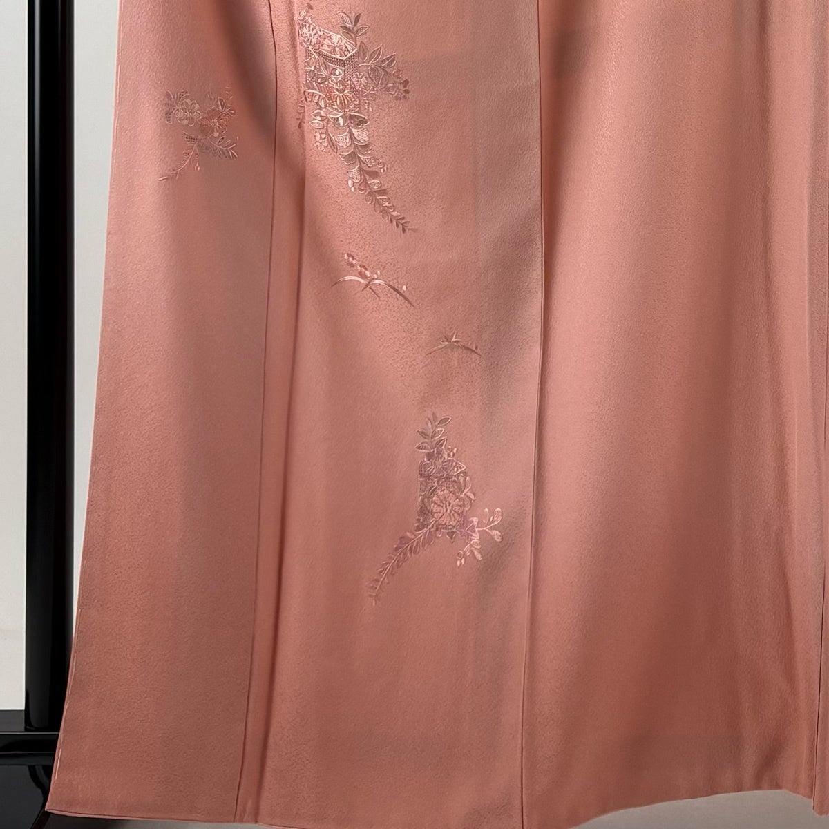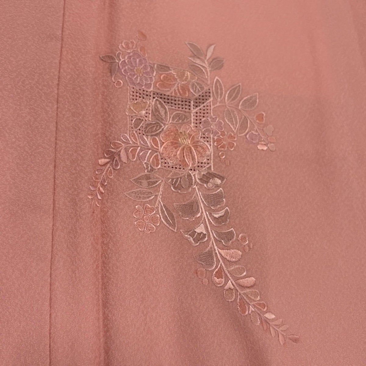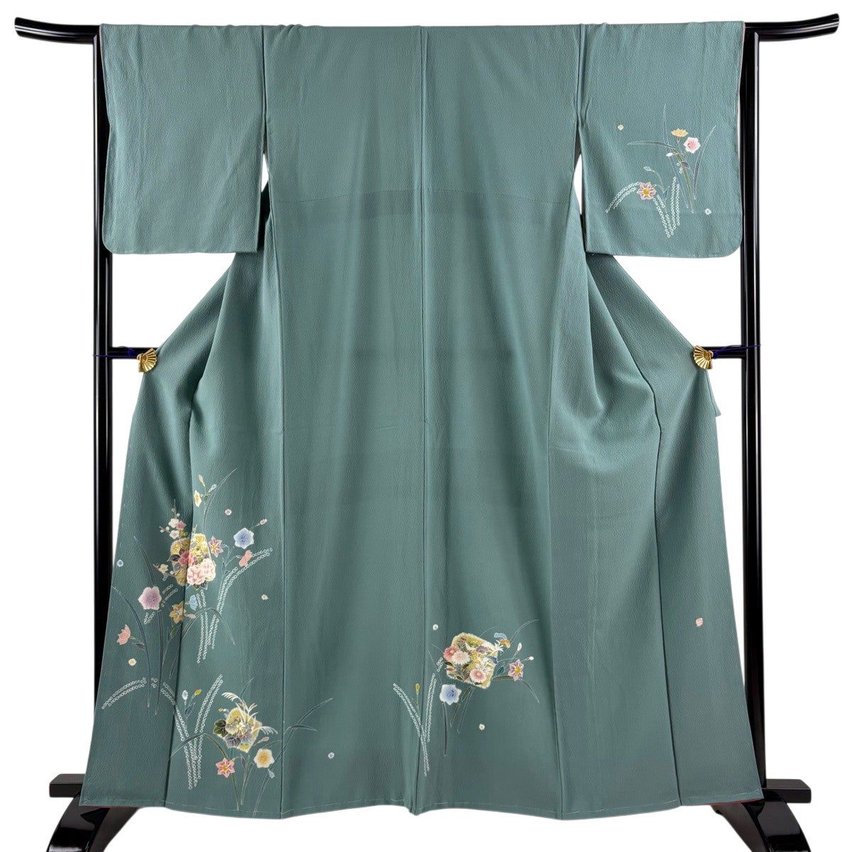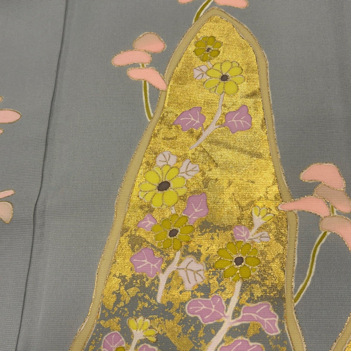 付け下げは訪問着を簡略化した訪問着より格が低くで小紋より格の高いの着物です。 特徴としては仕立て方の違いから訪問着などの一度真っさらな反物を着物の形に仮仕立てした後に柄付けをする絵羽模様とは違い、反物の状態で着用した時に柄付けが全て上を向くように書く事により左右の身頃や肩から袖にかけての模様が繋がっていない事です。 付け下げの歴史は他の着物に比べ浅く、戦時下に華美な訪問着が禁止された事で生まれた着物で、その後訪問着に比べ比較的安価で、それでいて着用シーンも訪問着とほぼ変わらないため大変好評になり、付け下げ訪問着と呼ばれる華やかな柄付けのものも考案された事により普及していきました。