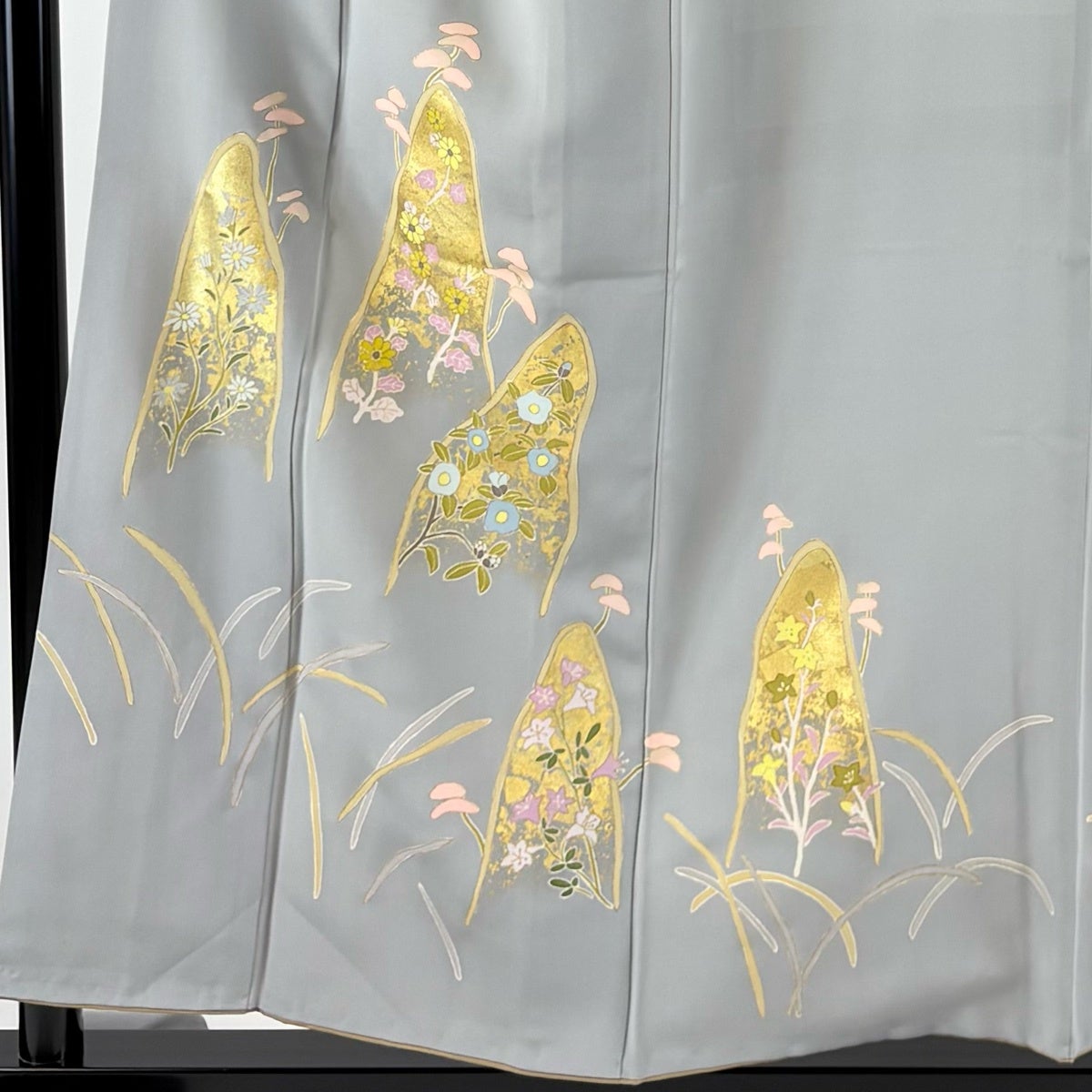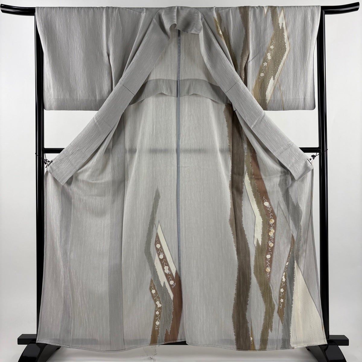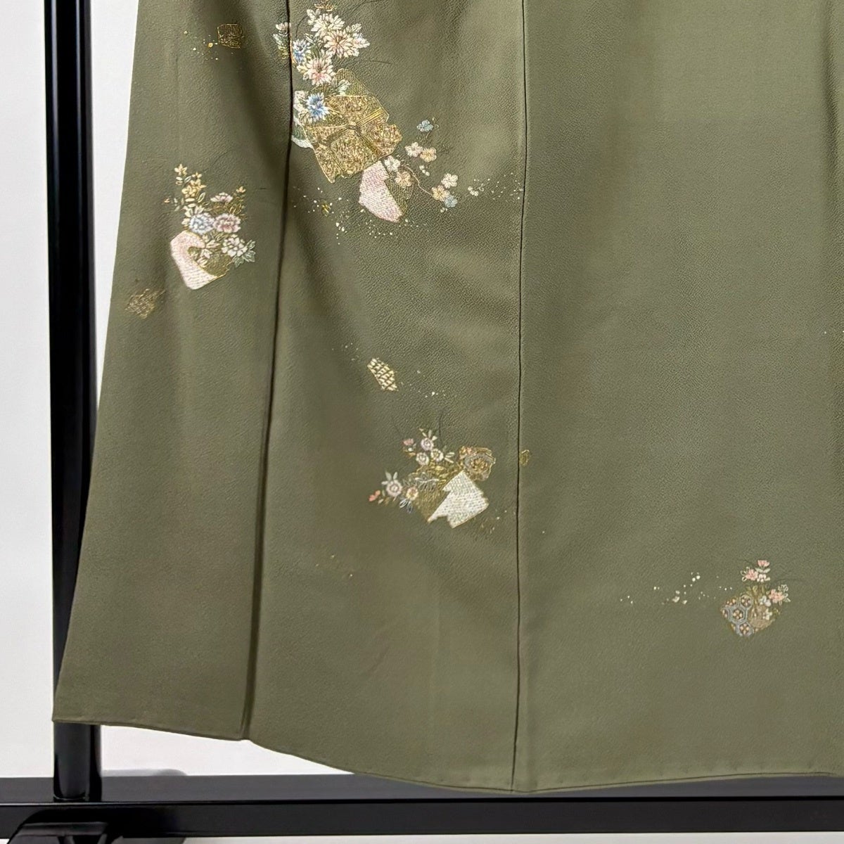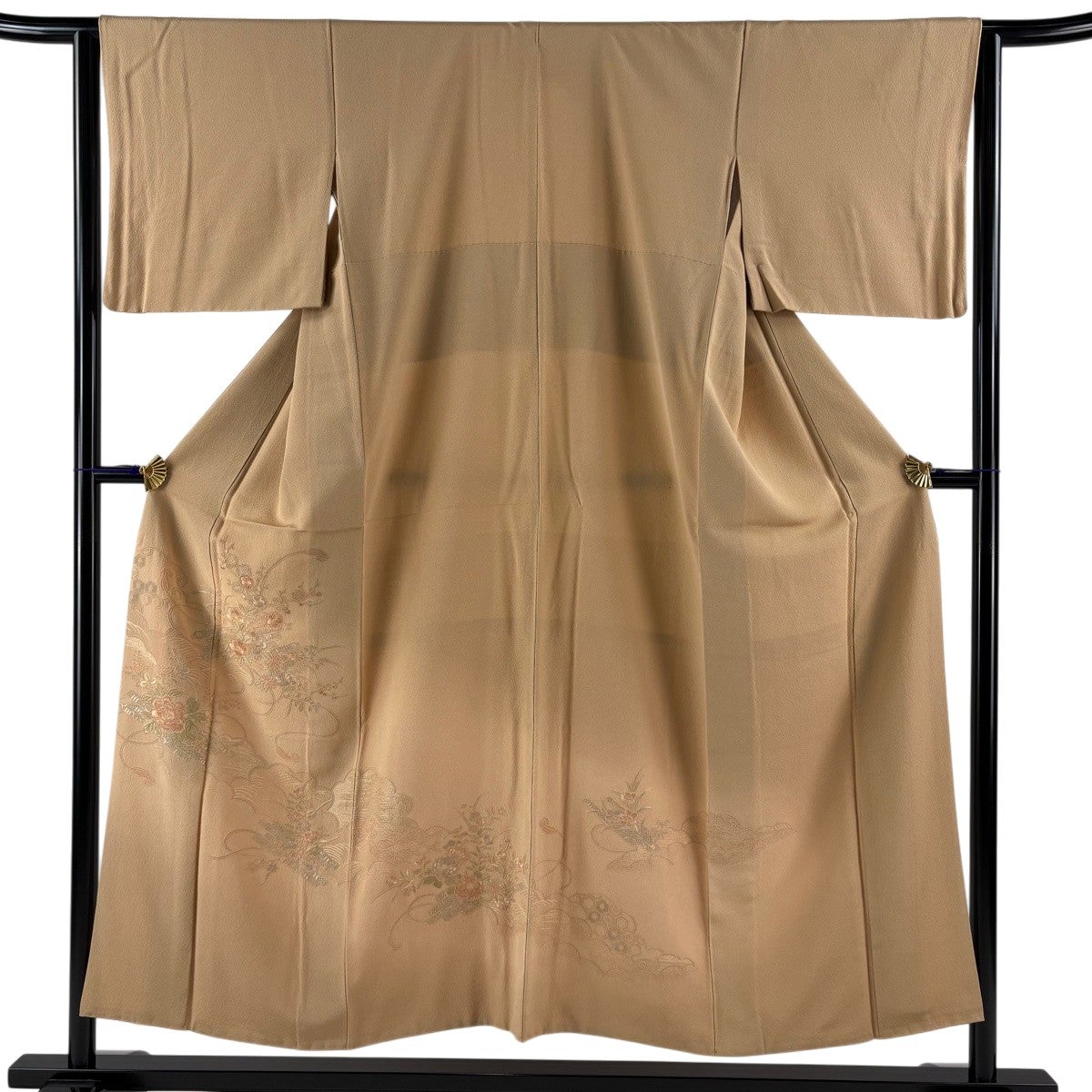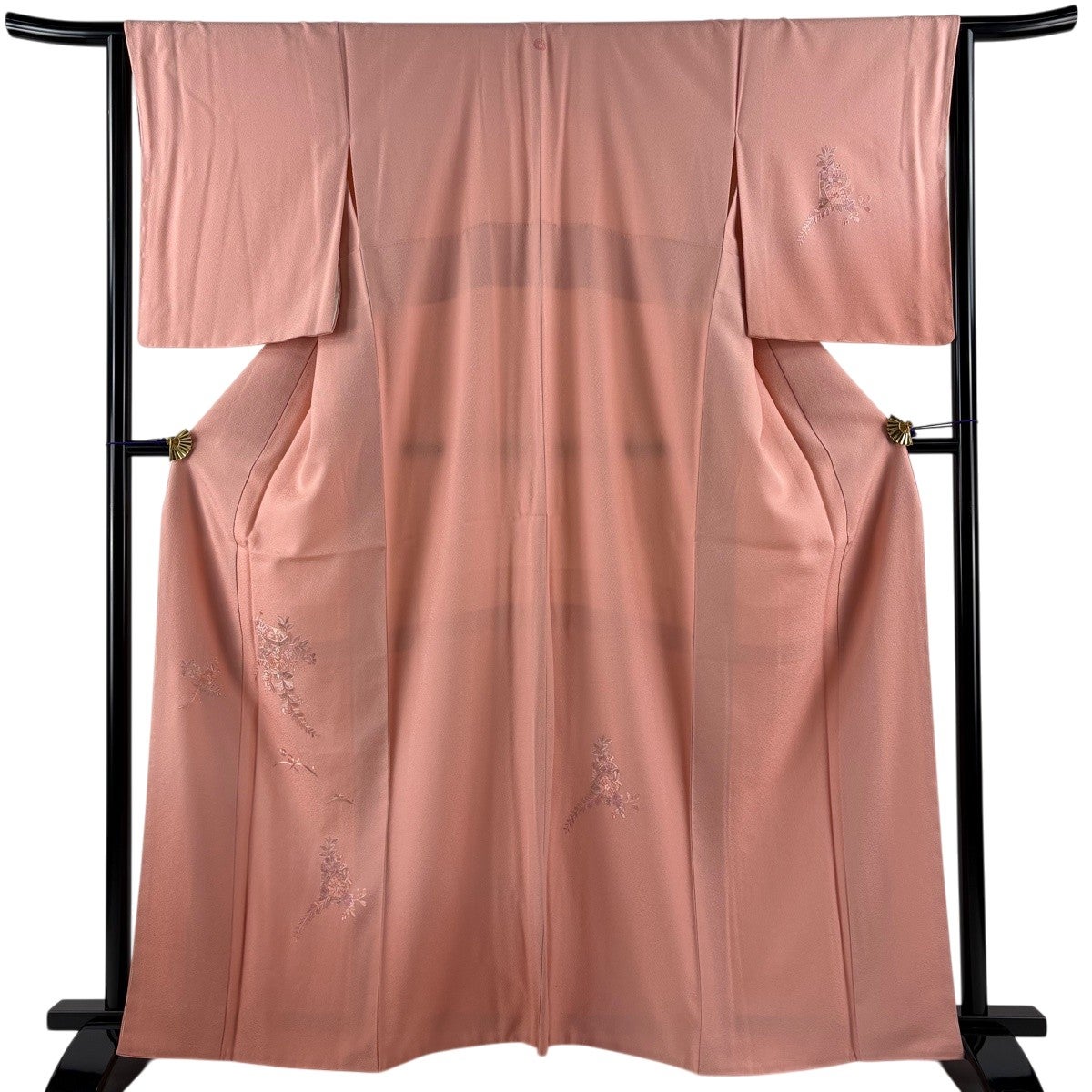 付け下げは訪問着を簡略化した訪問着より格が低くで小紋より格の高いの着物です。 特徴としては仕立て方の違いから訪問着などの一度真っさらな反物を着物の形に仮仕立てした後に柄付けをする絵羽模様とは違い、反物の状態で着用した時に柄付けが全て上を向くように書く事により左右の身頃や肩から袖にかけての模様が繋がっていない事です。 付け下げの歴史は他の着物に比べ浅く、戦時下に華美な訪問着が禁止された事で生まれた着物で、その後訪問着に比べ比較的安価で、それでいて着用シーンも訪問着とほぼ変わらないため大変好評になり、付け下げ訪問着と呼ばれる華やかな柄付けのものも考案された事により普及していきました。