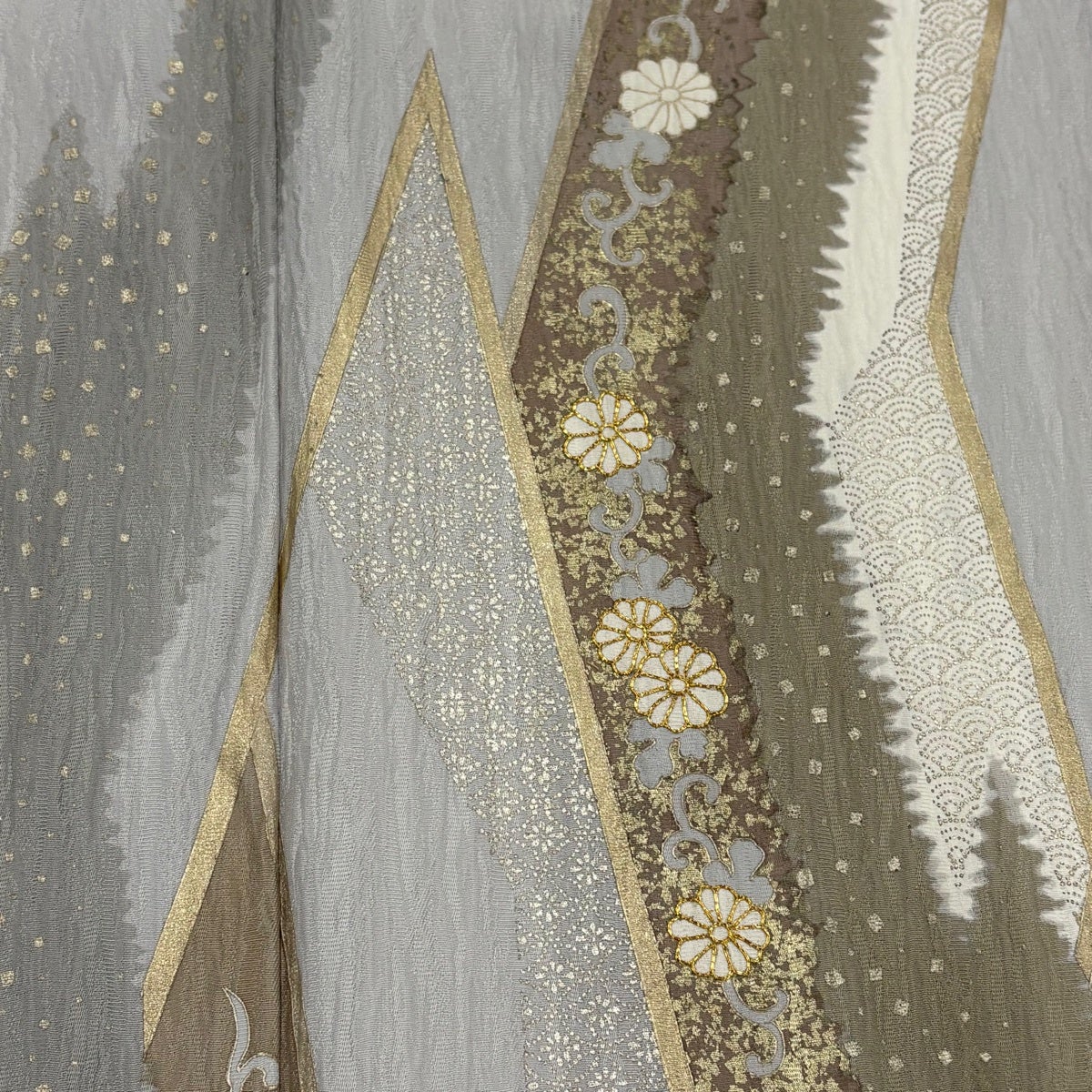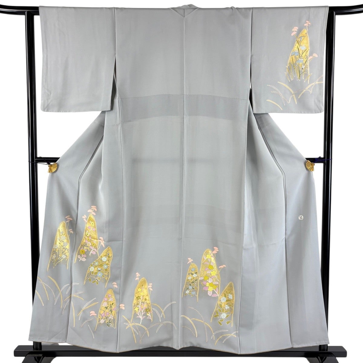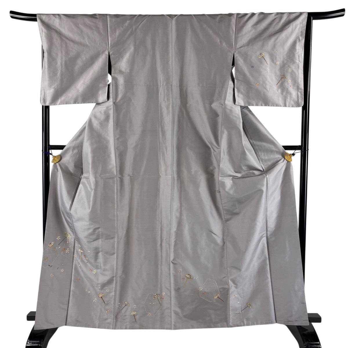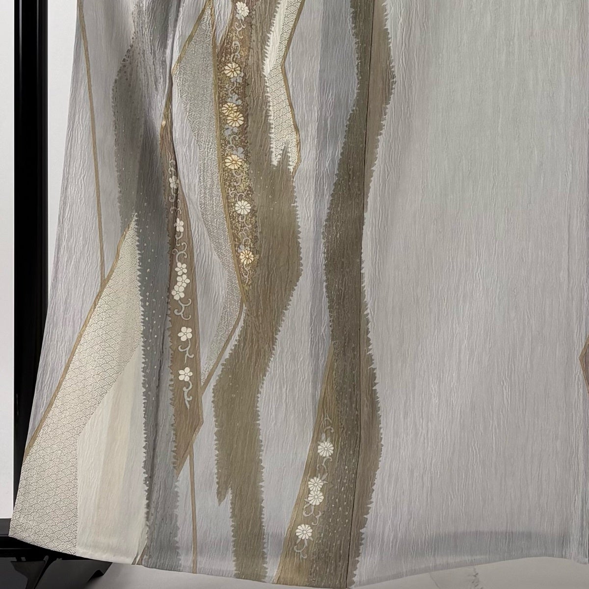 付け下げは訪問着を簡略化した訪問着より格が低くで小紋より格の高いの着物です。 特徴としては仕立て方の違いから訪問着などの一度真っさらな反物を着物の形に仮仕立てした後に柄付けをする絵羽模様とは違い、反物の状態で着用した時に柄付けが全て上を向くように書く事により左右の身頃や肩から袖にかけての模様が繋がっていない事です。 付け下げの歴史は他の着物に比べ浅く、戦時下に華美な訪問着が禁止された事で生まれた着物で、その後訪問着に比べ比較的安価で、それでいて着用シーンも訪問着とほぼ変わらないため大変好評になり、付け下げ訪問着と呼ばれる華やかな柄付けのものも考案された事により普及していきました。