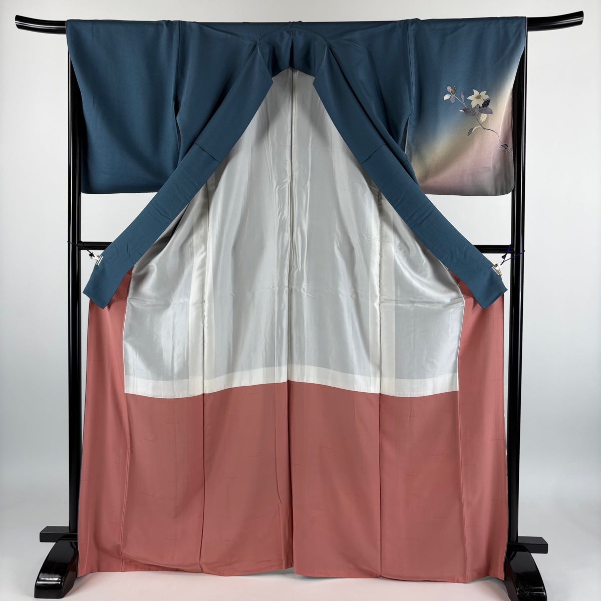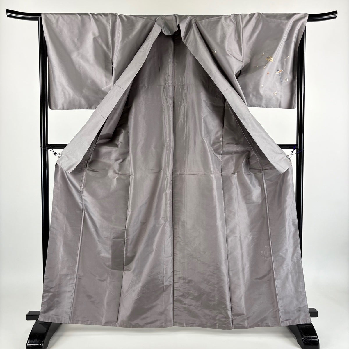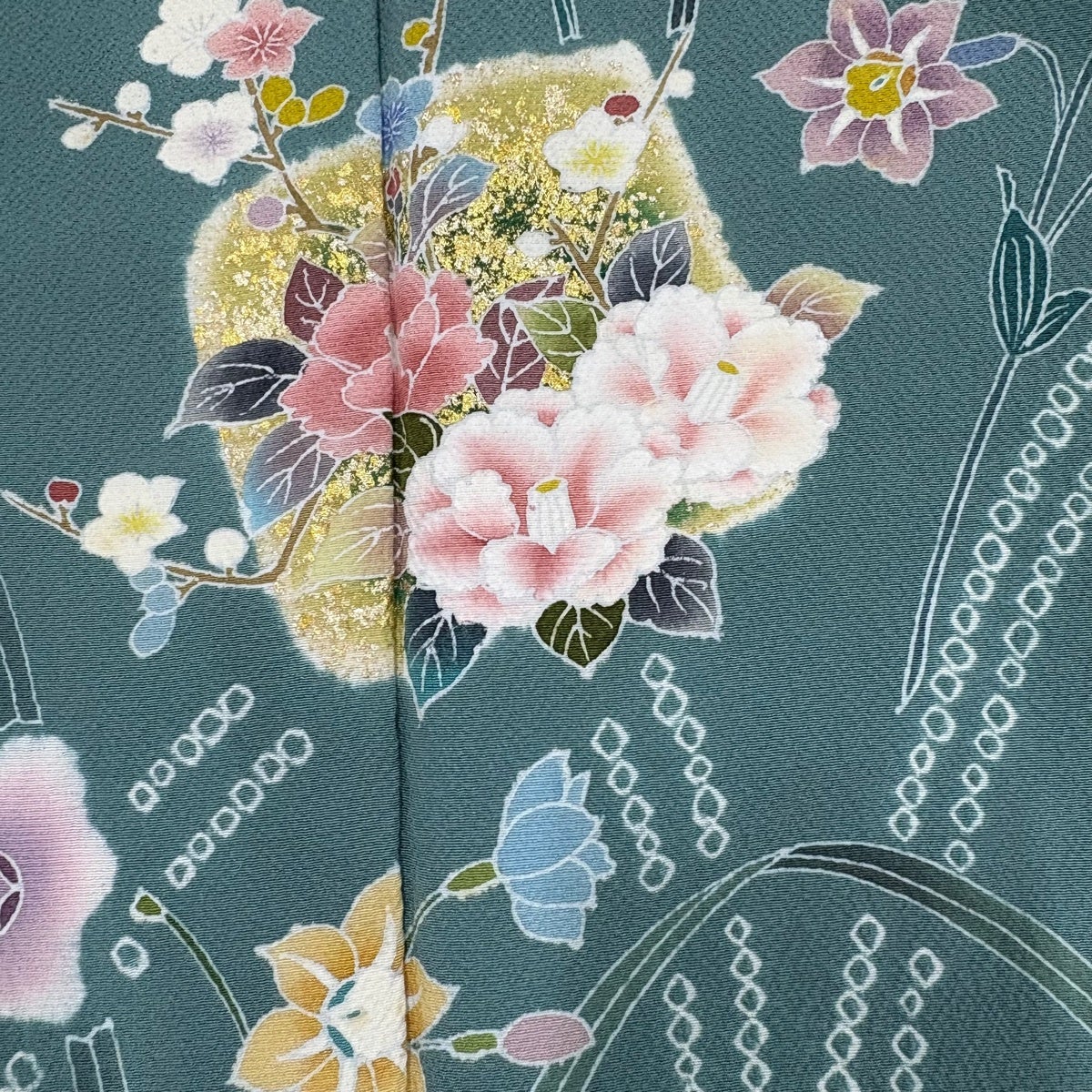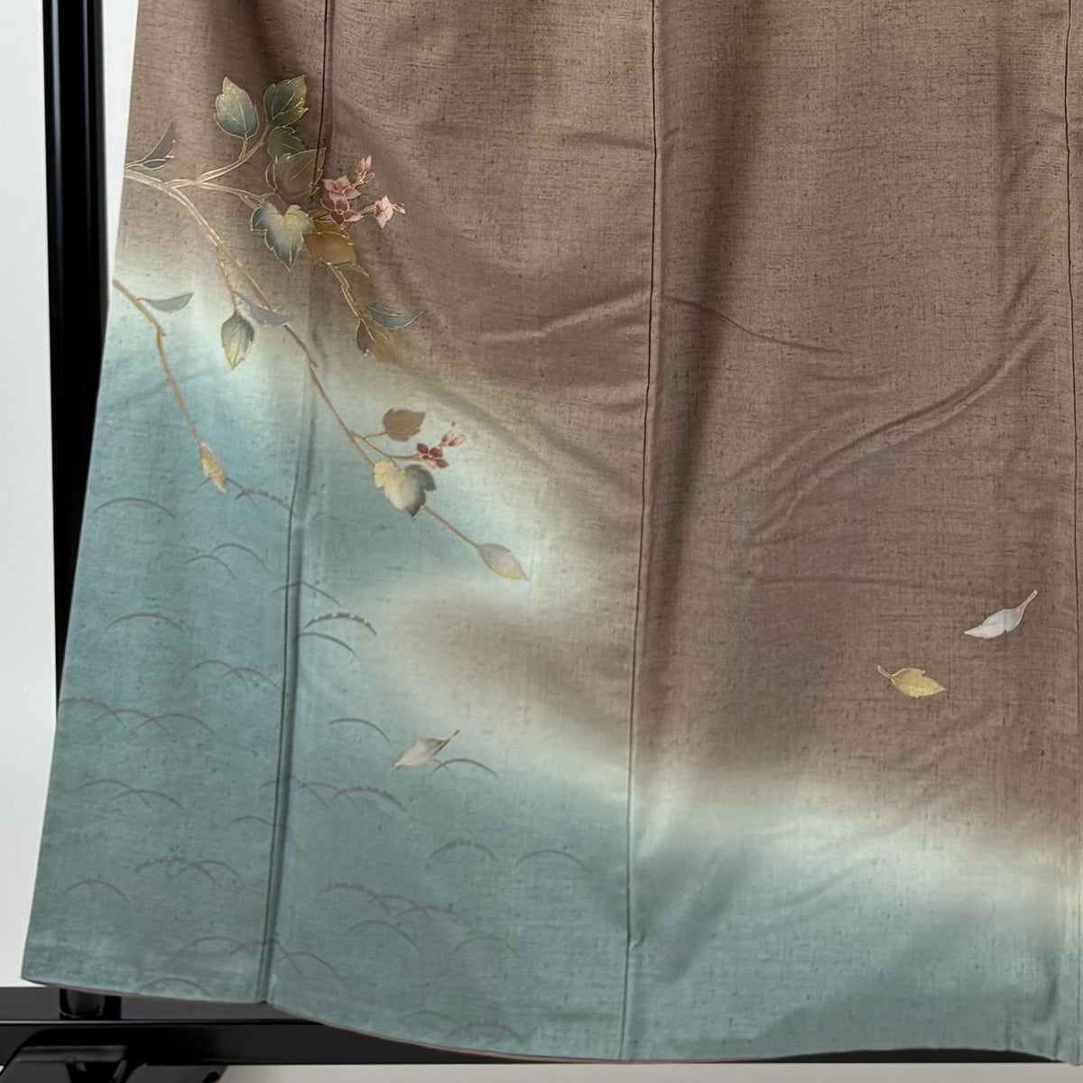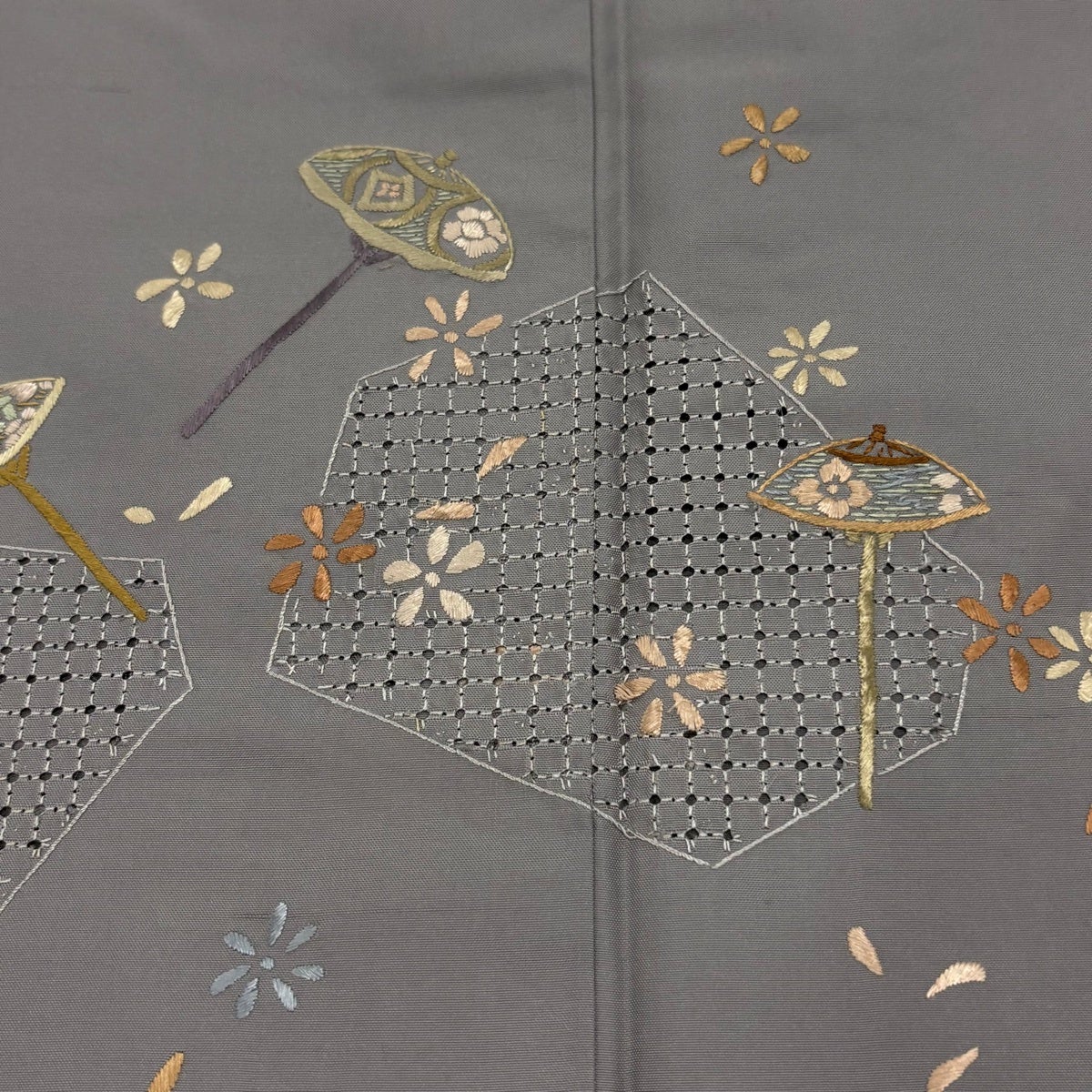 付け下げは訪問着を簡略化した訪問着より格が低くで小紋より格の高いの着物です。 特徴としては仕立て方の違いから訪問着などの一度真っさらな反物を着物の形に仮仕立てした後に柄付けをする絵羽模様とは違い、反物の状態で着用した時に柄付けが全て上を向くように書く事により左右の身頃や肩から袖にかけての模様が繋がっていない事です。 付け下げの歴史は他の着物に比べ浅く、戦時下に華美な訪問着が禁止された事で生まれた着物で、その後訪問着に比べ比較的安価で、それでいて着用シーンも訪問着とほぼ変わらないため大変好評になり、付け下げ訪問着と呼ばれる華やかな柄付けのものも考案された事により普及していきました。