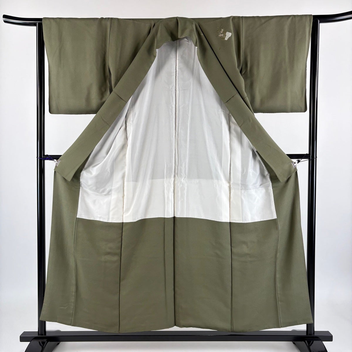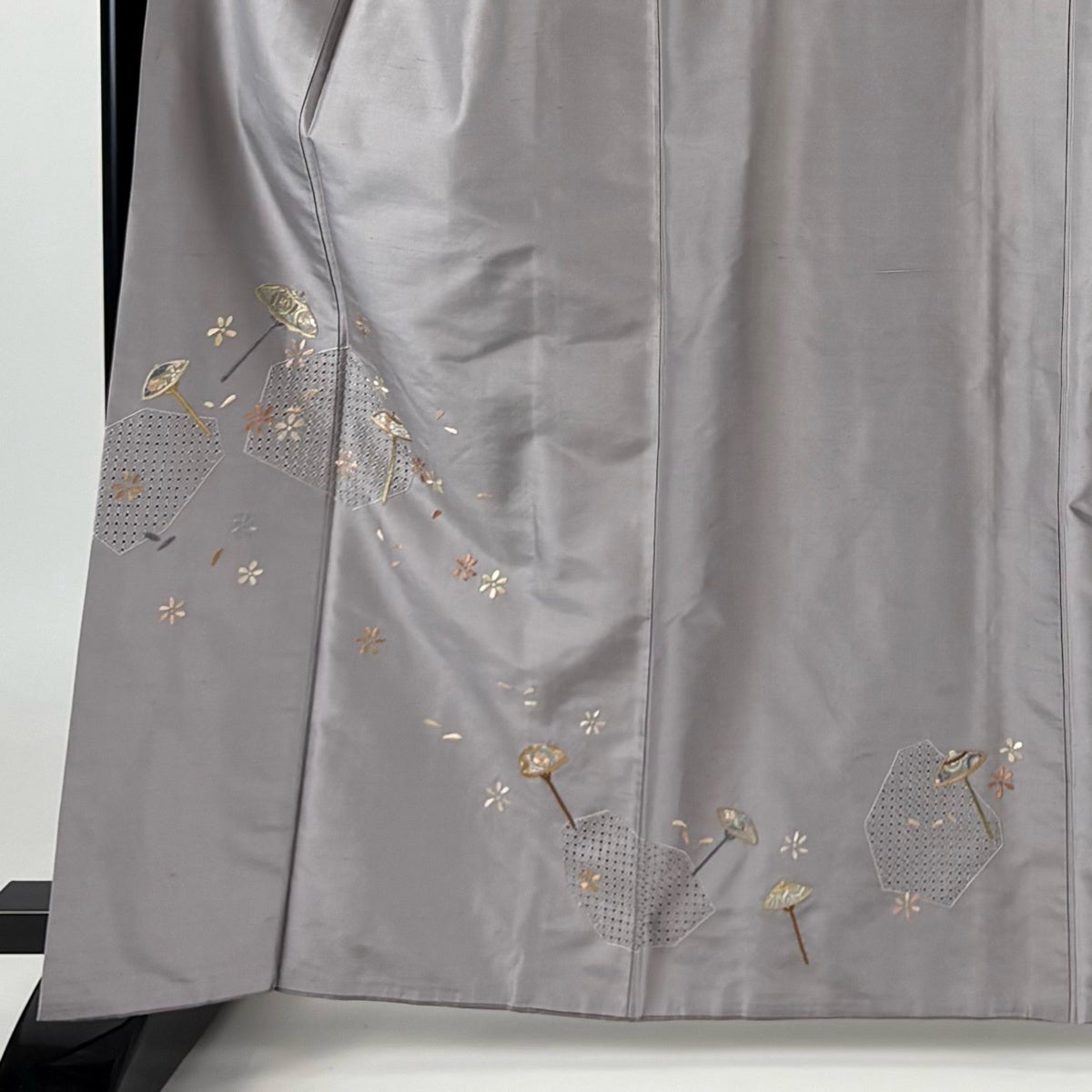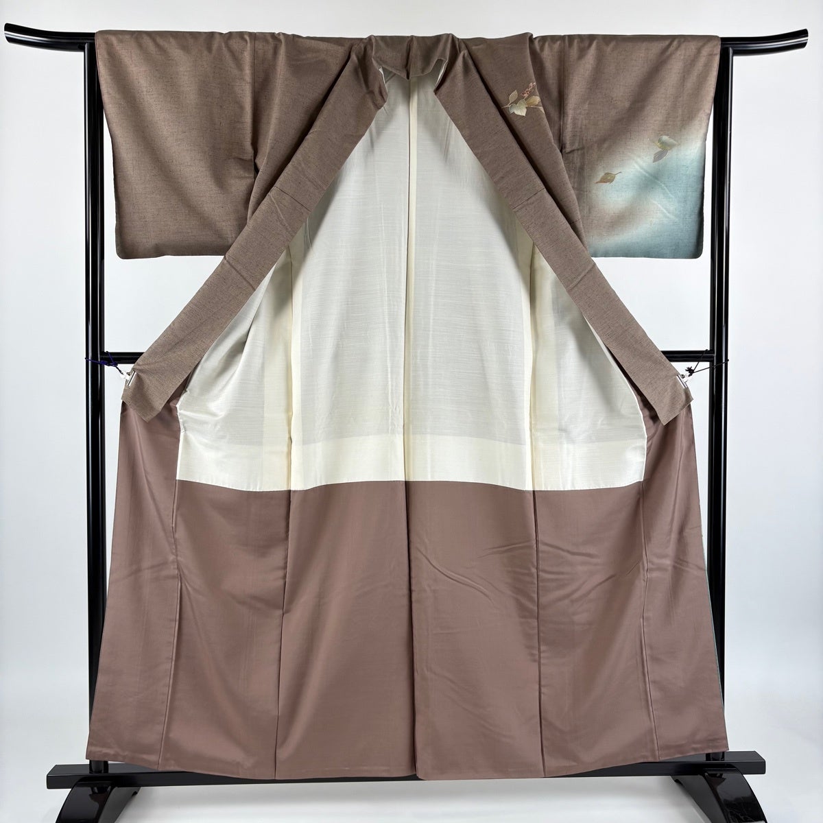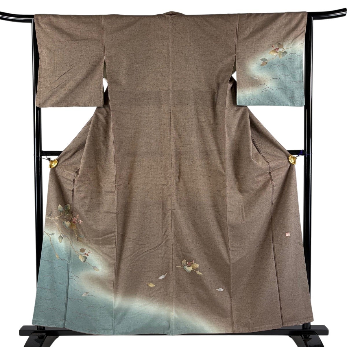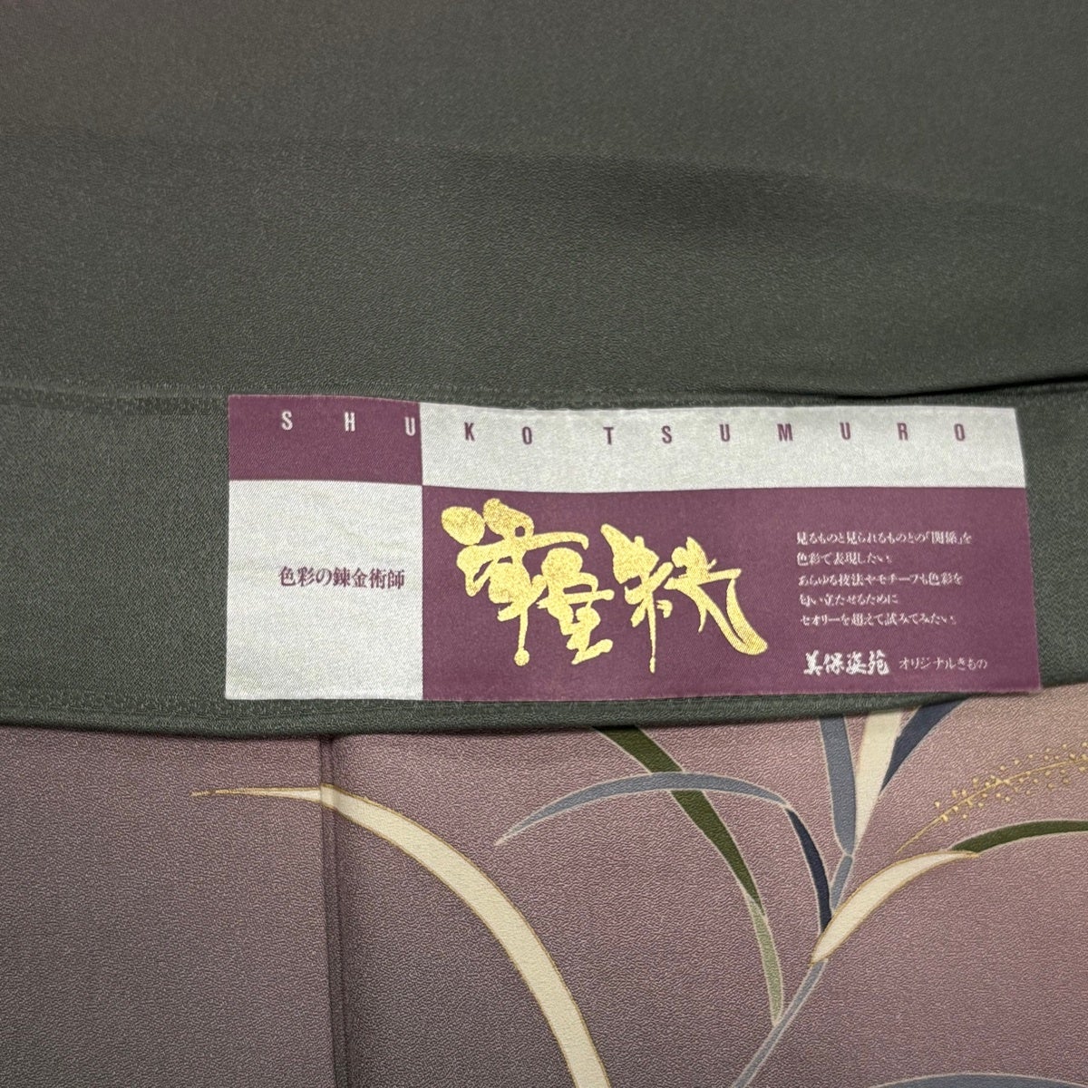 付け下げは訪問着を簡略化した訪問着より格が低くで小紋より格の高いの着物です。 特徴としては仕立て方の違いから訪問着などの一度真っさらな反物を着物の形に仮仕立てした後に柄付けをする絵羽模様とは違い、反物の状態で着用した時に柄付けが全て上を向くように書く事により左右の身頃や肩から袖にかけての模様が繋がっていない事です。 付け下げの歴史は他の着物に比べ浅く、戦時下に華美な訪問着が禁止された事で生まれた着物で、その後訪問着に比べ比較的安価で、それでいて着用シーンも訪問着とほぼ変わらないため大変好評になり、付け下げ訪問着と呼ばれる華やかな柄付けのものも考案された事により普及していきました。