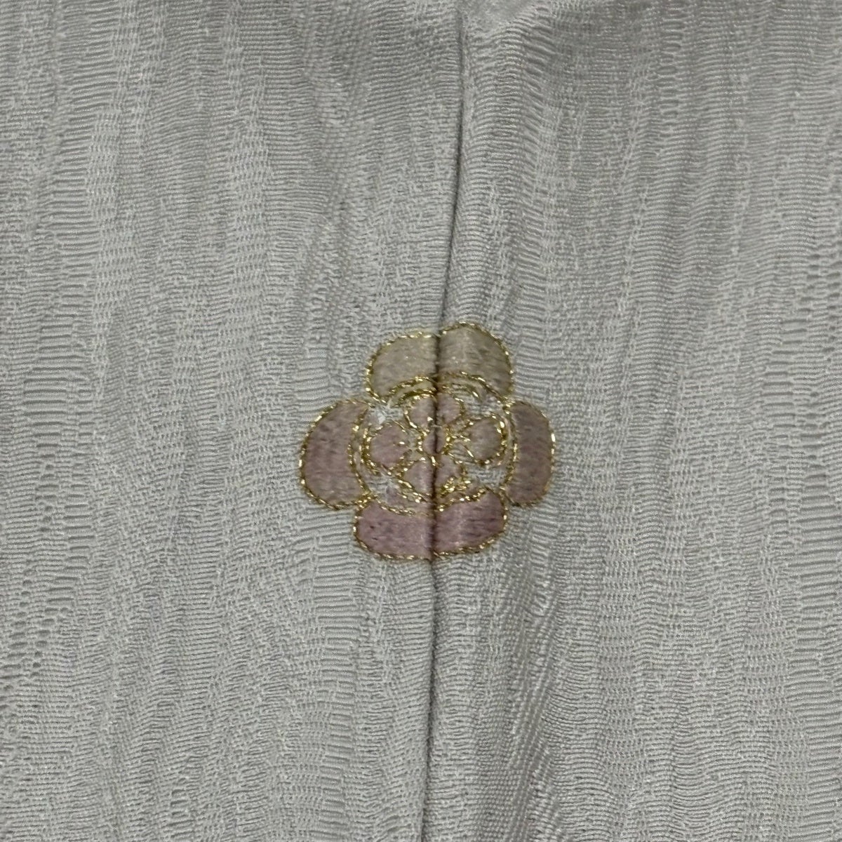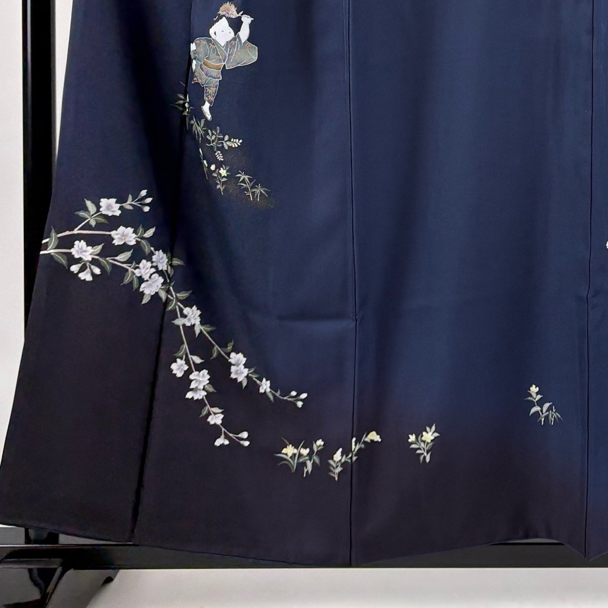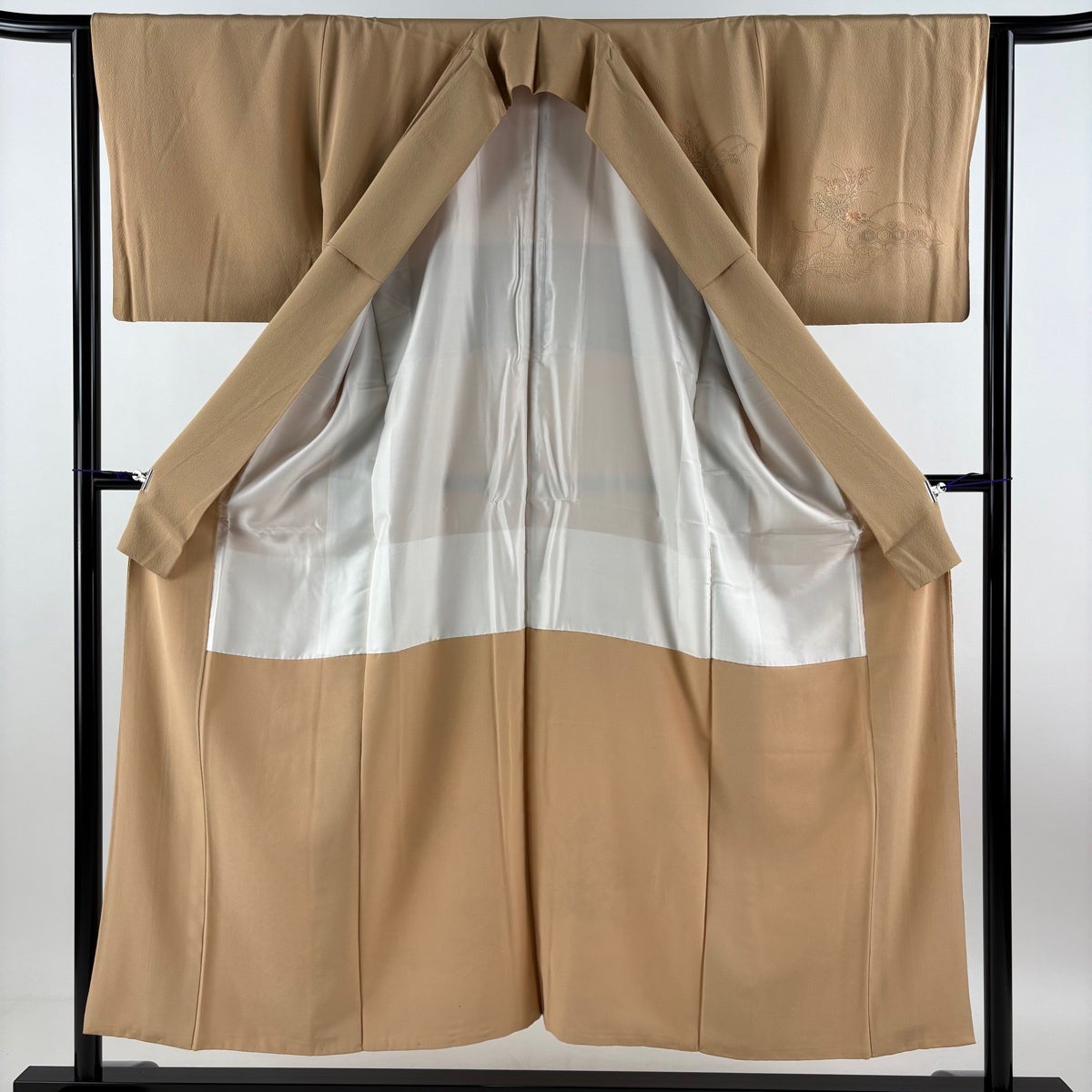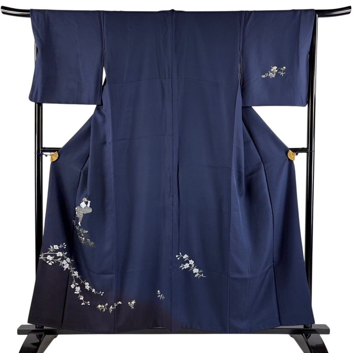 付け下げは訪問着を簡略化した訪問着より格が低くで小紋より格の高いの着物です。 特徴としては仕立て方の違いから訪問着などの一度真っさらな反物を着物の形に仮仕立てした後に柄付けをする絵羽模様とは違い、反物の状態で着用した時に柄付けが全て上を向くように書く事により左右の身頃や肩から袖にかけての模様が繋がっていない事です。 付け下げの歴史は他の着物に比べ浅く、戦時下に華美な訪問着が禁止された事で生まれた着物で、その後訪問着に比べ比較的安価で、それでいて着用シーンも訪問着とほぼ変わらないため大変好評になり、付け下げ訪問着と呼ばれる華やかな柄付けのものも考案された事により普及していきました。