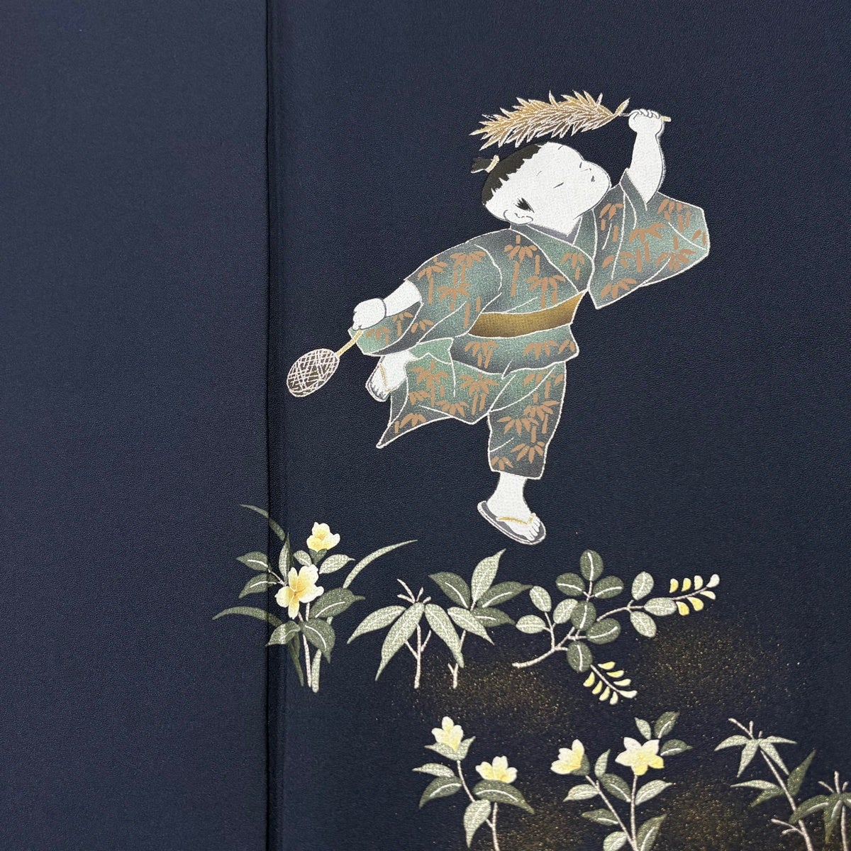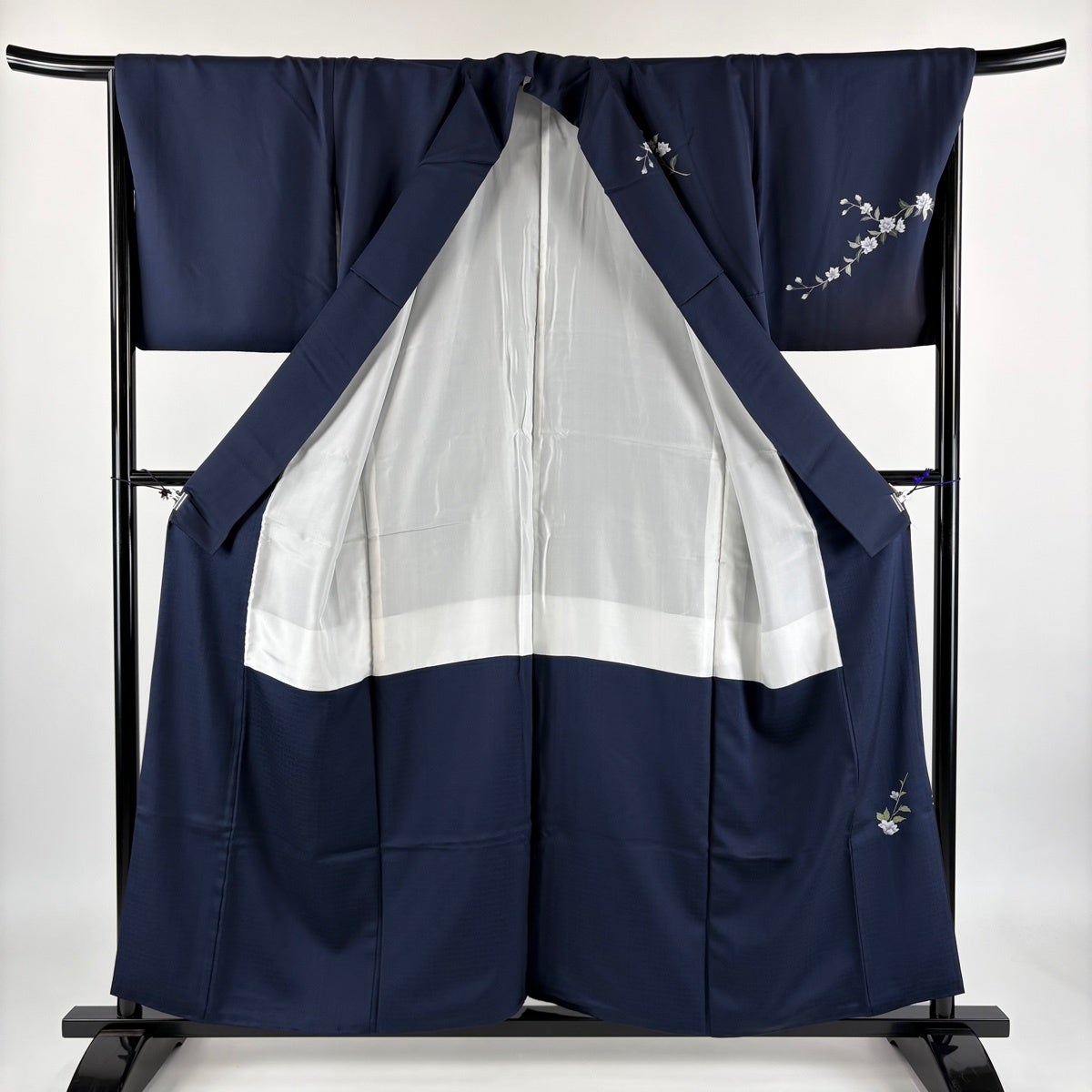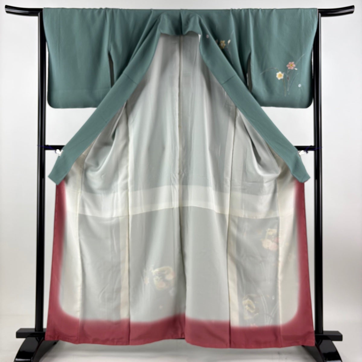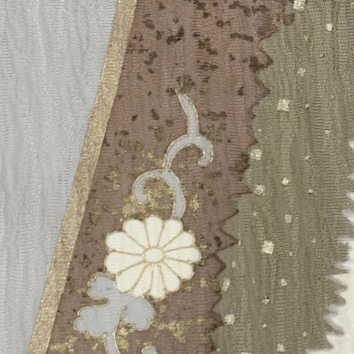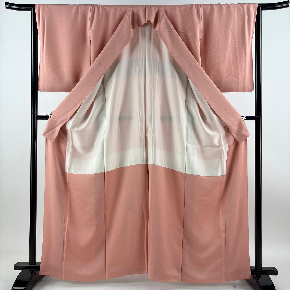 付け下げは訪問着を簡略化した訪問着より格が低くで小紋より格の高いの着物です。 特徴としては仕立て方の違いから訪問着などの一度真っさらな反物を着物の形に仮仕立てした後に柄付けをする絵羽模様とは違い、反物の状態で着用した時に柄付けが全て上を向くように書く事により左右の身頃や肩から袖にかけての模様が繋がっていない事です。 付け下げの歴史は他の着物に比べ浅く、戦時下に華美な訪問着が禁止された事で生まれた着物で、その後訪問着に比べ比較的安価で、それでいて着用シーンも訪問着とほぼ変わらないため大変好評になり、付け下げ訪問着と呼ばれる華やかな柄付けのものも考案された事により普及していきました。