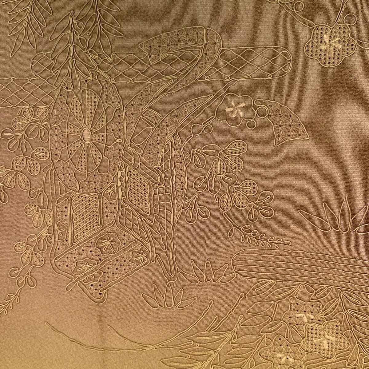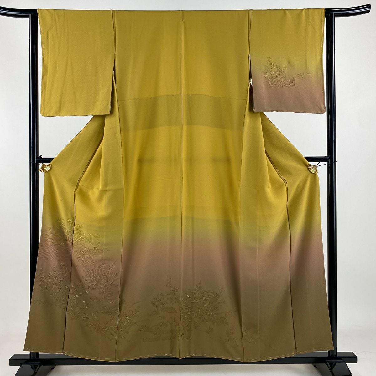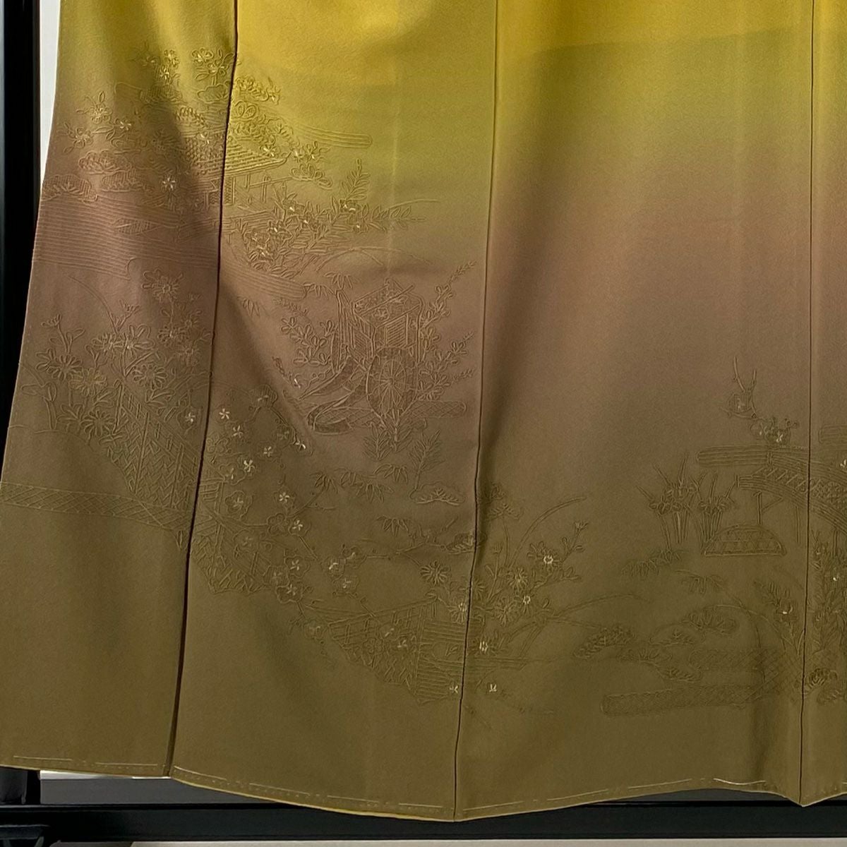 付け下げは訪問着を簡略化した訪問着より格が低くで小紋より格の高いの着物です。 特徴としては仕立て方の違いから訪問着などの一度真っさらな反物を着物の形に仮仕立てした後に柄付けをする絵羽模様とは違い、反物の状態で着用した時に柄付けが全て上を向くように書く事により左右の身頃や肩から袖にかけての模様が繋がっていない事です。 付け下げの歴史は他の着物に比べ浅く、戦時下に華美な訪問着が禁止された事で生まれた着物で、その後訪問着に比べ比較的安価で、それでいて着用シーンも訪問着とほぼ変わらないため大変好評になり、付け下げ訪問着と呼ばれる華やかな柄付けのものも考案された事により普及していきました。
