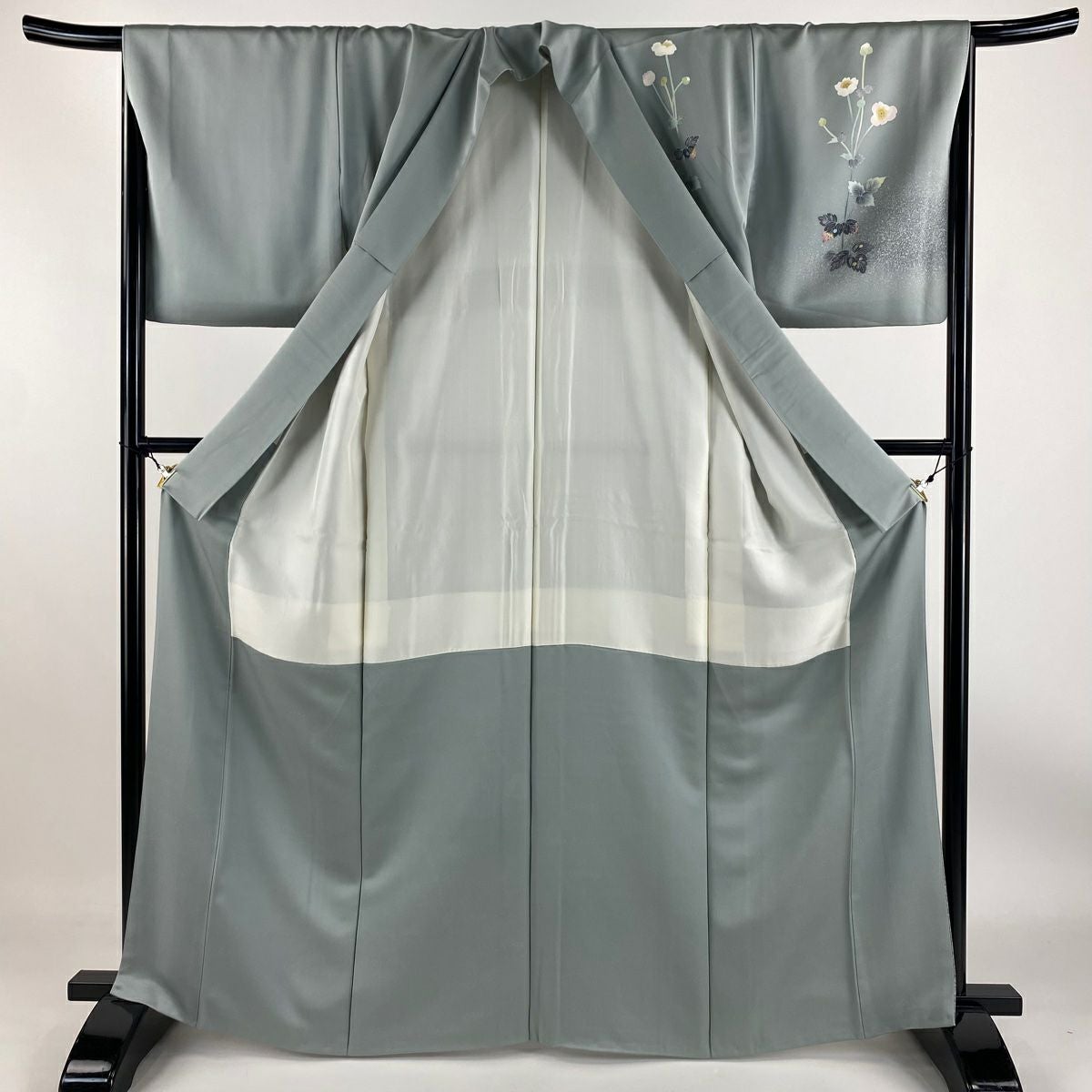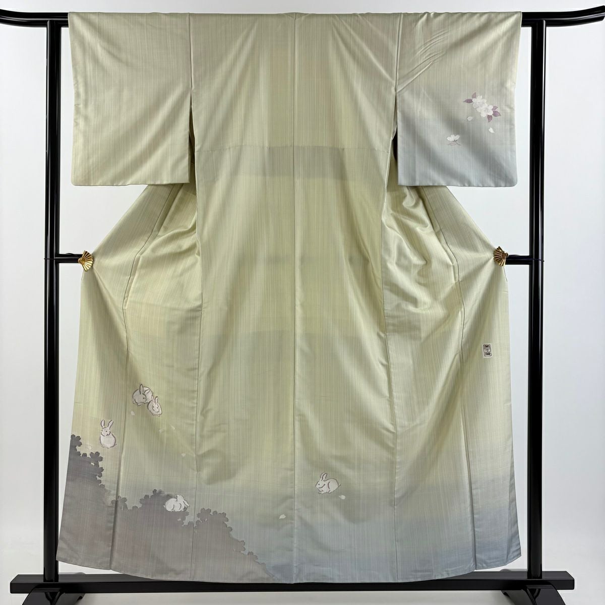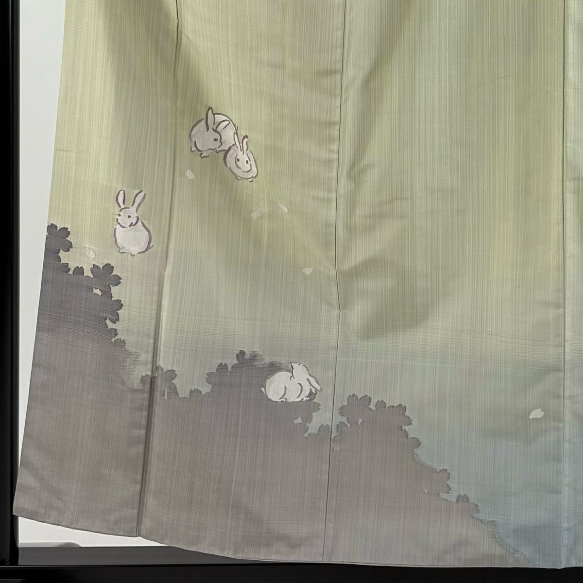 付け下げは訪問着を簡略化した訪問着より格が低くで小紋より格の高いの着物です。 特徴としては仕立て方の違いから訪問着などの一度真っさらな反物を着物の形に仮仕立てした後に柄付けをする絵羽模様とは違い、反物の状態で着用した時に柄付けが全て上を向くように書く事により左右の身頃や肩から袖にかけての模様が繋がっていない事です。 付け下げの歴史は他の着物に比べ浅く、戦時下に華美な訪問着が禁止された事で生まれた着物で、その後訪問着に比べ比較的安価で、それでいて着用シーンも訪問着とほぼ変わらないため大変好評になり、付け下げ訪問着と呼ばれる華やかな柄付けのものも考案された事により普及していきました。