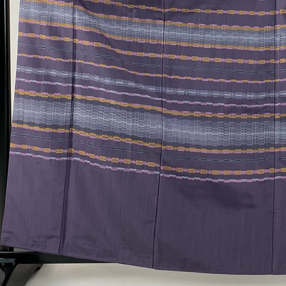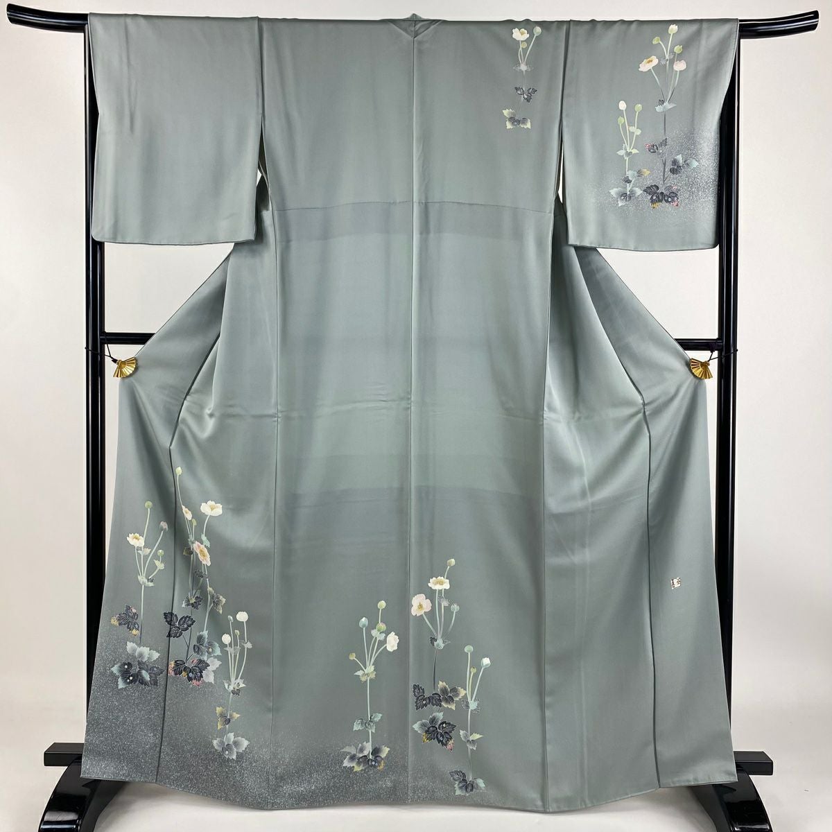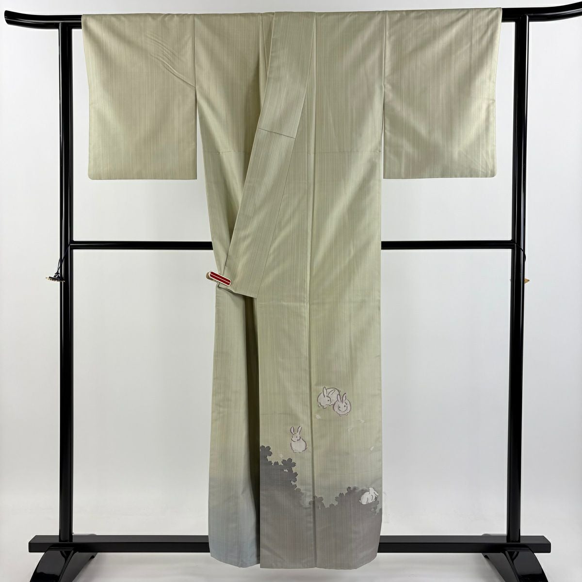 付け下げは訪問着を簡略化した訪問着より格が低くで小紋より格の高いの着物です。 特徴としては仕立て方の違いから訪問着などの一度真っさらな反物を着物の形に仮仕立てした後に柄付けをする絵羽模様とは違い、反物の状態で着用した時に柄付けが全て上を向くように書く事により左右の身頃や肩から袖にかけての模様が繋がっていない事です。 付け下げの歴史は他の着物に比べ浅く、戦時下に華美な訪問着が禁止された事で生まれた着物で、その後訪問着に比べ比較的安価で、それでいて着用シーンも訪問着とほぼ変わらないため大変好評になり、付け下げ訪問着と呼ばれる華やかな柄付けのものも考案された事により普及していきました。