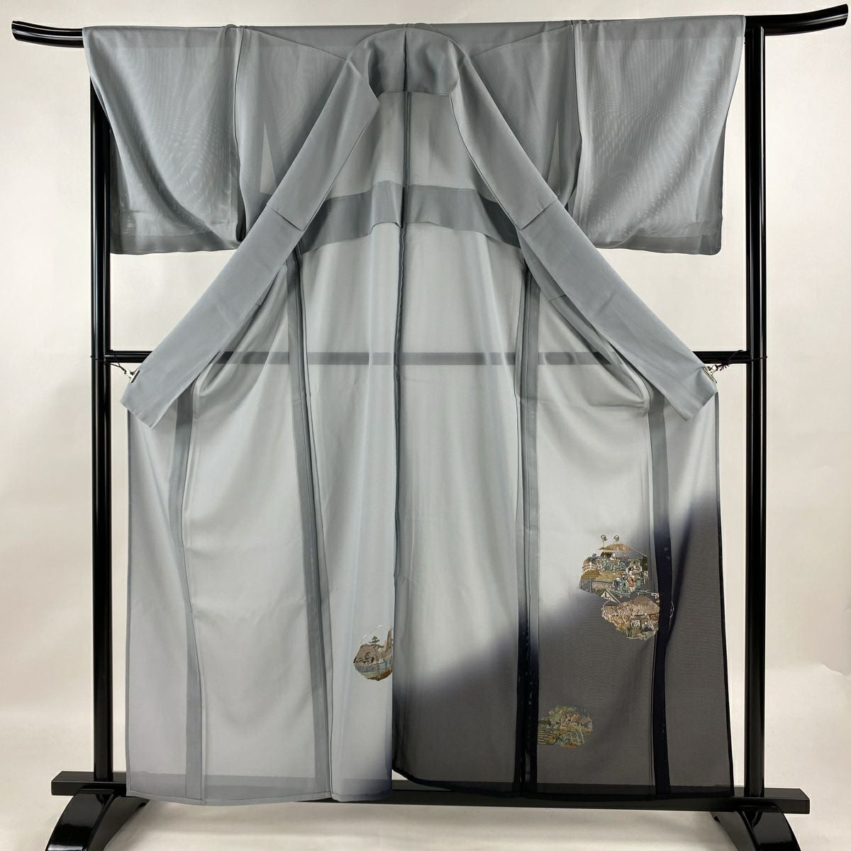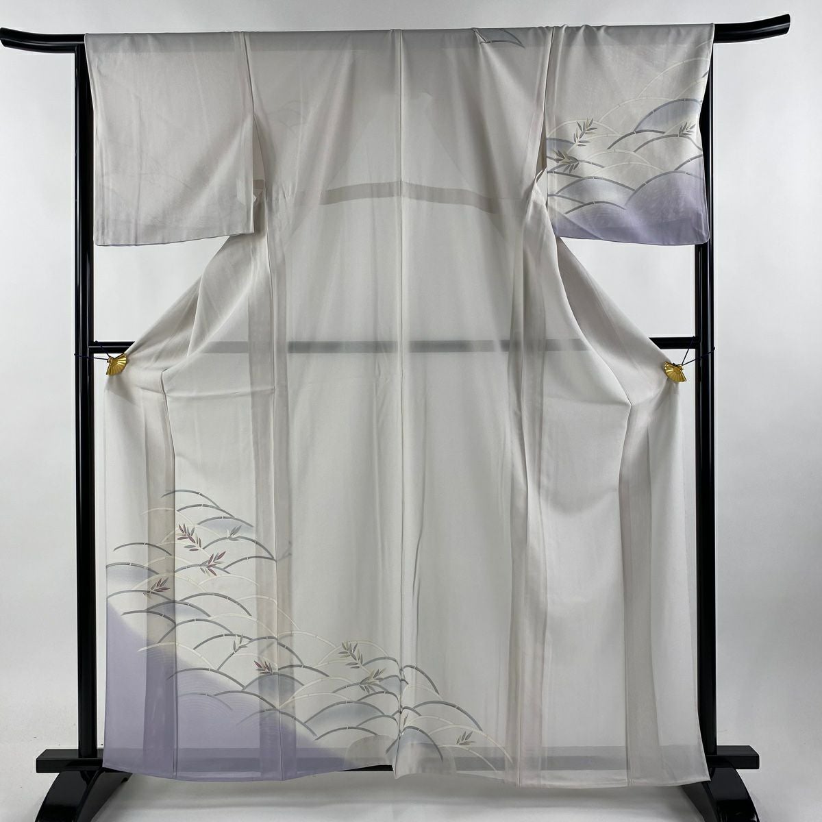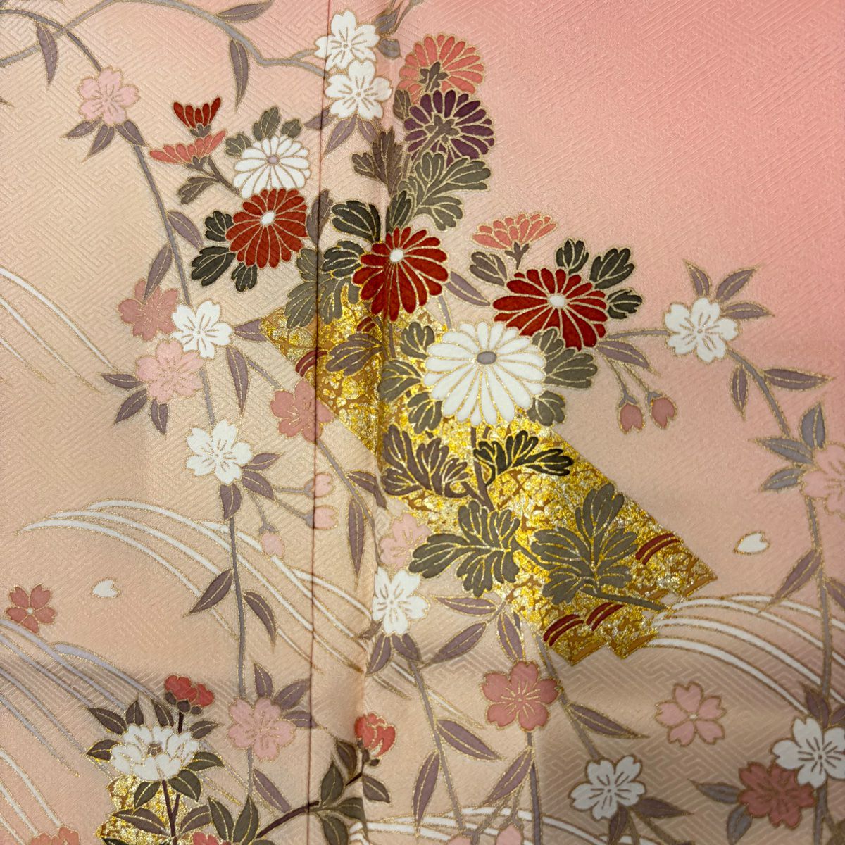 付け下げは訪問着を簡略化した訪問着より格が低くで小紋より格の高いの着物です。 特徴としては仕立て方の違いから訪問着などの一度真っさらな反物を着物の形に仮仕立てした後に柄付けをする絵羽模様とは違い、反物の状態で着用した時に柄付けが全て上を向くように書く事により左右の身頃や肩から袖にかけての模様が繋がっていない事です。 付け下げの歴史は他の着物に比べ浅く、戦時下に華美な訪問着が禁止された事で生まれた着物で、その後訪問着に比べ比較的安価で、それでいて着用シーンも訪問着とほぼ変わらないため大変好評になり、付け下げ訪問着と呼ばれる華やかな柄付けのものも考案された事により普及していきました。