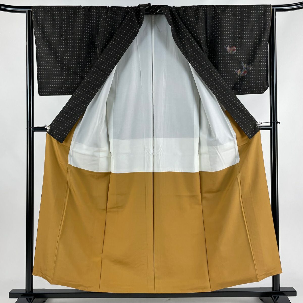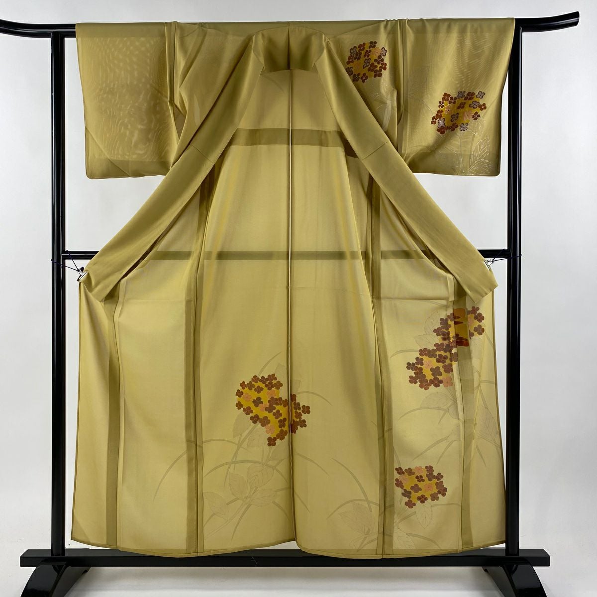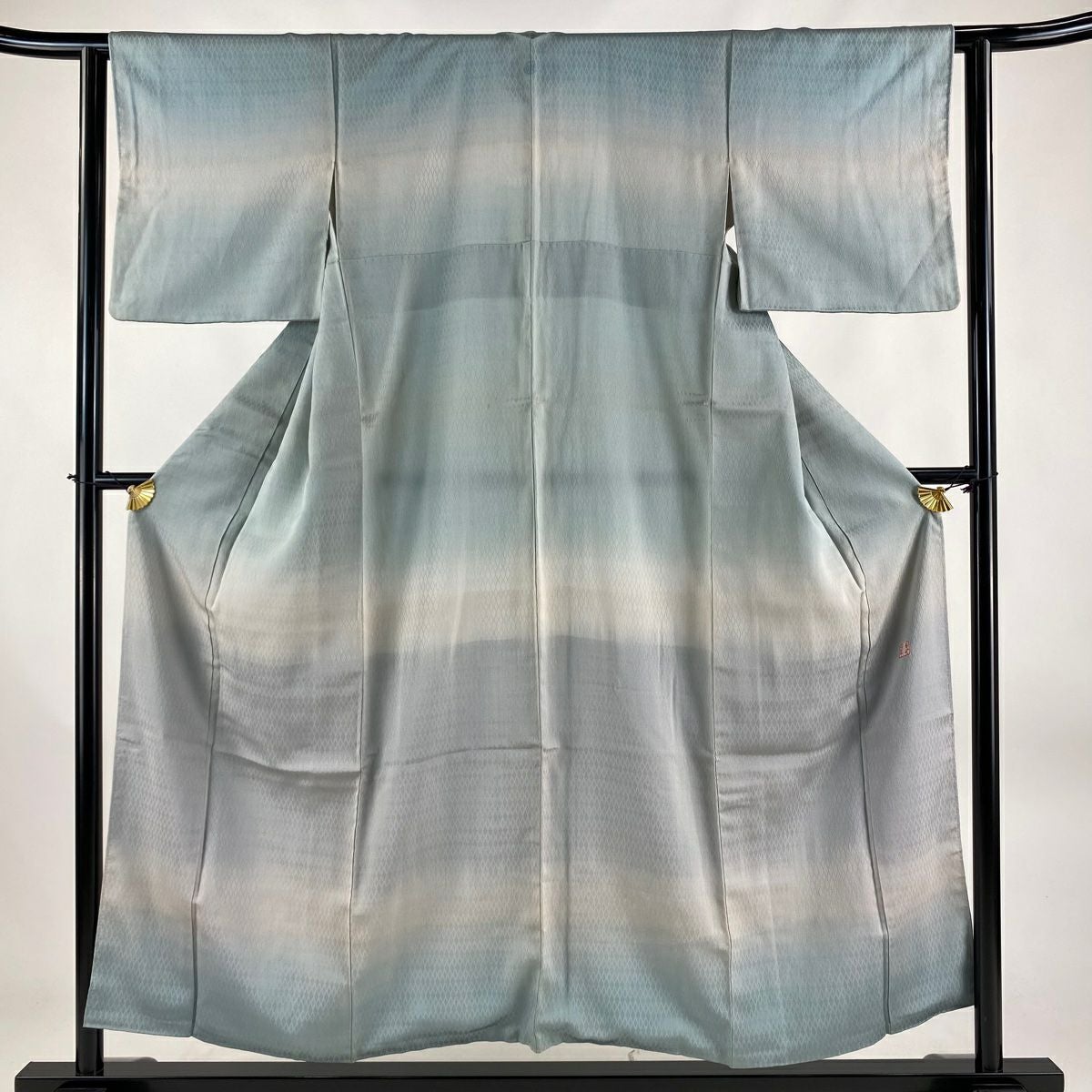 付け下げは訪問着を簡略化した訪問着より格が低くで小紋より格の高いの着物です。 特徴としては仕立て方の違いから訪問着などの一度真っさらな反物を着物の形に仮仕立てした後に柄付けをする絵羽模様とは違い、反物の状態で着用した時に柄付けが全て上を向くように書く事により左右の身頃や肩から袖にかけての模様が繋がっていない事です。 付け下げの歴史は他の着物に比べ浅く、戦時下に華美な訪問着が禁止された事で生まれた着物で、その後訪問着に比べ比較的安価で、それでいて着用シーンも訪問着とほぼ変わらないため大変好評になり、付け下げ訪問着と呼ばれる華やかな柄付けのものも考案された事により普及していきました。