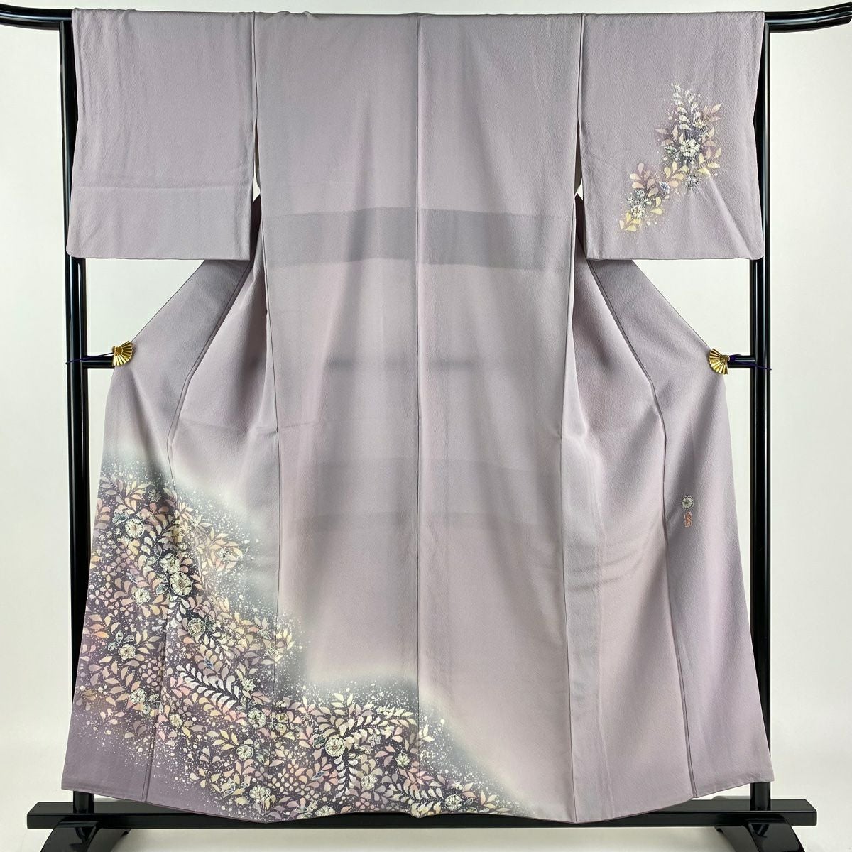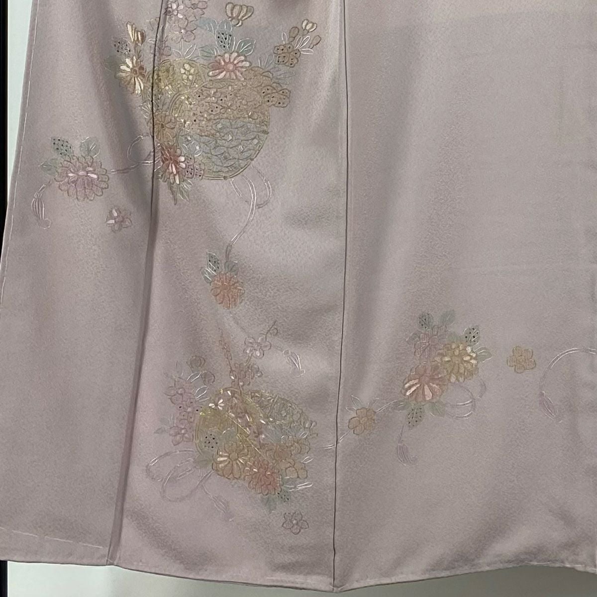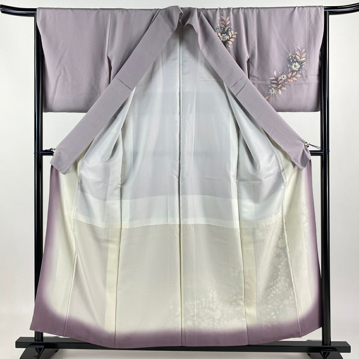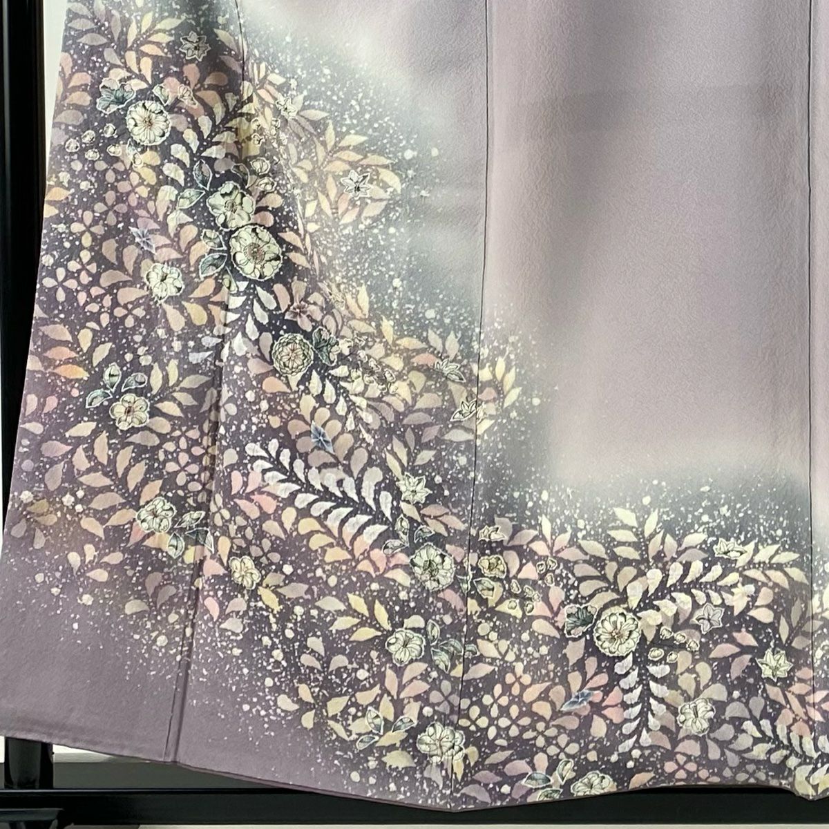 付け下げは訪問着を簡略化した訪問着より格が低くで小紋より格の高いの着物です。 特徴としては仕立て方の違いから訪問着などの一度真っさらな反物を着物の形に仮仕立てした後に柄付けをする絵羽模様とは違い、反物の状態で着用した時に柄付けが全て上を向くように書く事により左右の身頃や肩から袖にかけての模様が繋がっていない事です。 付け下げの歴史は他の着物に比べ浅く、戦時下に華美な訪問着が禁止された事で生まれた着物で、その後訪問着に比べ比較的安価で、それでいて着用シーンも訪問着とほぼ変わらないため大変好評になり、付け下げ訪問着と呼ばれる華やかな柄付けのものも考案された事により普及していきました。