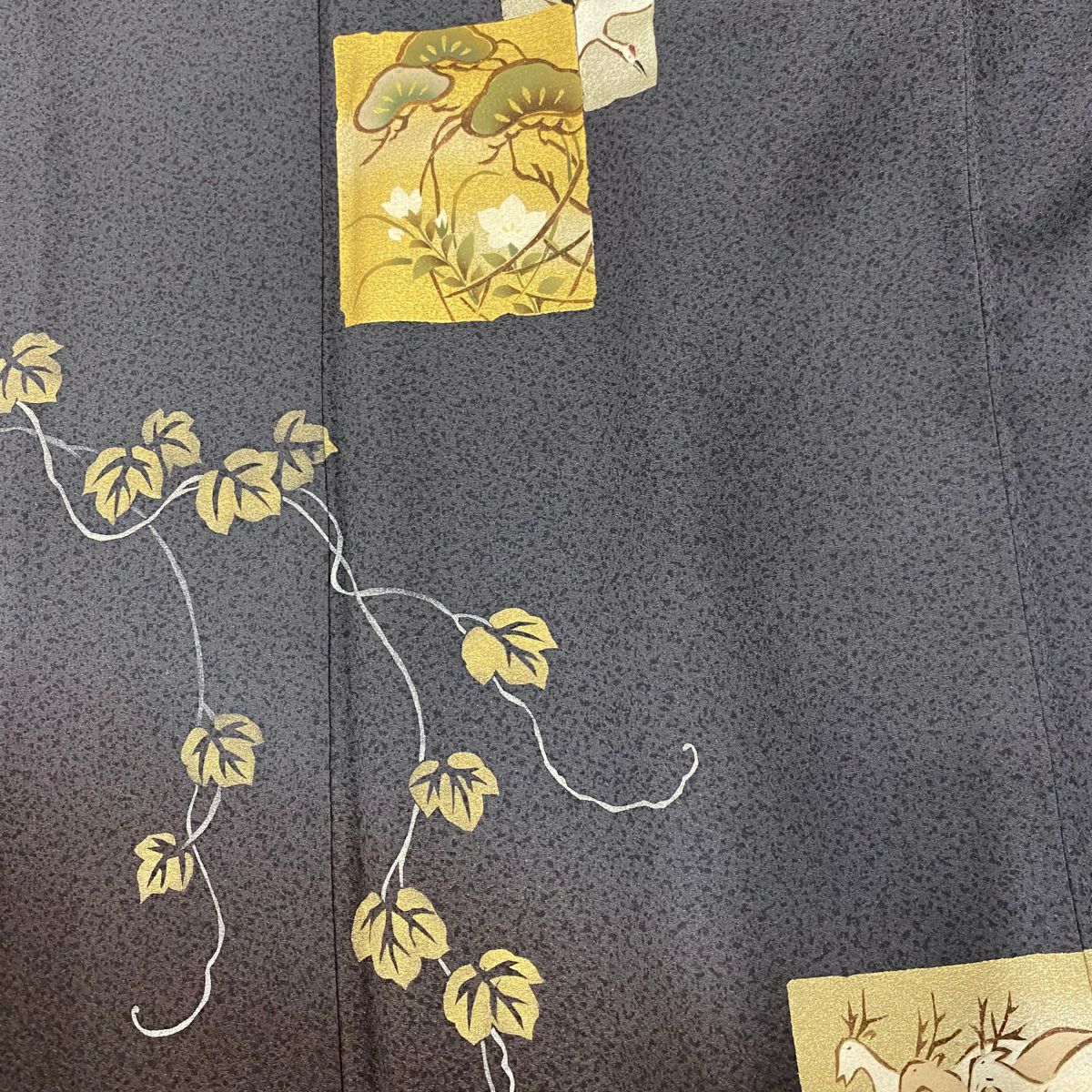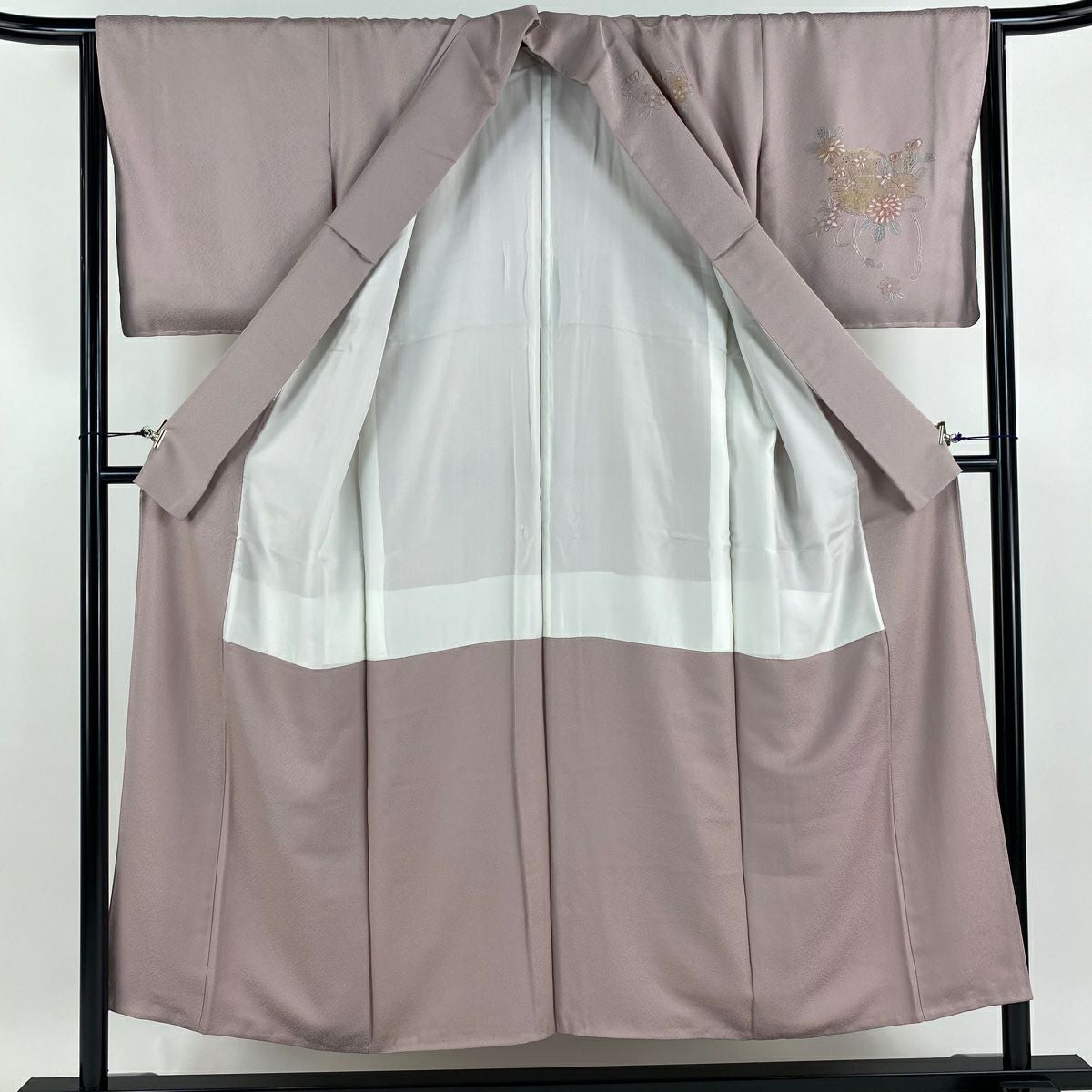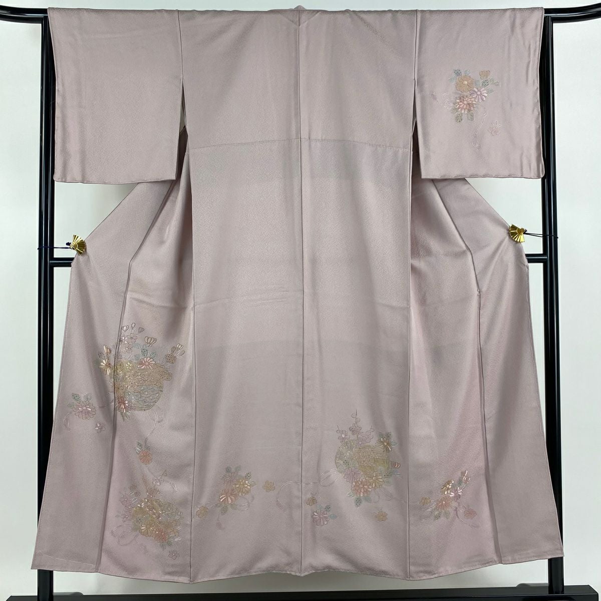 付け下げは訪問着を簡略化した訪問着より格が低くで小紋より格の高いの着物です。 特徴としては仕立て方の違いから訪問着などの一度真っさらな反物を着物の形に仮仕立てした後に柄付けをする絵羽模様とは違い、反物の状態で着用した時に柄付けが全て上を向くように書く事により左右の身頃や肩から袖にかけての模様が繋がっていない事です。 付け下げの歴史は他の着物に比べ浅く、戦時下に華美な訪問着が禁止された事で生まれた着物で、その後訪問着に比べ比較的安価で、それでいて着用シーンも訪問着とほぼ変わらないため大変好評になり、付け下げ訪問着と呼ばれる華やかな柄付けのものも考案された事により普及していきました。