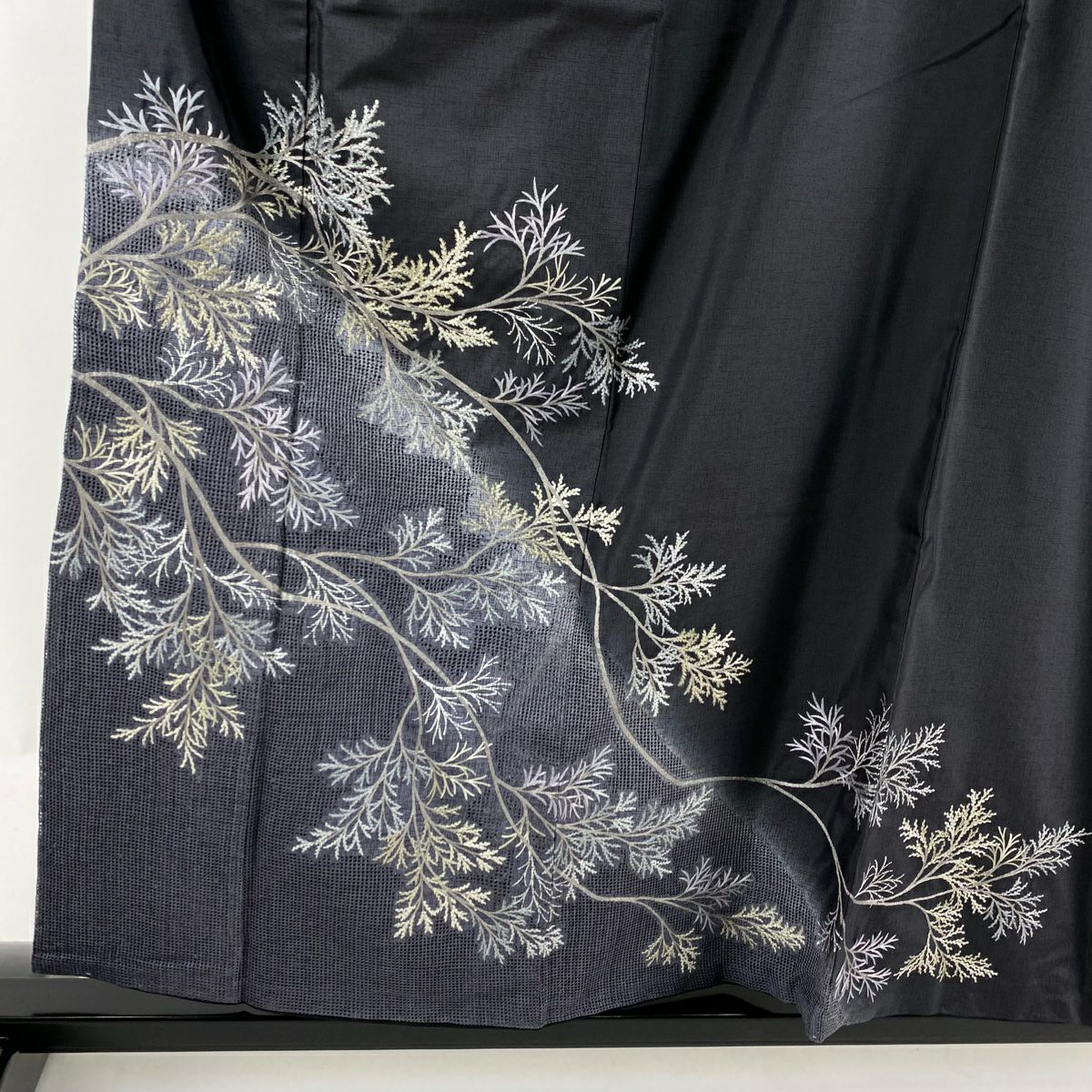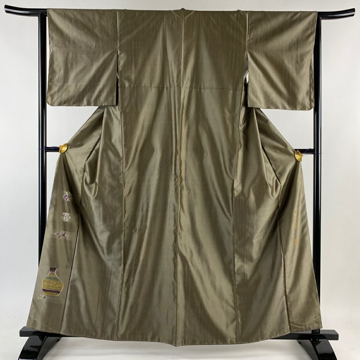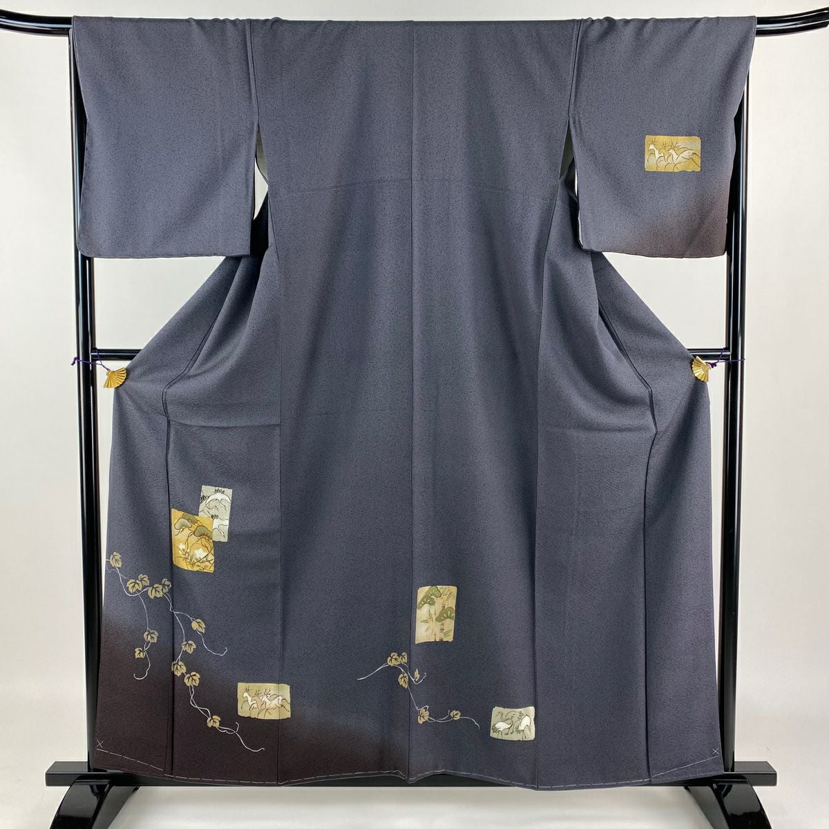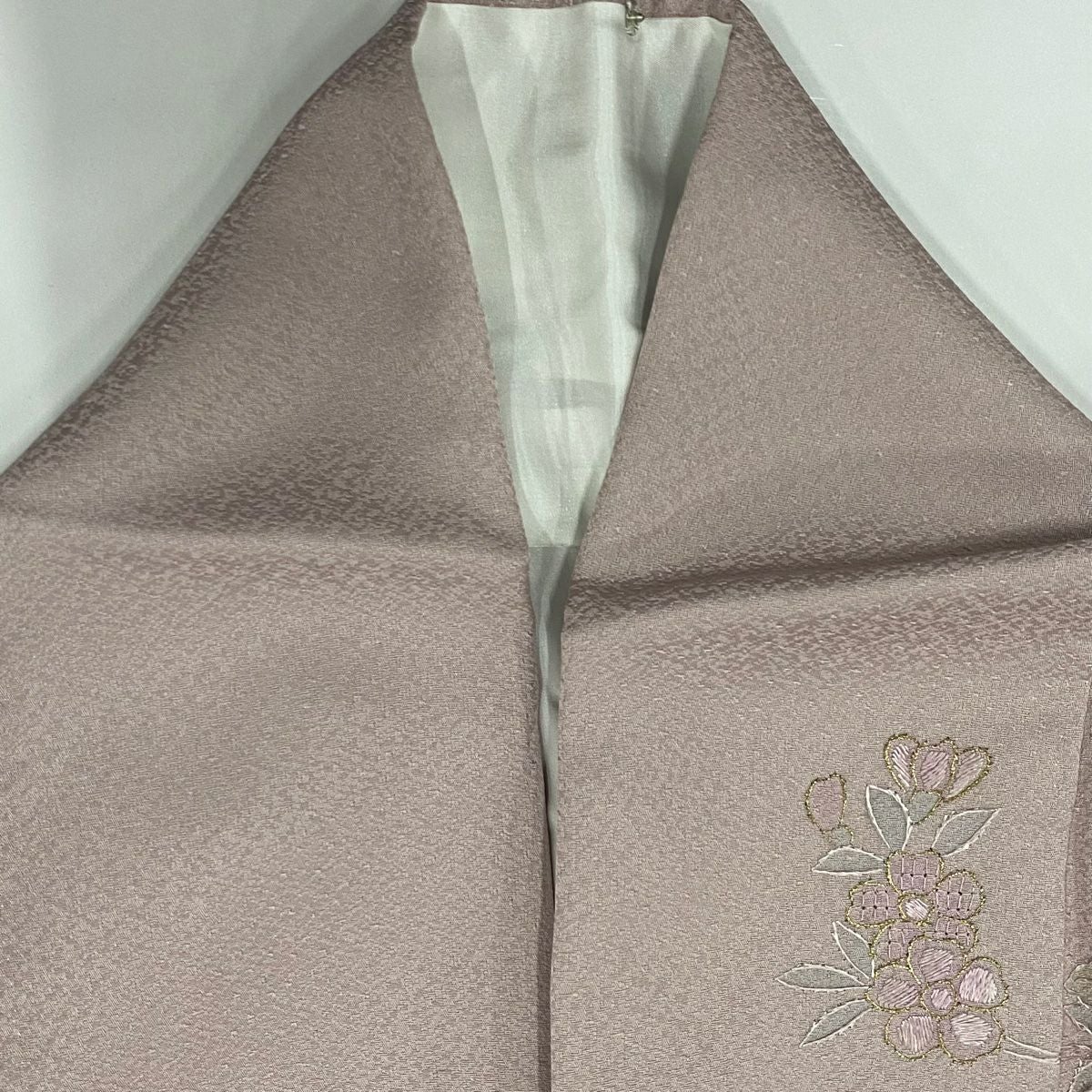 付け下げは訪問着を簡略化した訪問着より格が低くで小紋より格の高いの着物です。 特徴としては仕立て方の違いから訪問着などの一度真っさらな反物を着物の形に仮仕立てした後に柄付けをする絵羽模様とは違い、反物の状態で着用した時に柄付けが全て上を向くように書く事により左右の身頃や肩から袖にかけての模様が繋がっていない事です。 付け下げの歴史は他の着物に比べ浅く、戦時下に華美な訪問着が禁止された事で生まれた着物で、その後訪問着に比べ比較的安価で、それでいて着用シーンも訪問着とほぼ変わらないため大変好評になり、付け下げ訪問着と呼ばれる華やかな柄付けのものも考案された事により普及していきました。