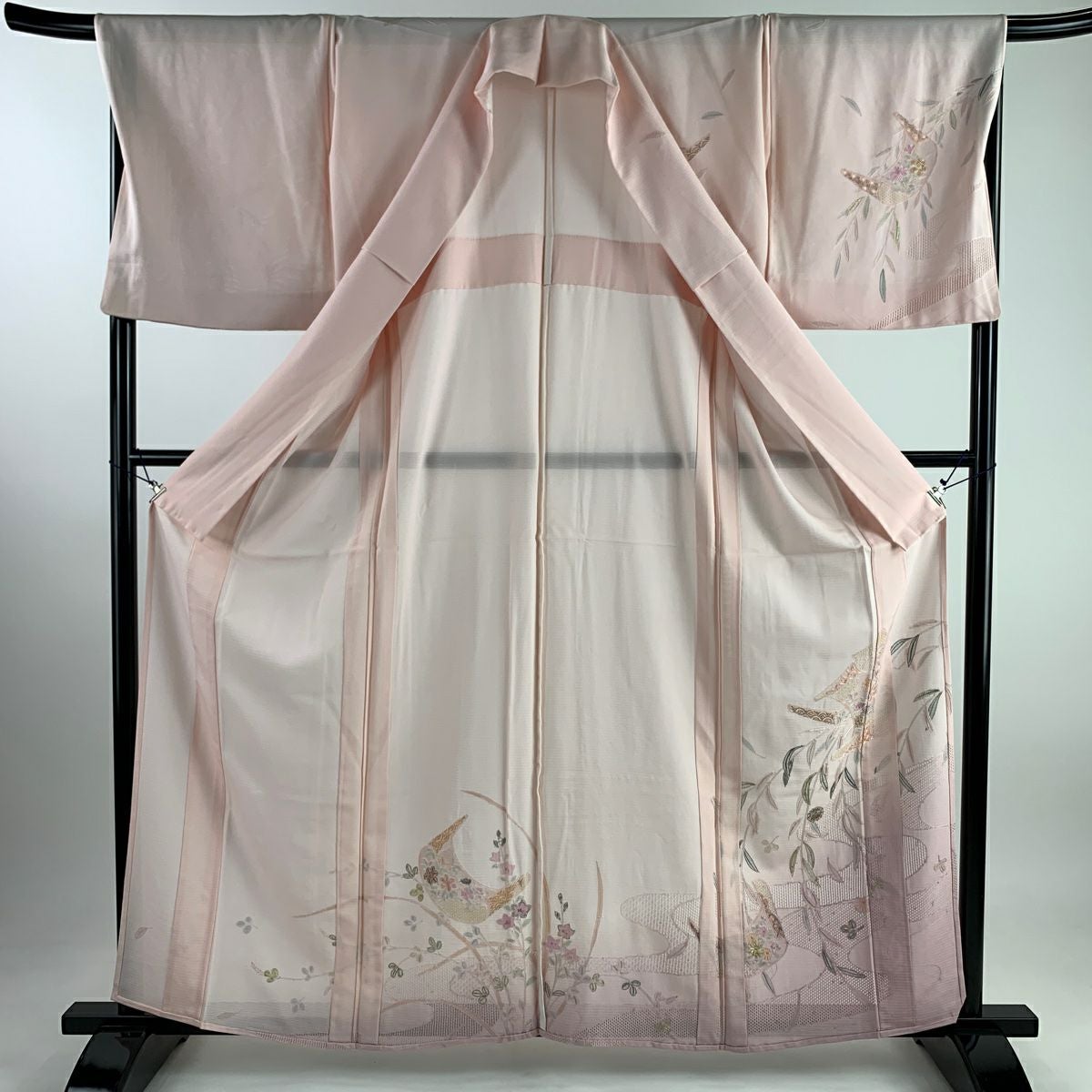 付け下げは訪問着を簡略化した訪問着より格が低くで小紋より格の高いの着物です。 特徴としては仕立て方の違いから訪問着などの一度真っさらな反物を着物の形に仮仕立てした後に柄付けをする絵羽模様とは違い、反物の状態で着用した時に柄付けが全て上を向くように書く事により左右の身頃や肩から袖にかけての模様が繋がっていない事です。 付け下げの歴史は他の着物に比べ浅く、戦時下に華美な訪問着が禁止された事で生まれた着物で、その後訪問着に比べ比較的安価で、それでいて着用シーンも訪問着とほぼ変わらないため大変好評になり、付け下げ訪問着と呼ばれる華やかな柄付けのものも考案された事により普及していきました。