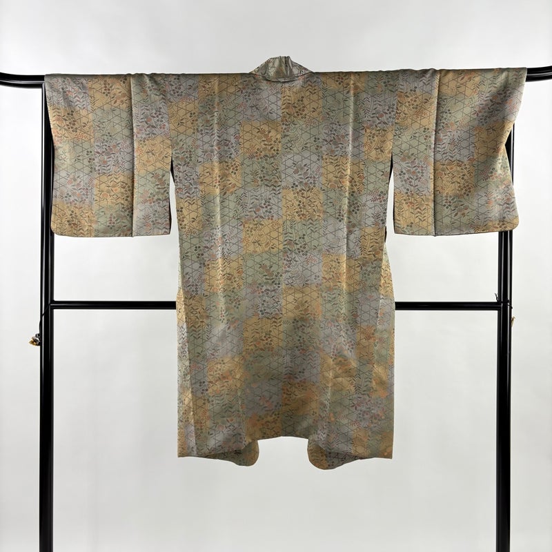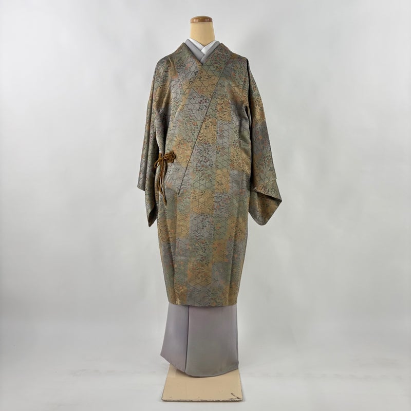 【道中着】 灰色系 灰緑 秀品 A 約101cm~約110cm 裄丈67cm-68cm (L)size 袖丈47cm 9990-29990 美品 二万以下