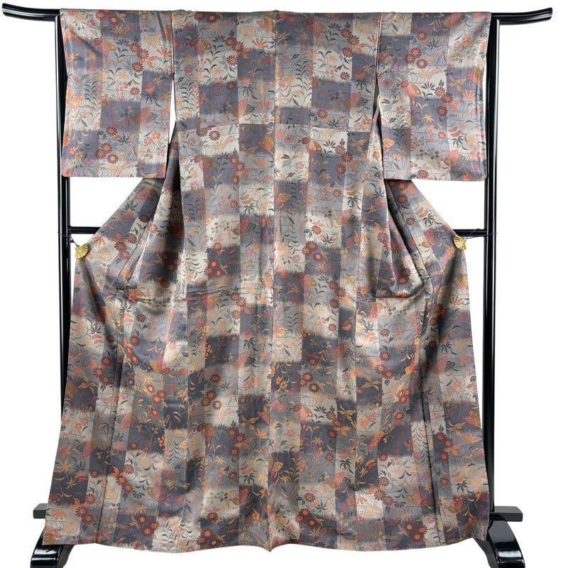 【着物ランク】名品 【素材】正絹 【身丈】約168cm 【裄丈】約64cm 【袖丈】約51.5cm 【袖幅】約32.5cm 【前幅】約27cm 【後幅】約30.5cm 【サイズ】M 【着物仕立て】袷 【着用時期】10~5月 【状態ランク】ランクB 【着物着用シーン】気軽なパーティー、観劇、食事会、正月、気軽なお茶会、街着