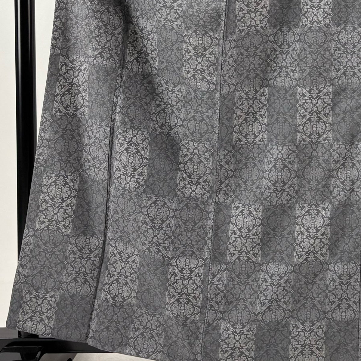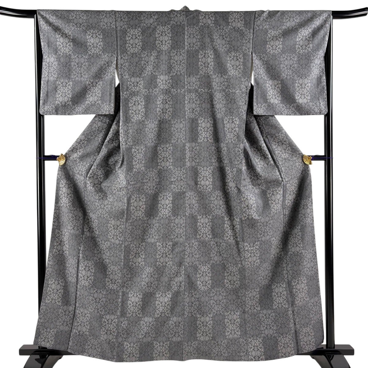 お召 身丈159cm 裄丈62cm S 単衣 唐草 亀甲絣 黒灰 正絹 秀品