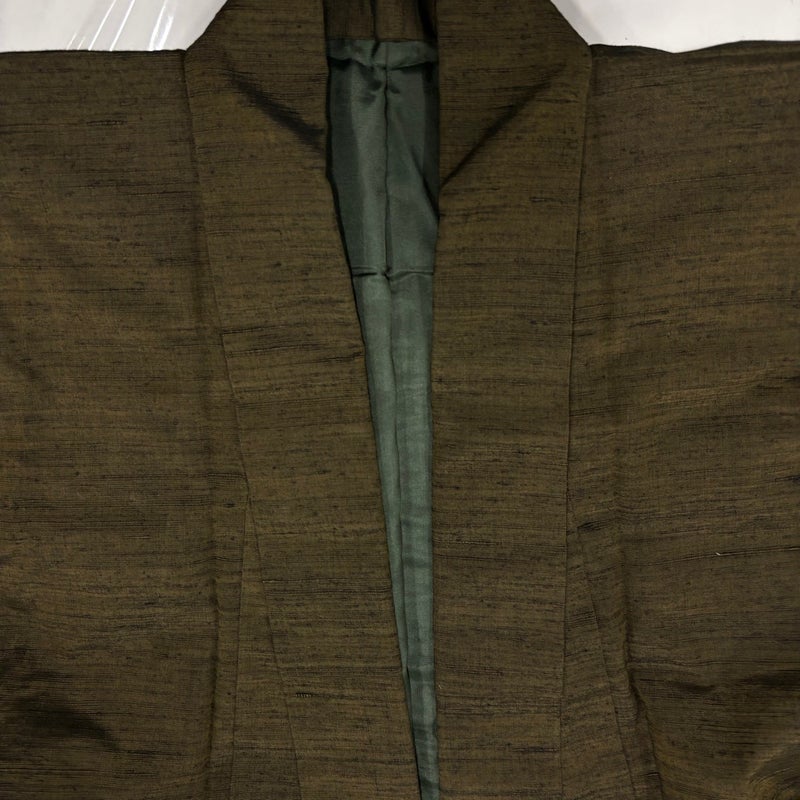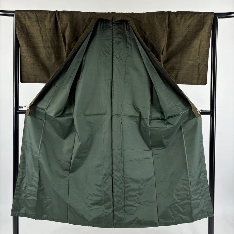 【男着物】 茶系 茶緑色 秀品 A 約140cm~約149cm 裄丈67cm-68cm (M)size 袖丈49cm 7990-9980 美品 二万以下