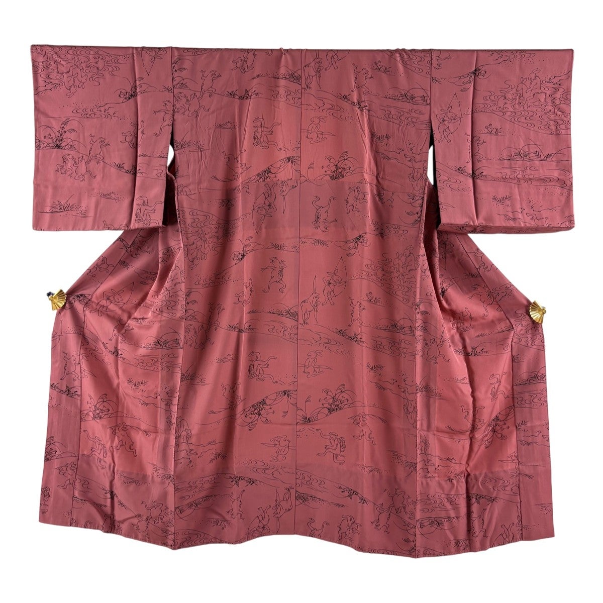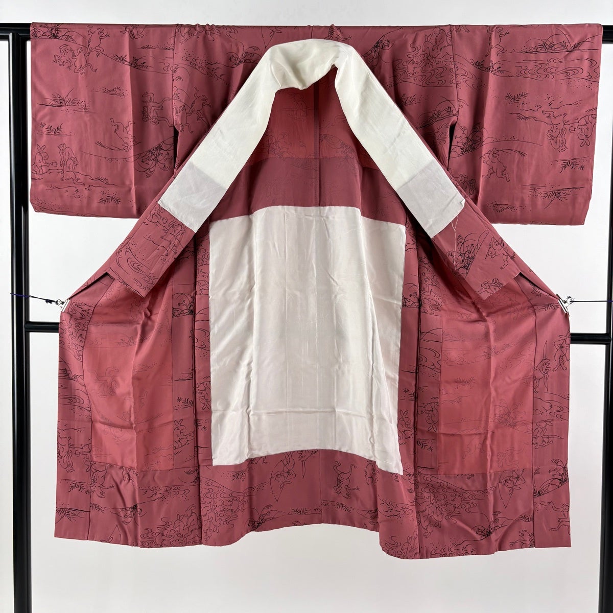 【美品】 長襦袢 身丈125.5cm 裄丈66.5cm M 狛犬 うさぎ 金彩 黄土色 正絹 秀品