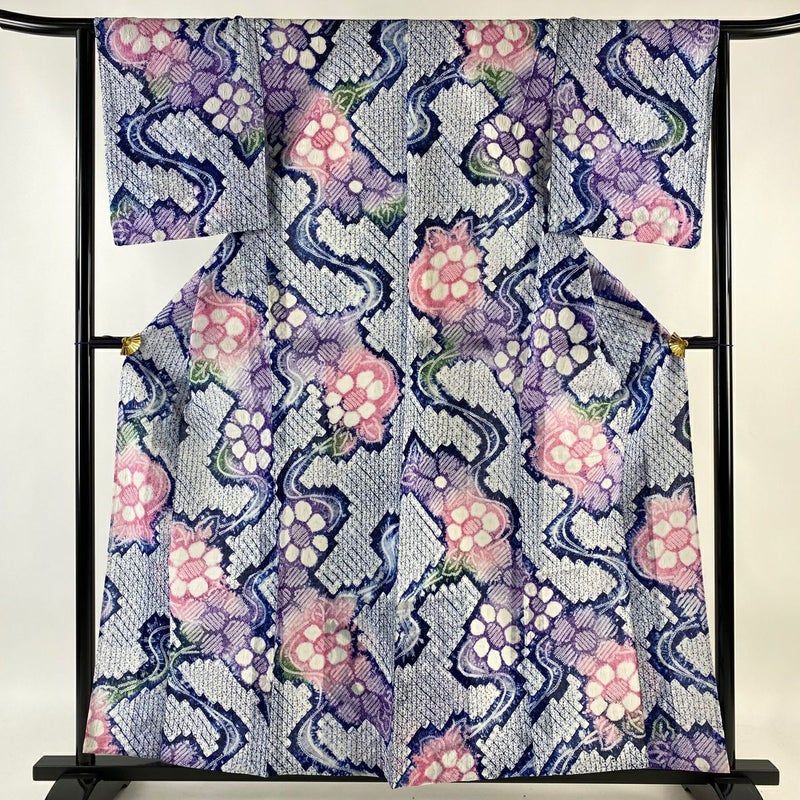 【浴衣】 青系 紺色 名品 A 約150cm~約159cm 裄丈63cm-64cm (M)size 袖丈49cm 9990-29990 美品 五万以下