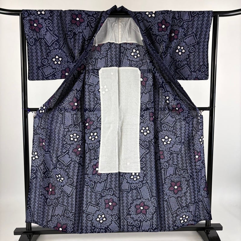 夏のお洒落着として、夏祭りや花火大会、盆踊りなど多くの場面でお召し頂ける夏の定番浴衣です。 小物をアレンジすることで何通りにも着こなすことが出来る一品です。 ※身丈・裄丈の縫込みの長さは測っておりません。 表地所々絞り部分と下前にシミがございます。 居敷当てに小さなシミがございます。 リユース品としては目立った染み傷なく、状態の良いお品でございます。 ※なお、厳しく商品の状態確認を行っておりますが、記載の汚れ以外にも見落とし箇所がある可能性がある旨ご了承いただけますと幸いです。 沢山の商品の中からご覧いただき誠にありがとうございます。