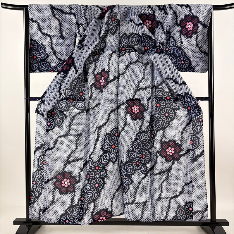 夏のお洒落着として、夏祭りや花火大会、盆踊りなど多くの場面でお召し頂ける夏の定番浴衣です。 小物をアレンジすることで何通りにも着こなすことが出来る一品です。 ※身丈・裄丈の縫込みの長さは測っておりません。 表地所々に薄ヤケ、左胸に薄いシミ、右衿に色移りがございます。 裏地所々に薄ヤケがございます。 リユース品としては目立った染み傷なく、状態の良いお品でございます。 ※なお、厳しく商品の状態確認を行っておりますが、記載の汚れ以外にも見落とし箇所がある可能性がある旨ご了承いただけますと幸いです。 沢山の商品の中からご覧いただき誠にありがとうございます。