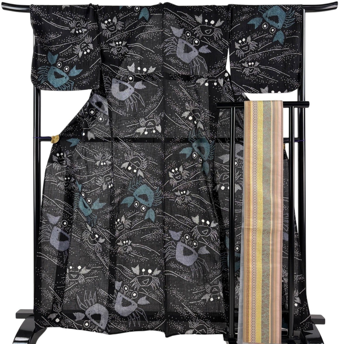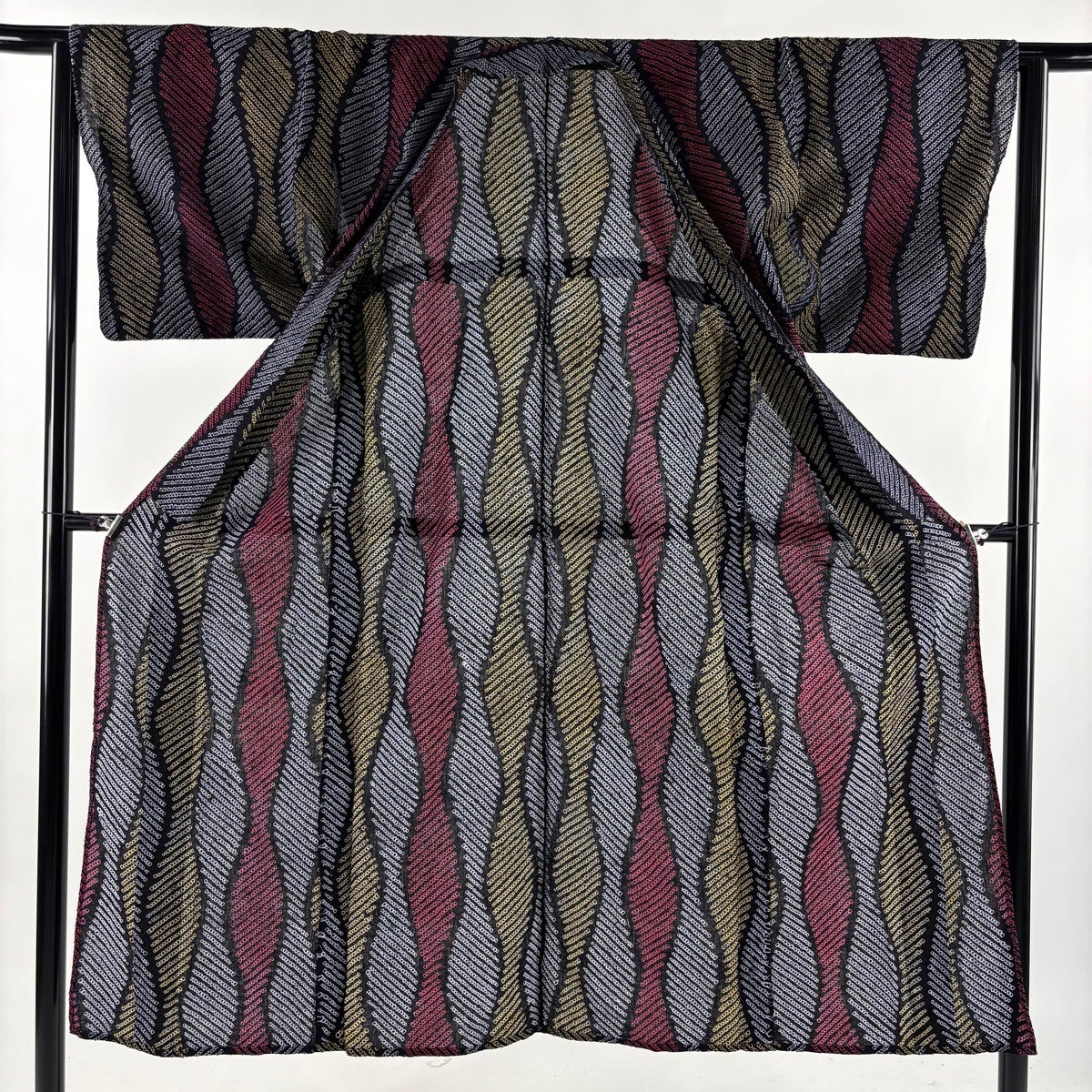 【美品】浴衣 身丈156cm 裄丈64cm M 絞り浴衣 半幅帯セット よろけ縞 紺色 麻 名品
