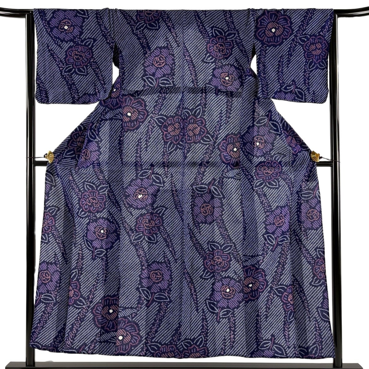 【美品】 浴衣 身丈162cm 裄丈68.5cm L 絞り浴衣 草花 霞 濃紫 綿 名品