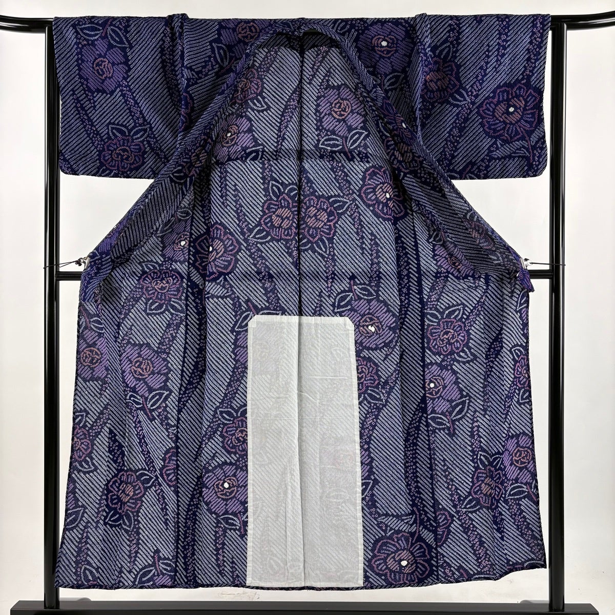 【美品】 浴衣 身丈150cm 裄丈66.5cm M 草花 斜縞 紺色 綿 名品