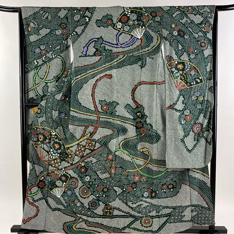 【振袖】 緑系 深緑 名品 B 約150cm~約159cm 裄丈63cm-64cm (S)size 袖丈91cm以上 9990-29990 二万以下