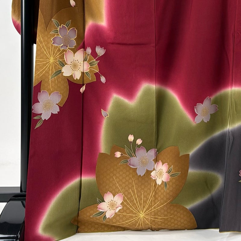 【着物ランク】名品 【素材】正絹 【身丈】約168cm 【裄丈】約69cm 【袖丈】約111.5cm 【袖幅】約36cm 【前幅】約24cm 【後幅】約31cm 【サイズ】L 【着物仕立て】袷 【着用時期】10~5月 【状態ランク】ランクB 【着物着用シーン】成人式、謝恩会